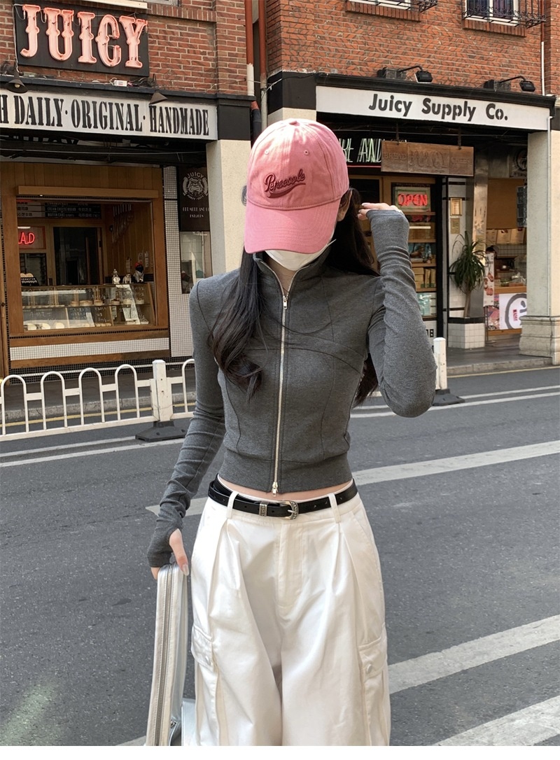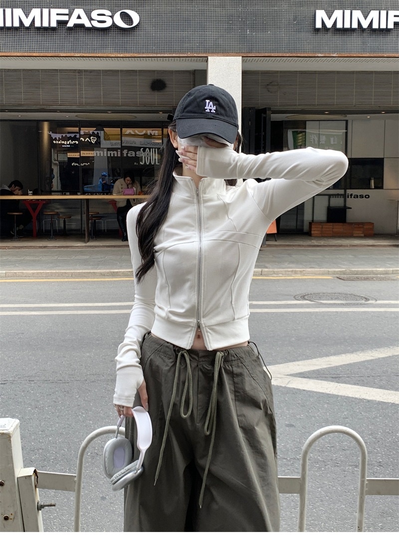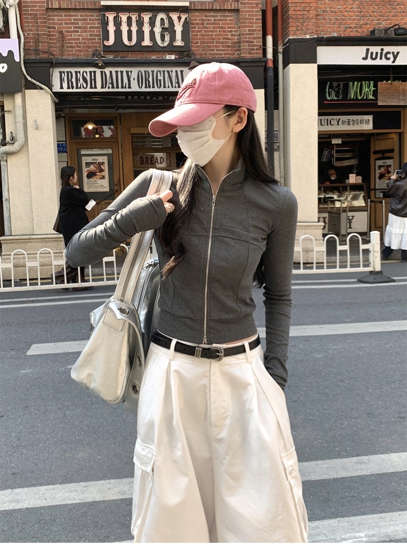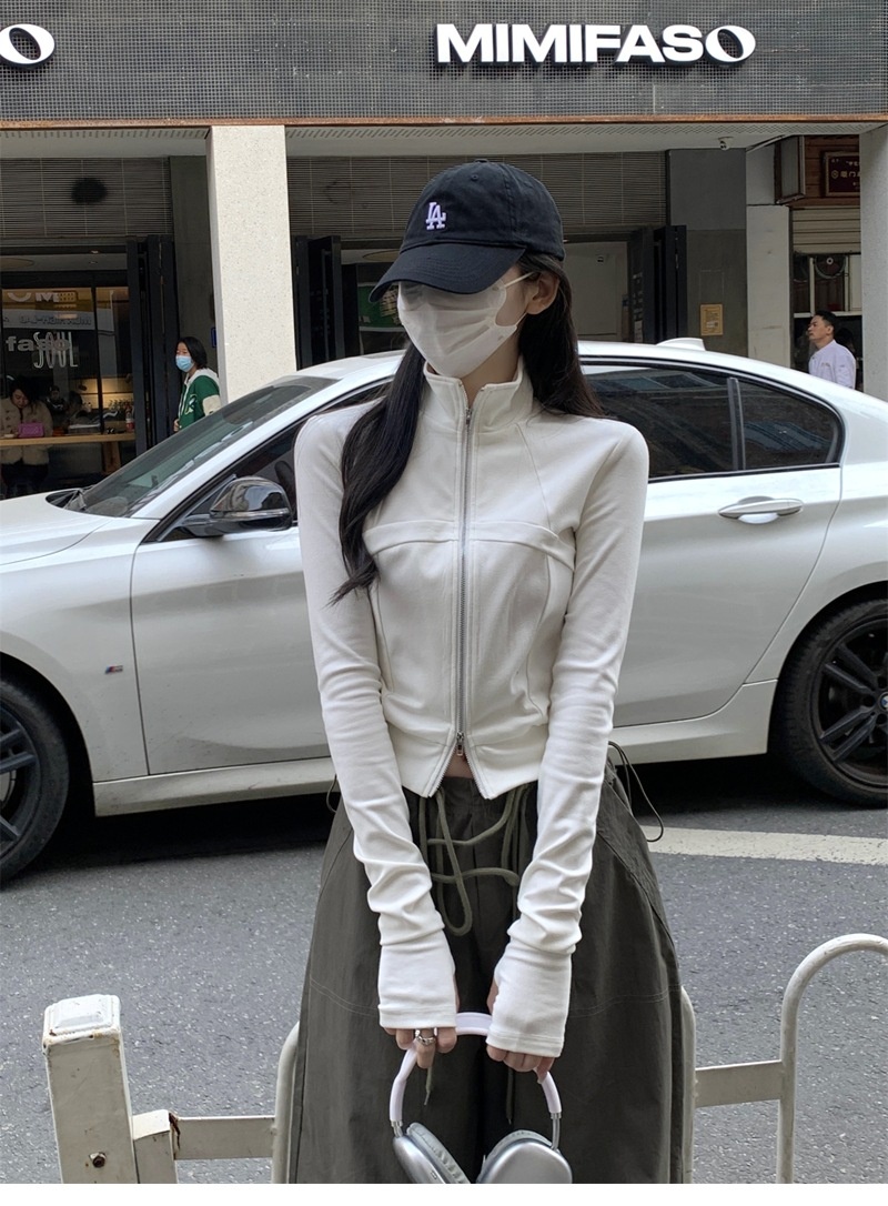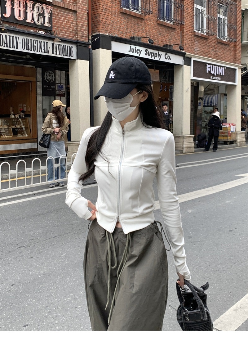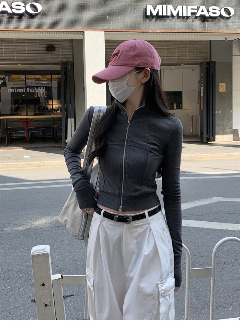 设计感鱼骨拉链长袖开衫T恤外套女早秋新款纯色修身短款德绒上衣