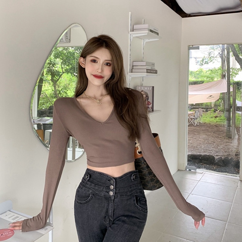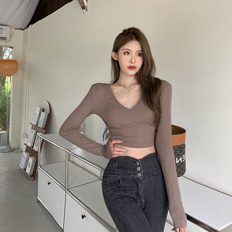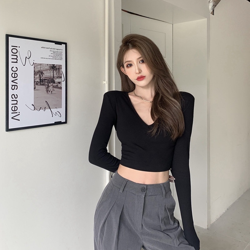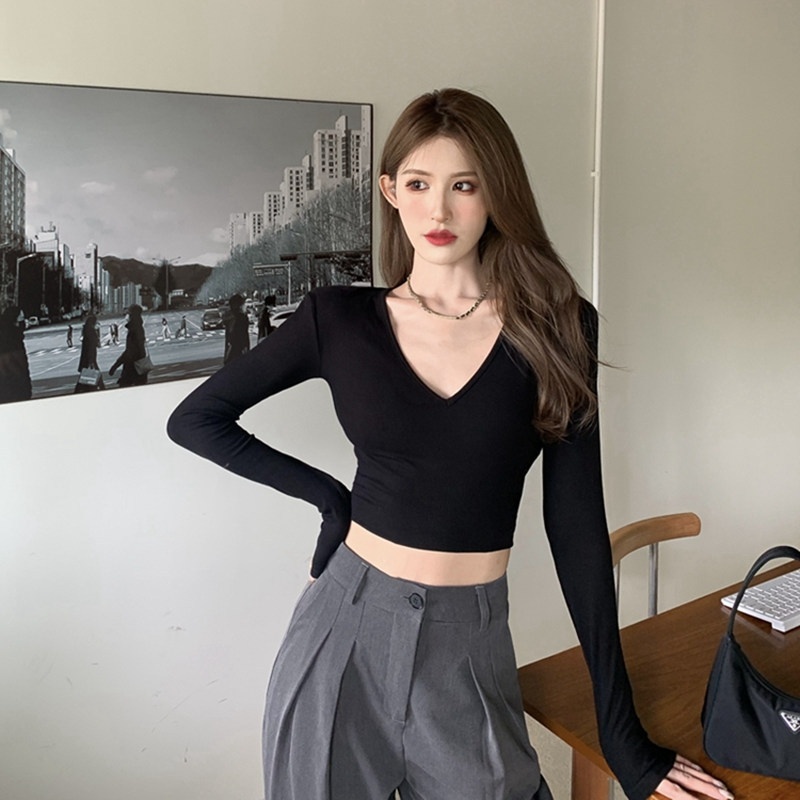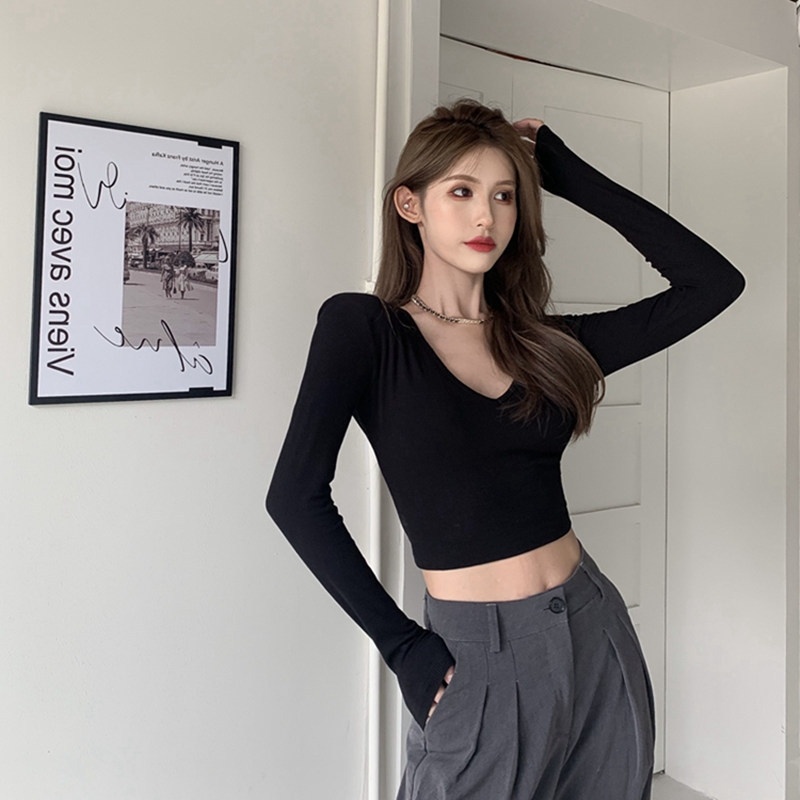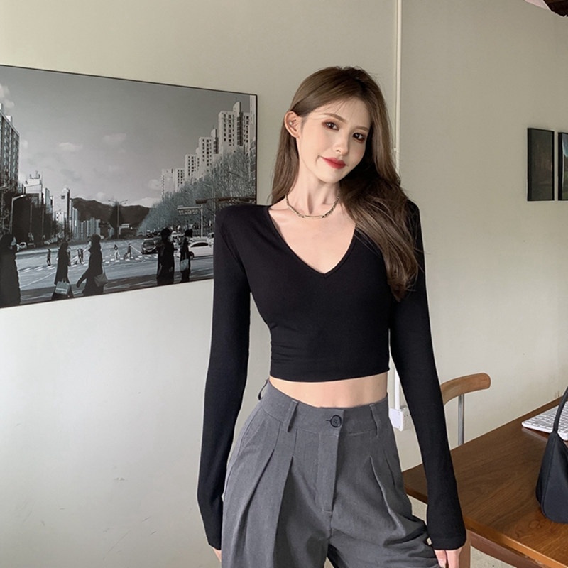 6803#T恤女短款紧身长袖内搭打底衫2022秋季新款性感v领锁骨上衣