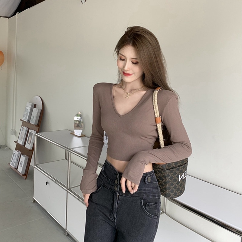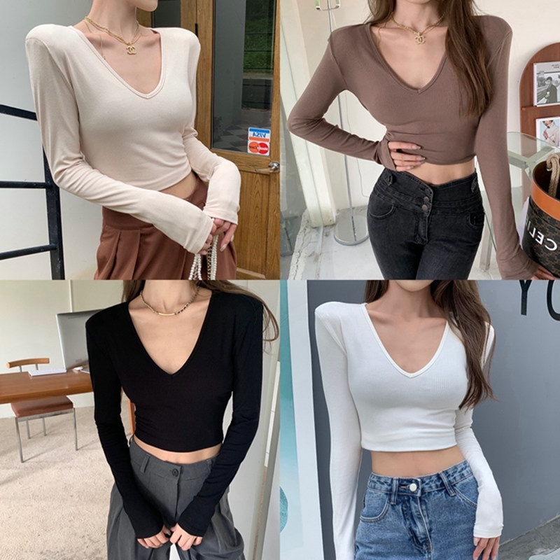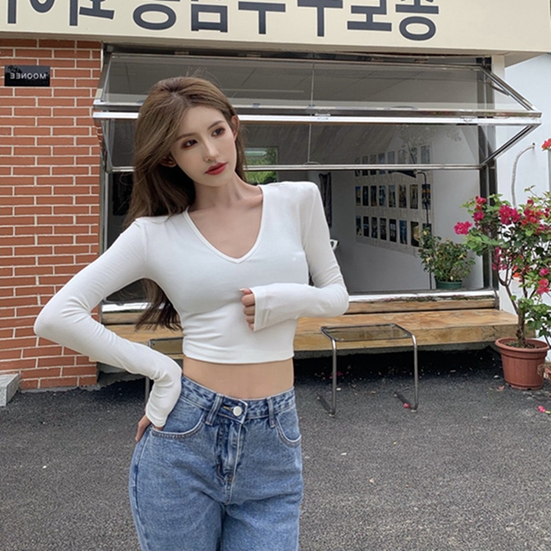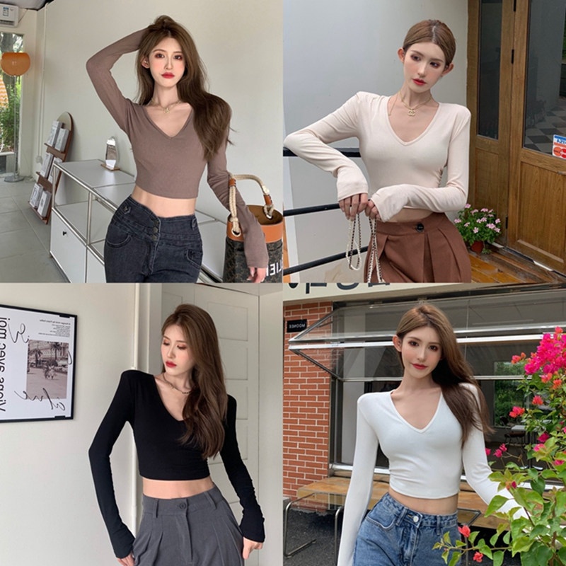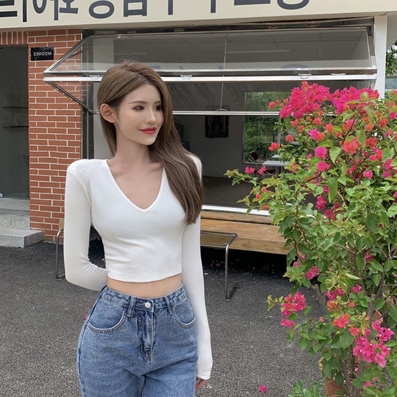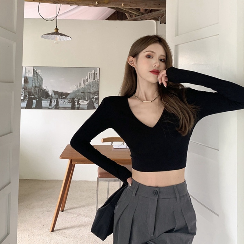 6803#T恤女短款紧身长袖内搭打底衫2022秋季新款性感v领锁骨上衣