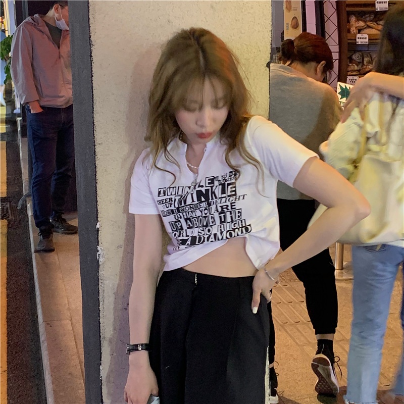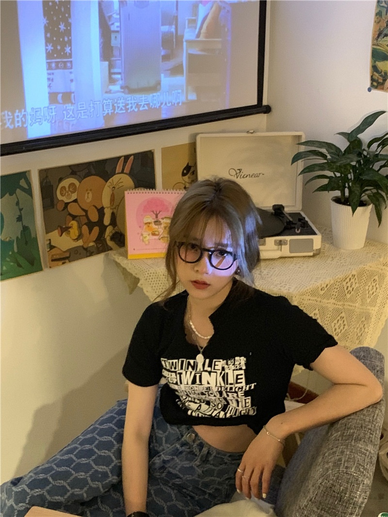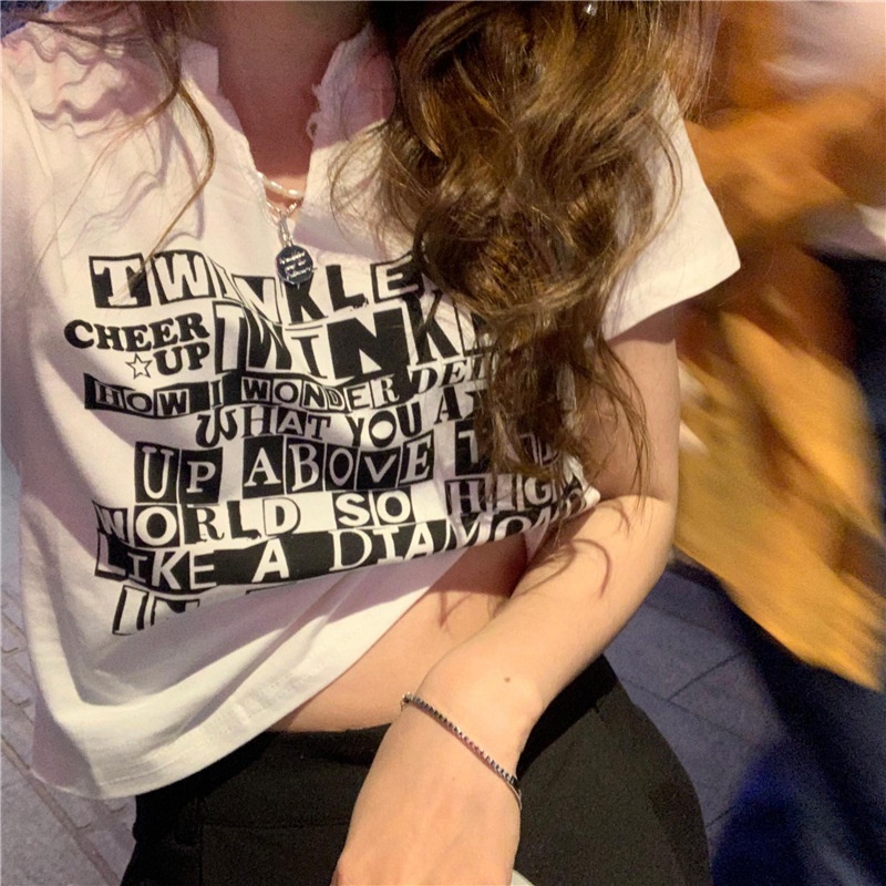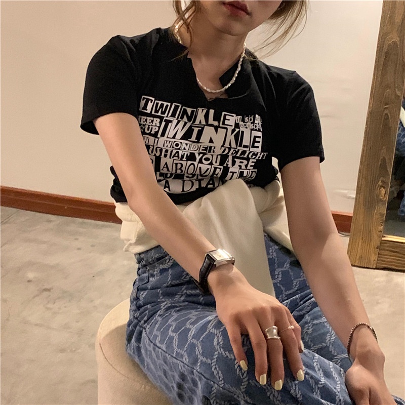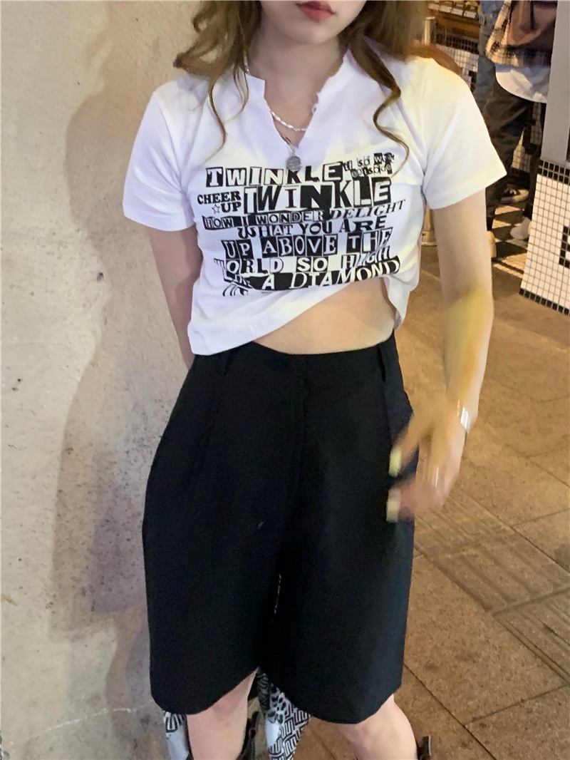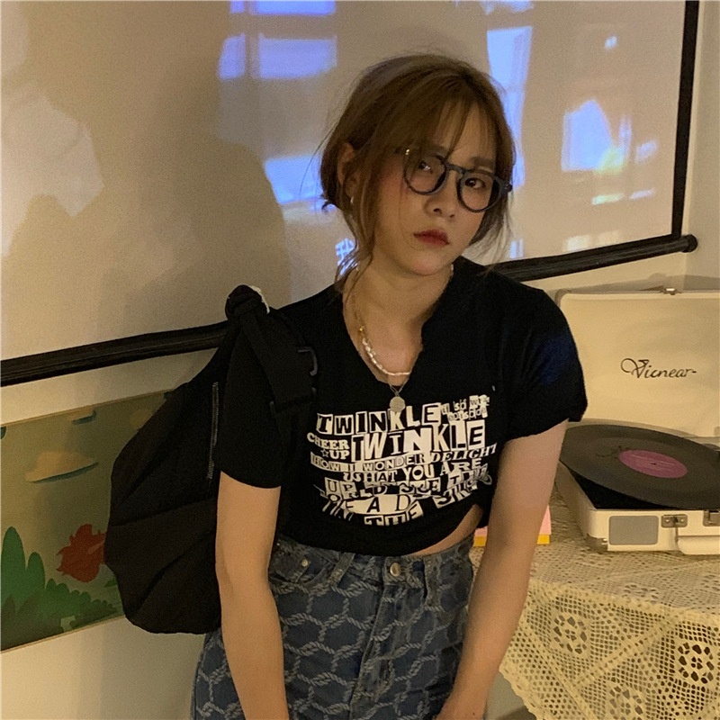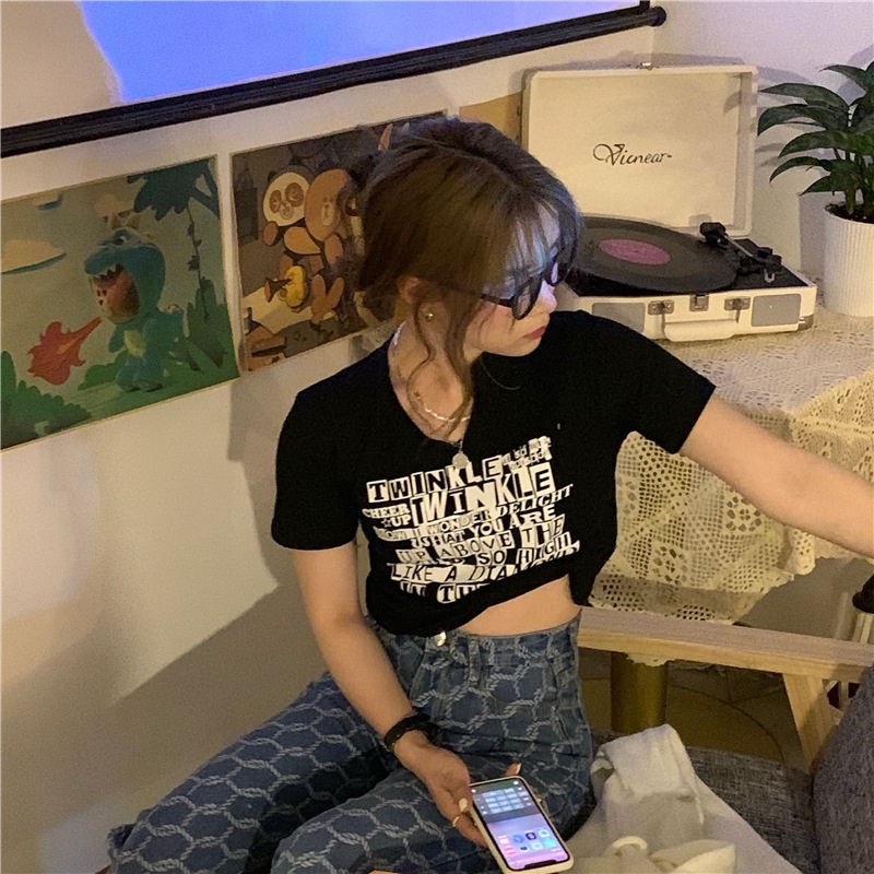 辣妹黑色V领字母印花短袖T恤女设计感2025夏季短款露脐上衣服女潮