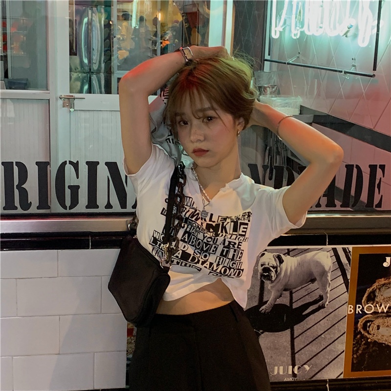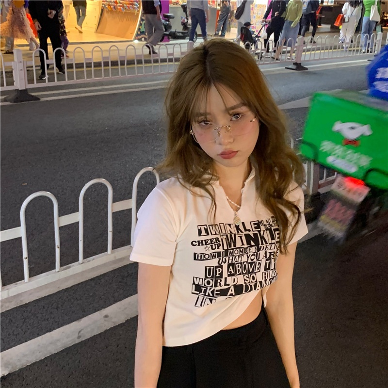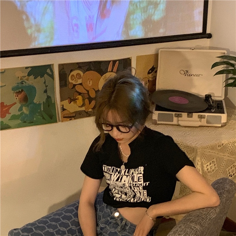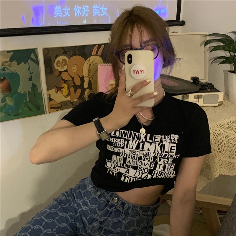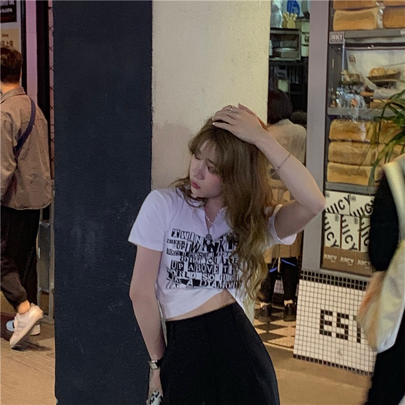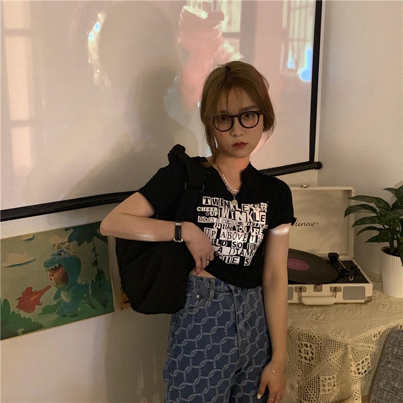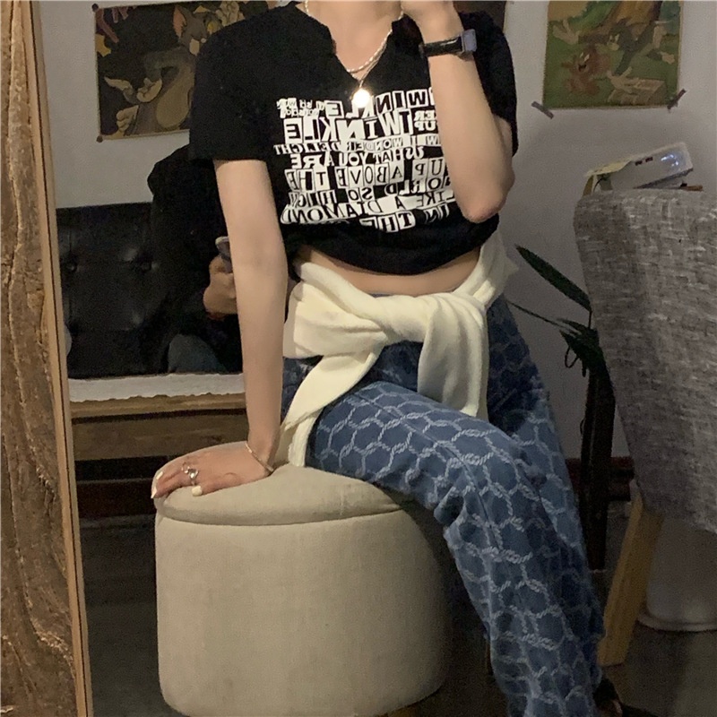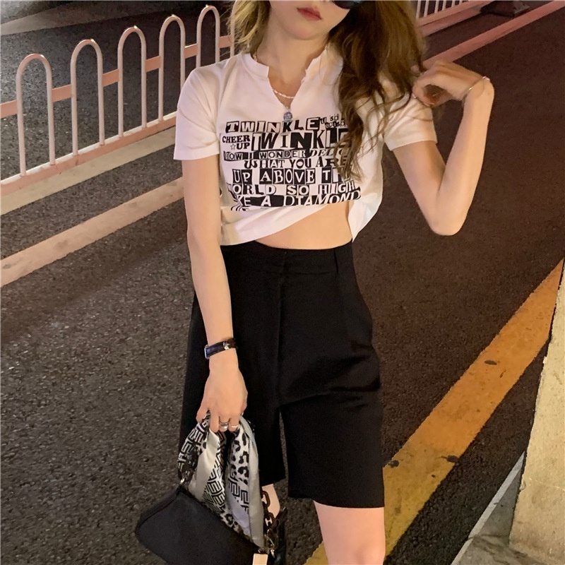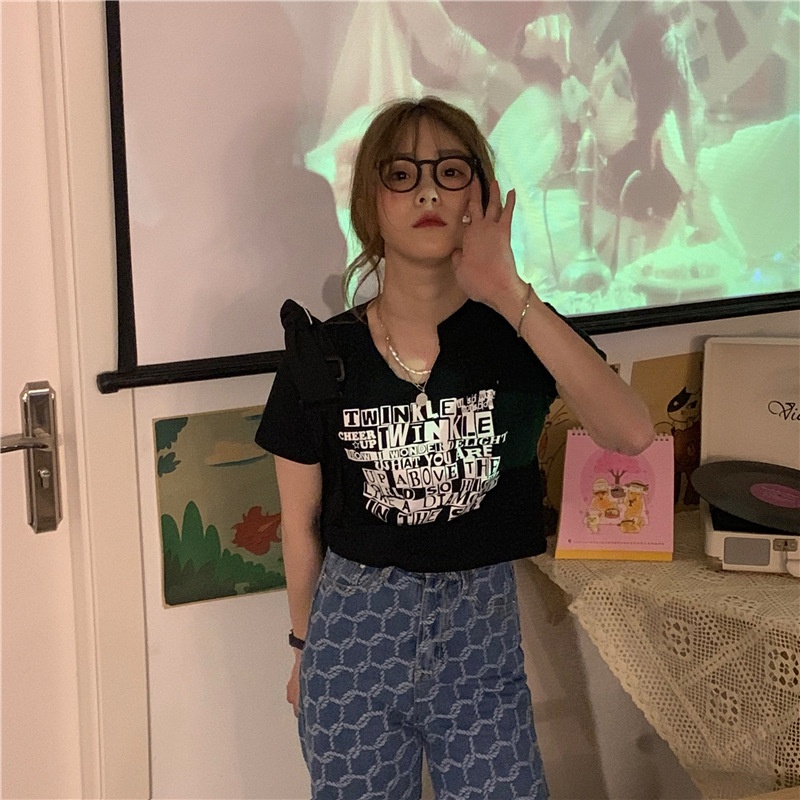 辣妹黑色V领字母印花短袖T恤女设计感2025夏季短款露脐上衣服女潮