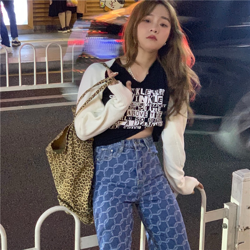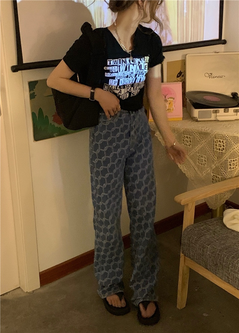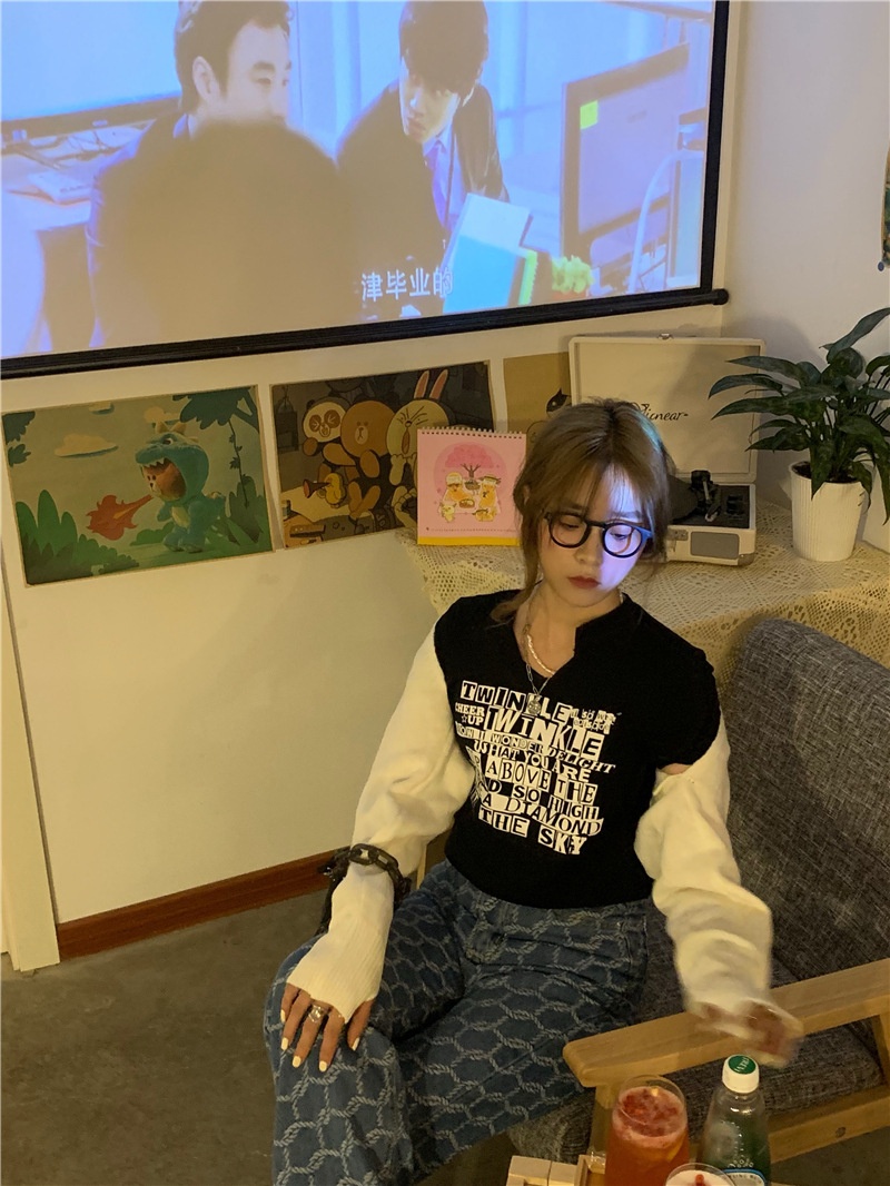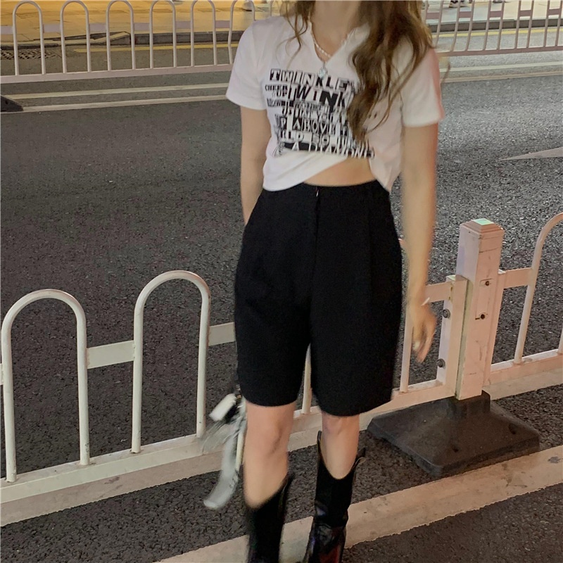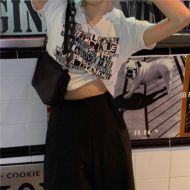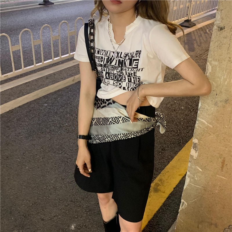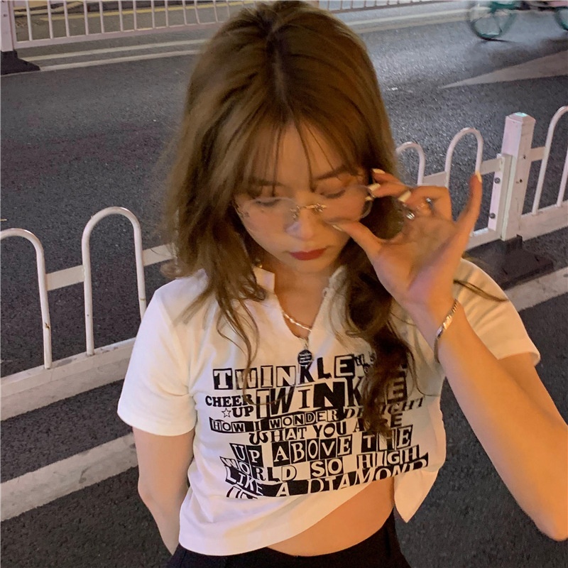 辣妹黑色V领字母印花短袖T恤女设计感2025夏季短款露脐上衣服女潮