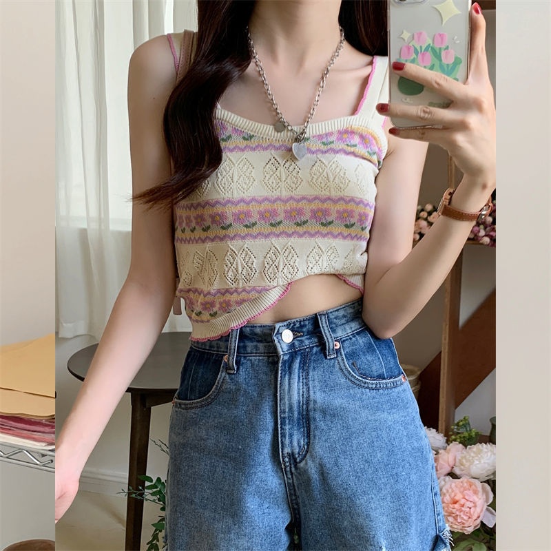 夏季新款针织吊带背心短款上衣镂空无袖设计感衫辣妹性感外穿内搭