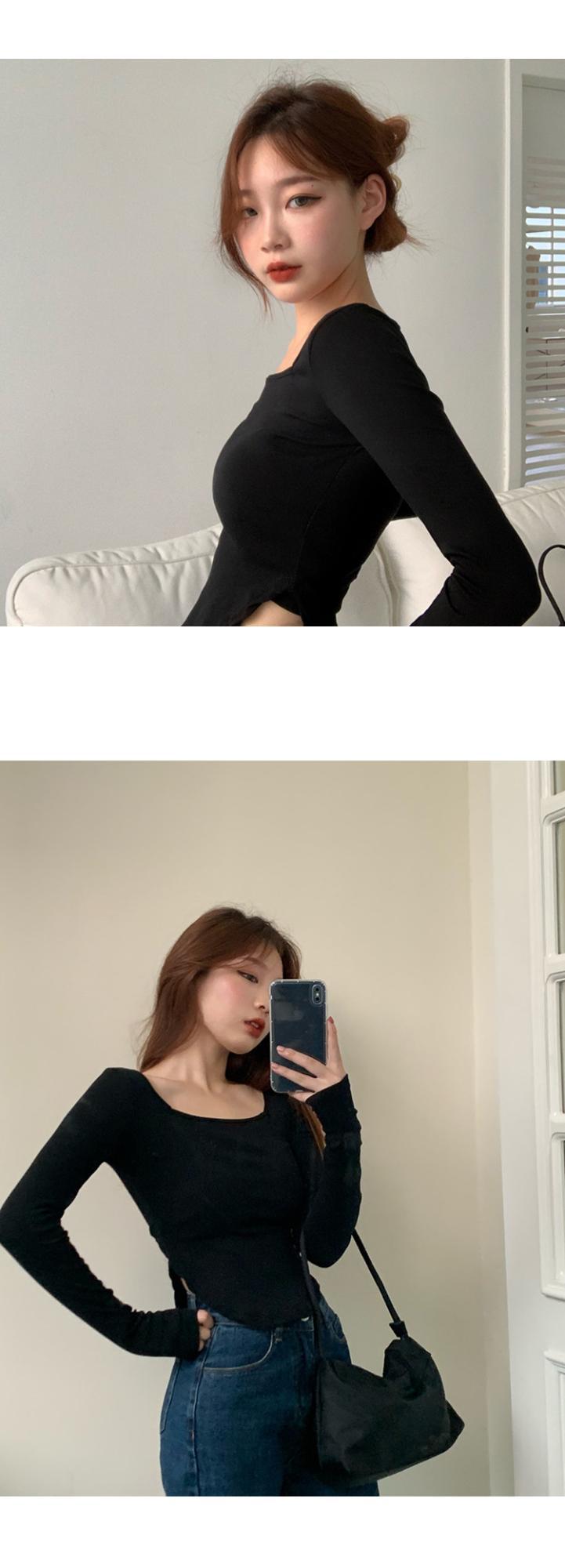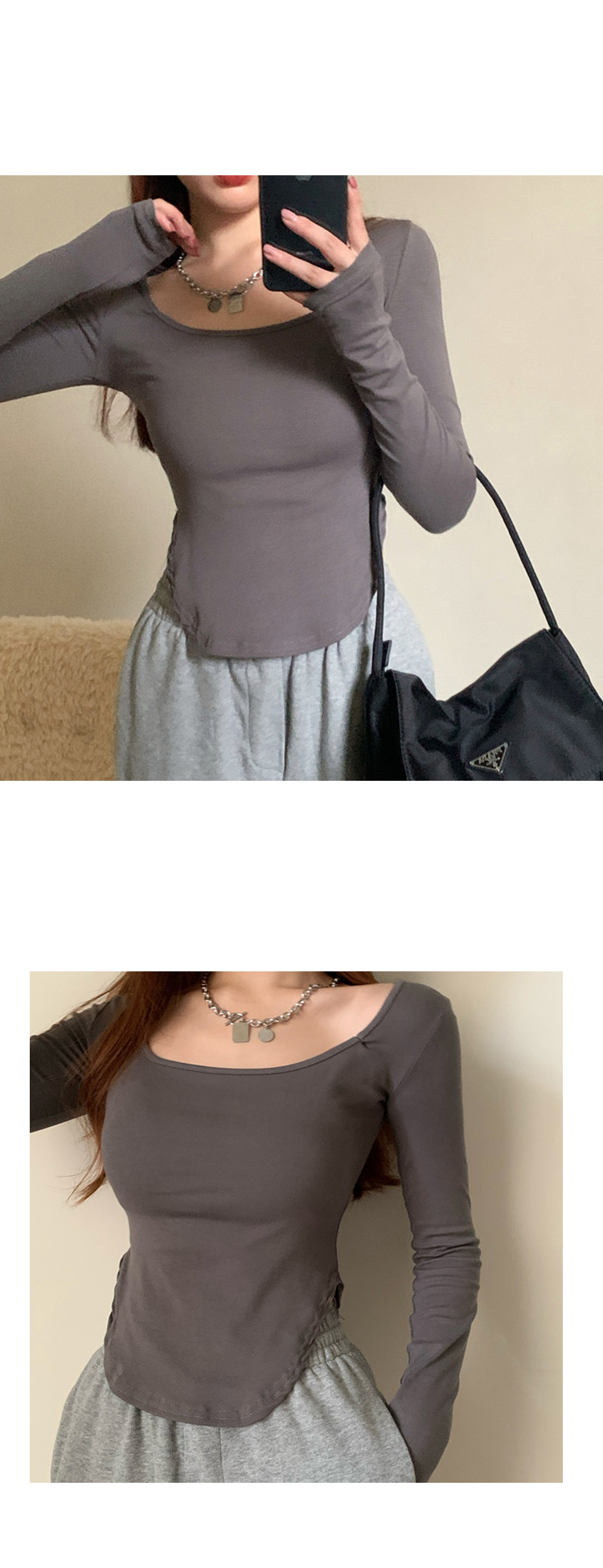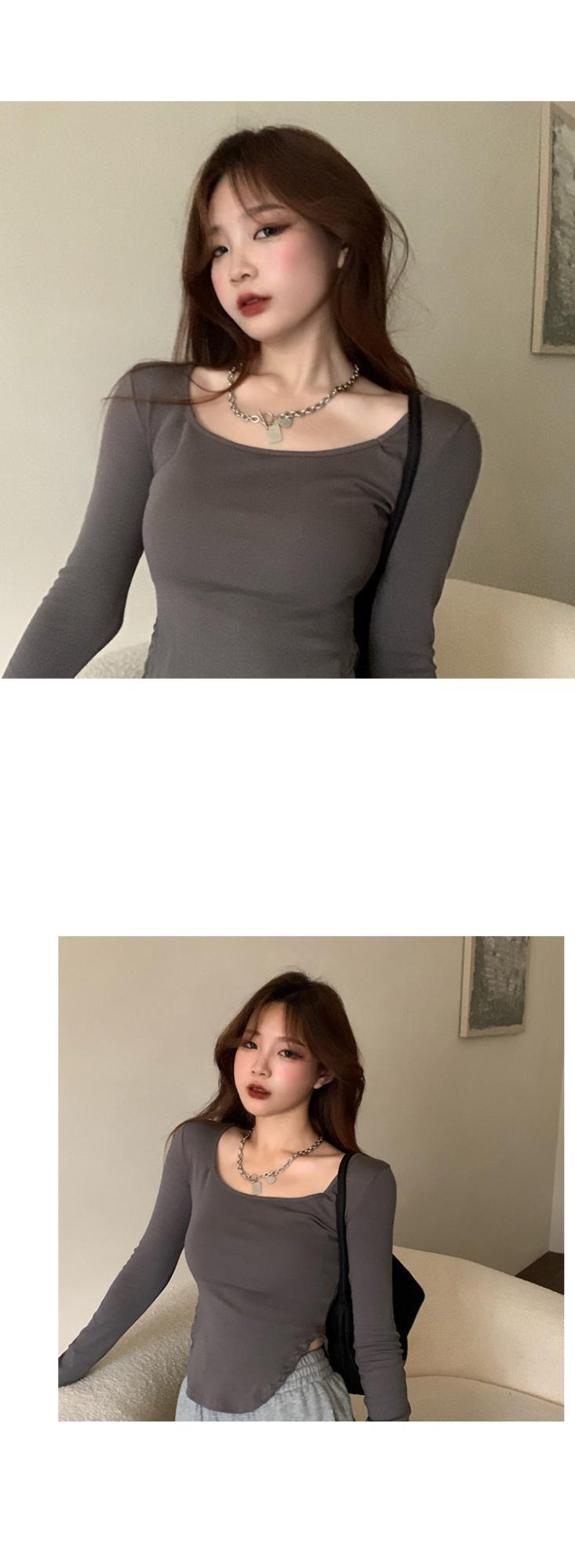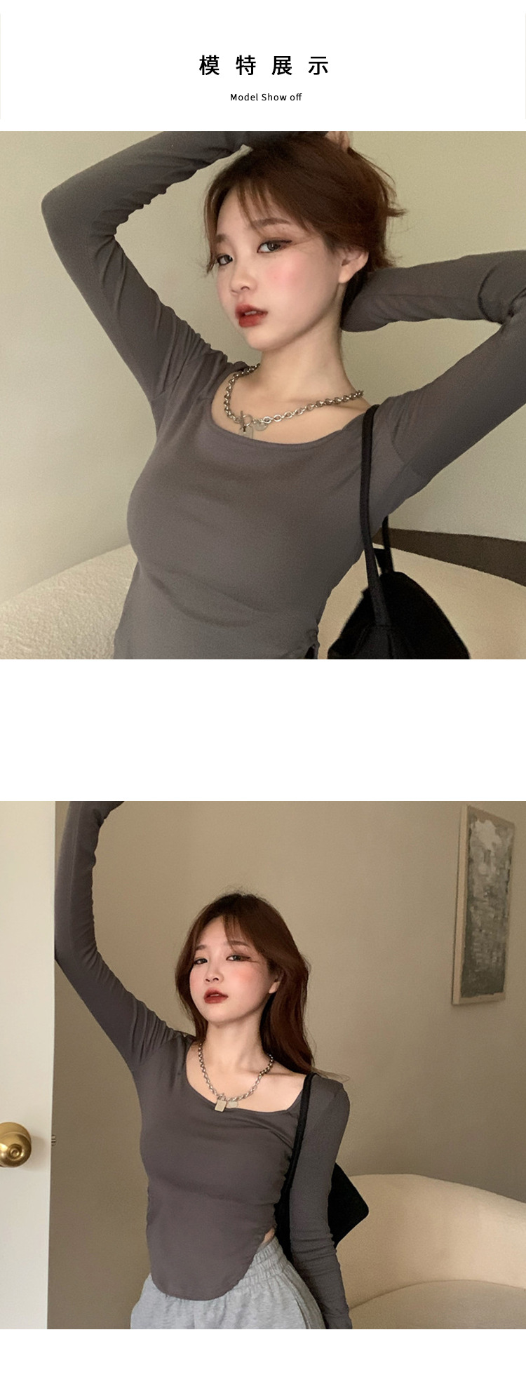 复古不规则长袖T恤女2025秋季新款气质U领修身显瘦内搭纯色上衣潮