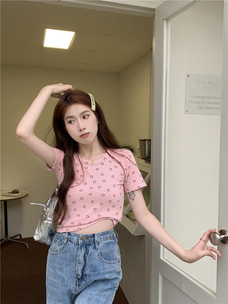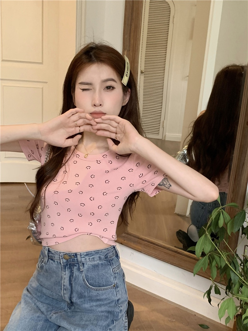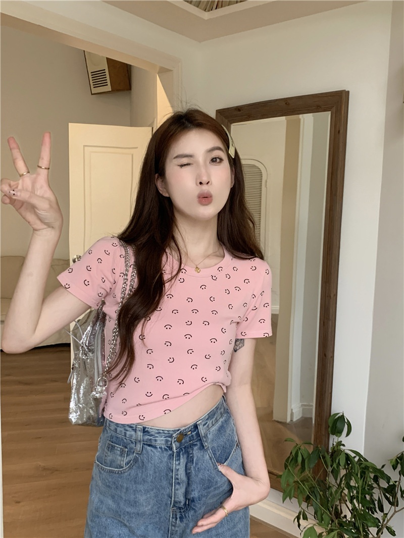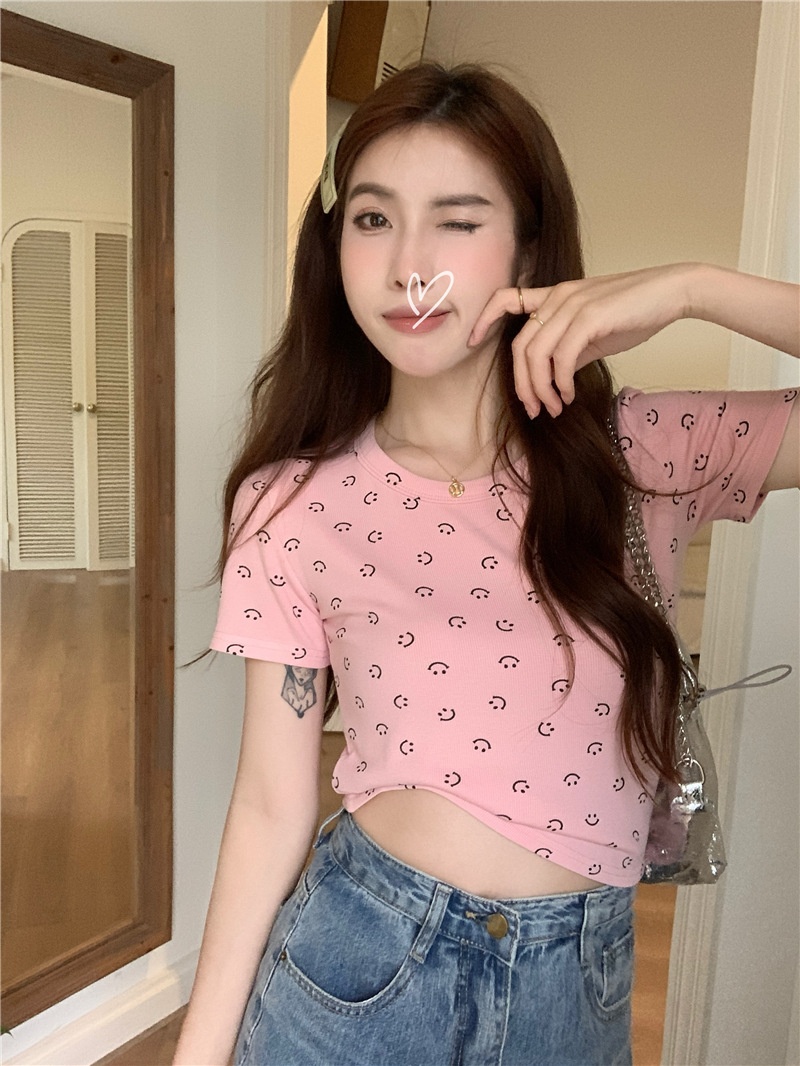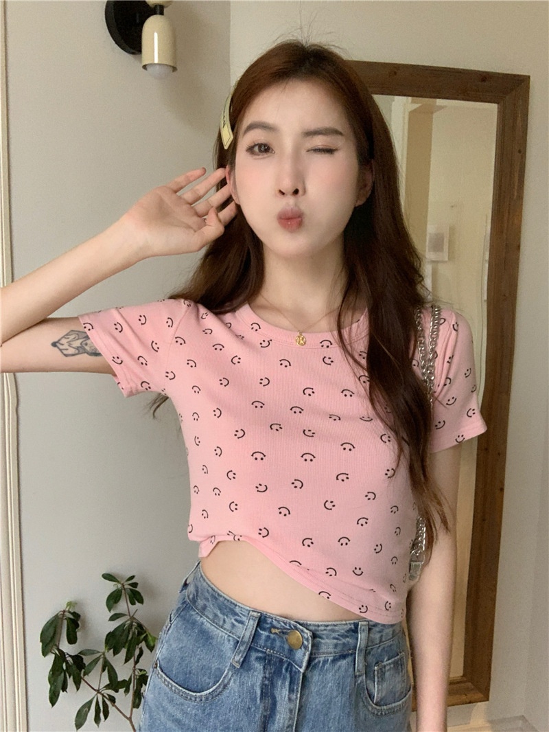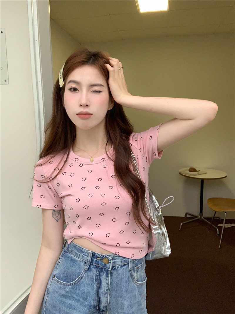 粉色笑脸印花短袖t恤女夏季2025年新款设计感修身短款学生上衣服