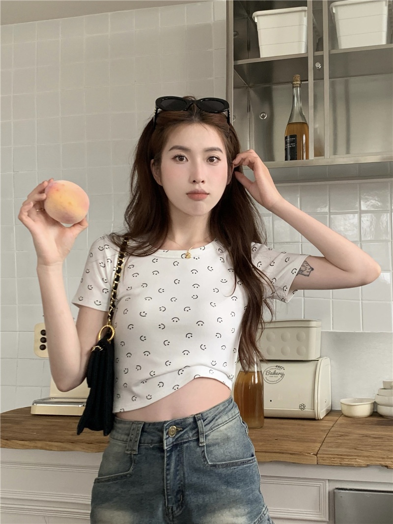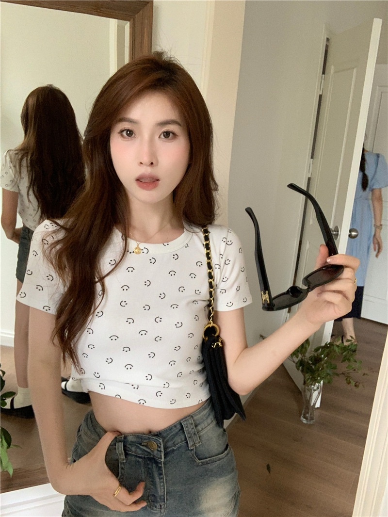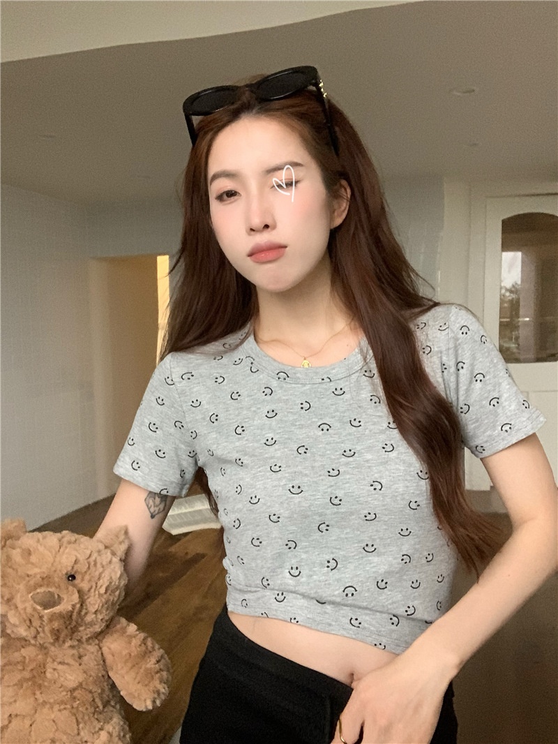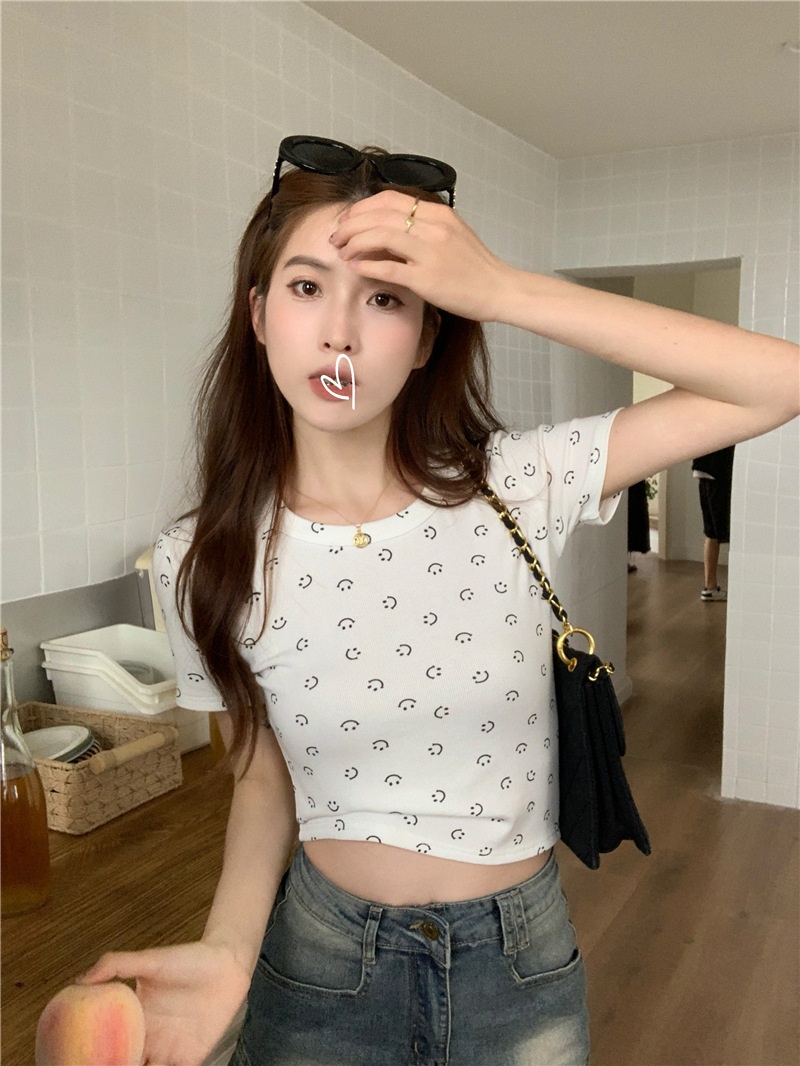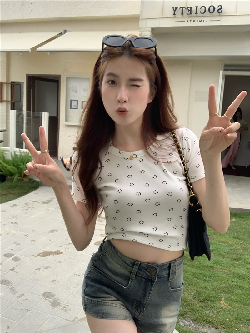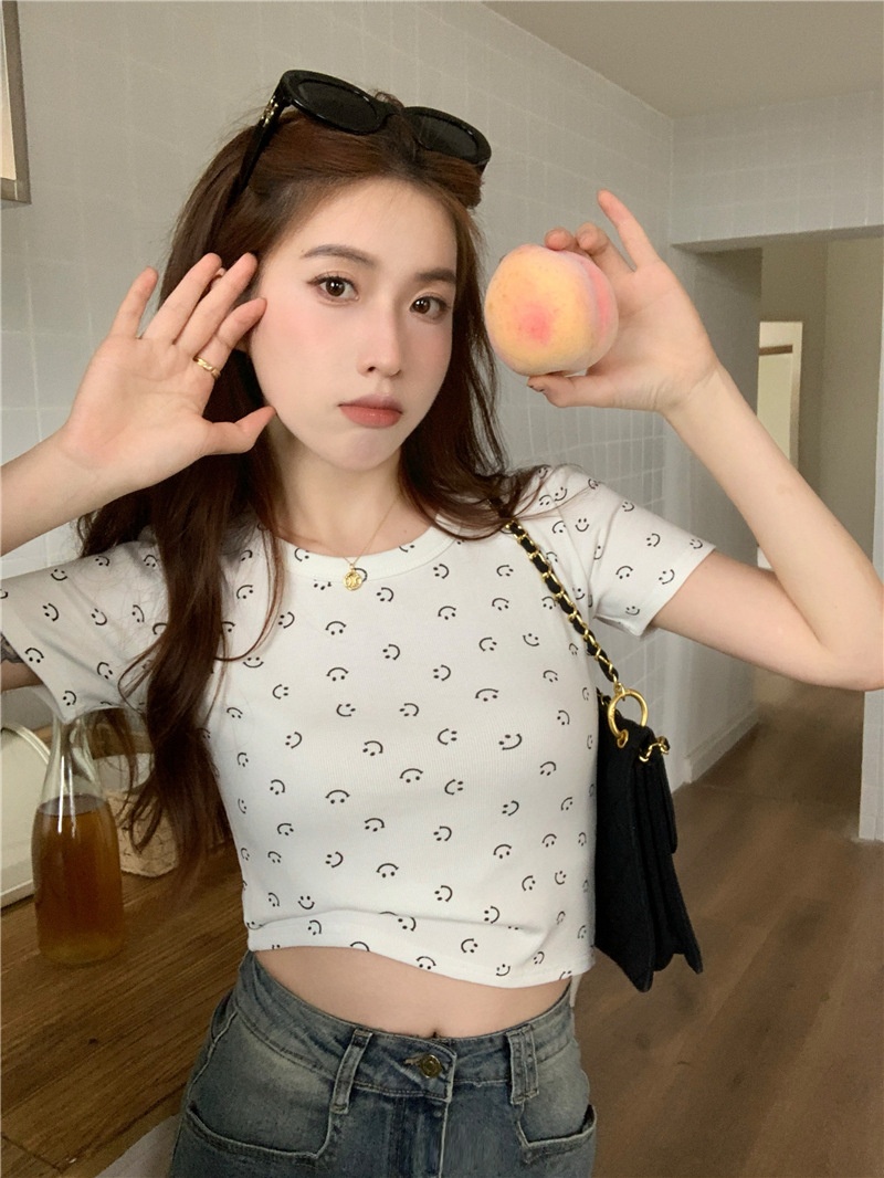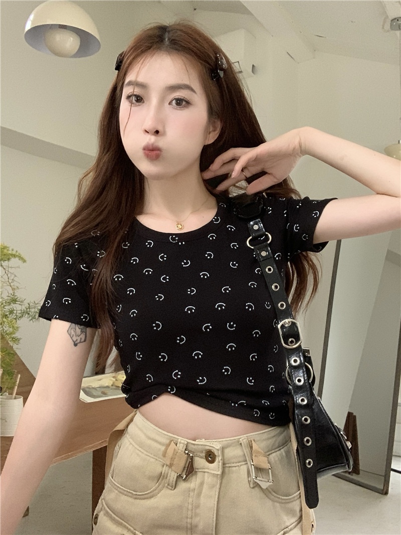 粉色笑脸印花短袖t恤女夏季2025年新款设计感修身短款学生上衣服