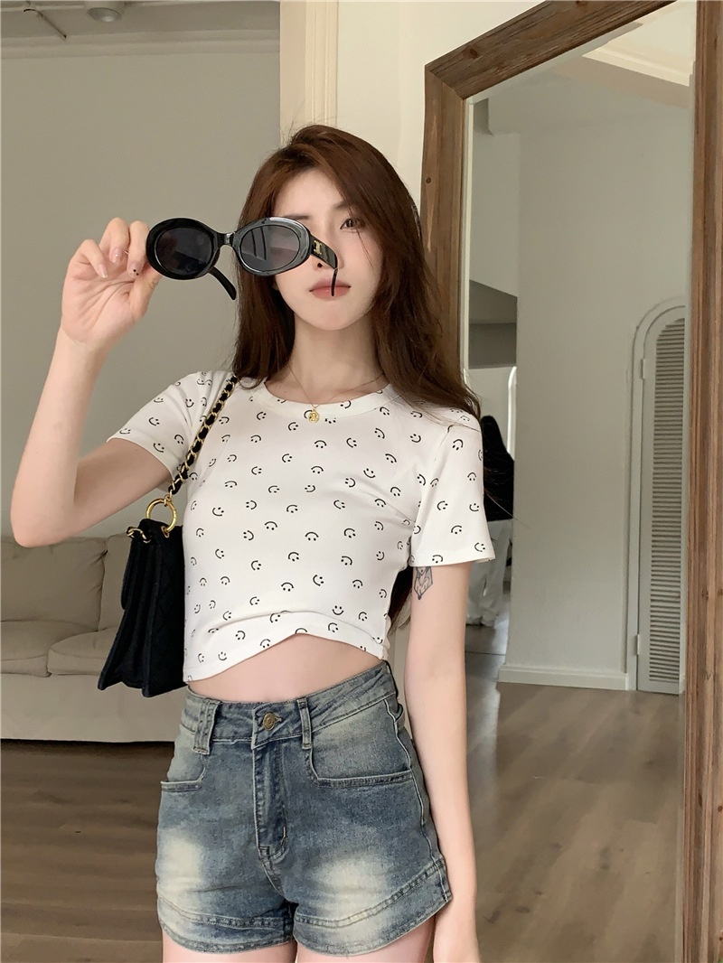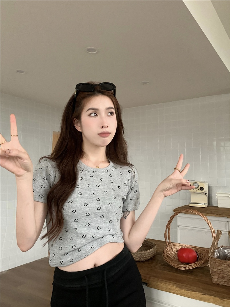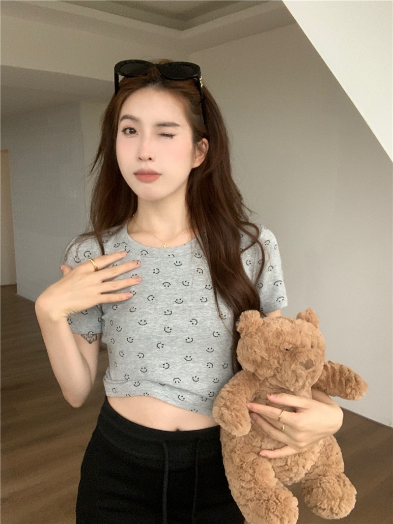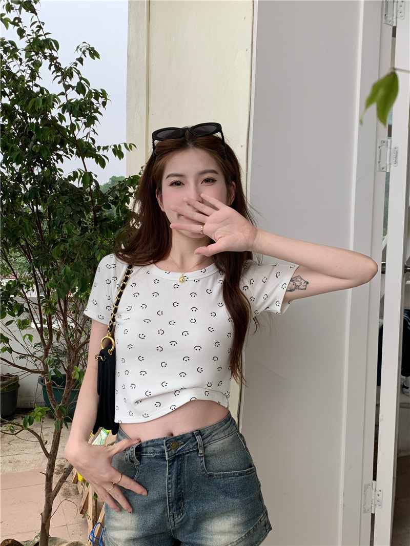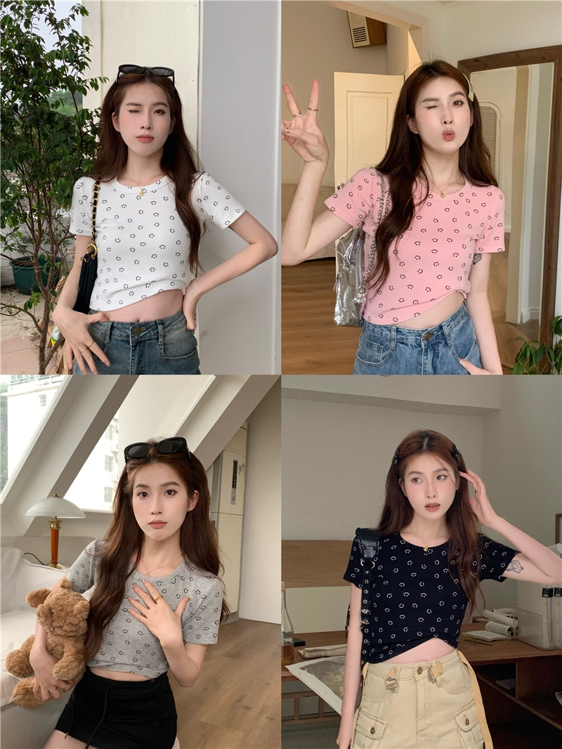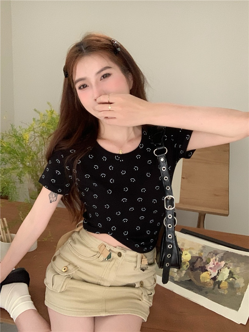粉色笑脸印花短袖t恤女夏季2025年新款设计感修身短款学生上衣服
