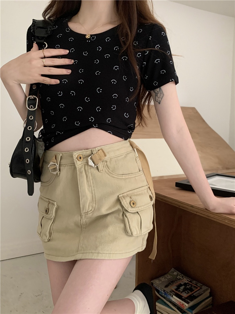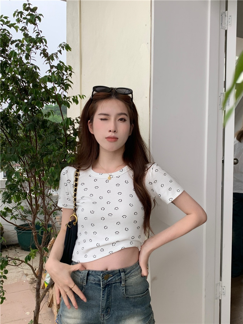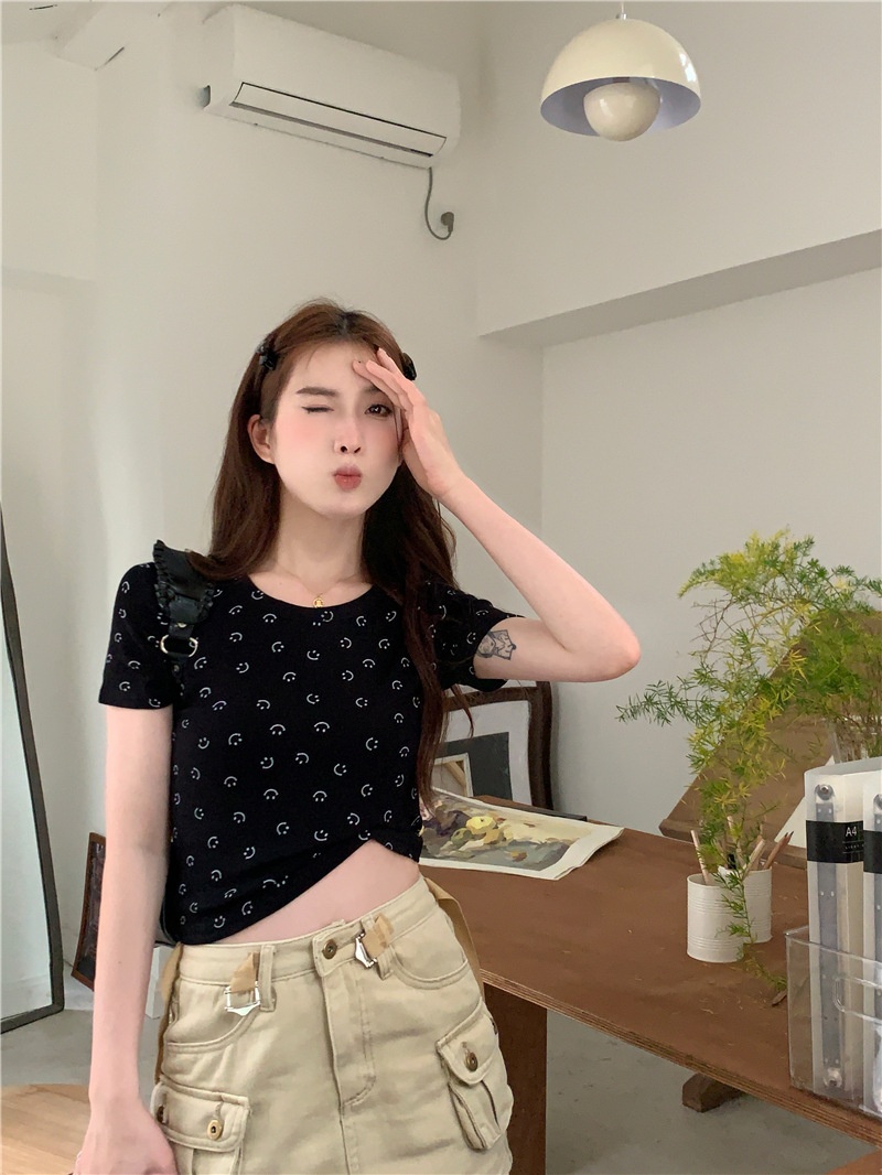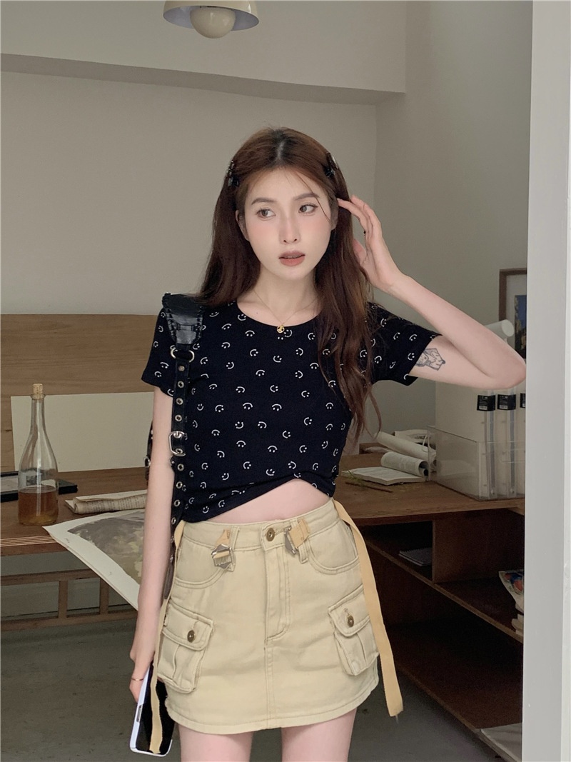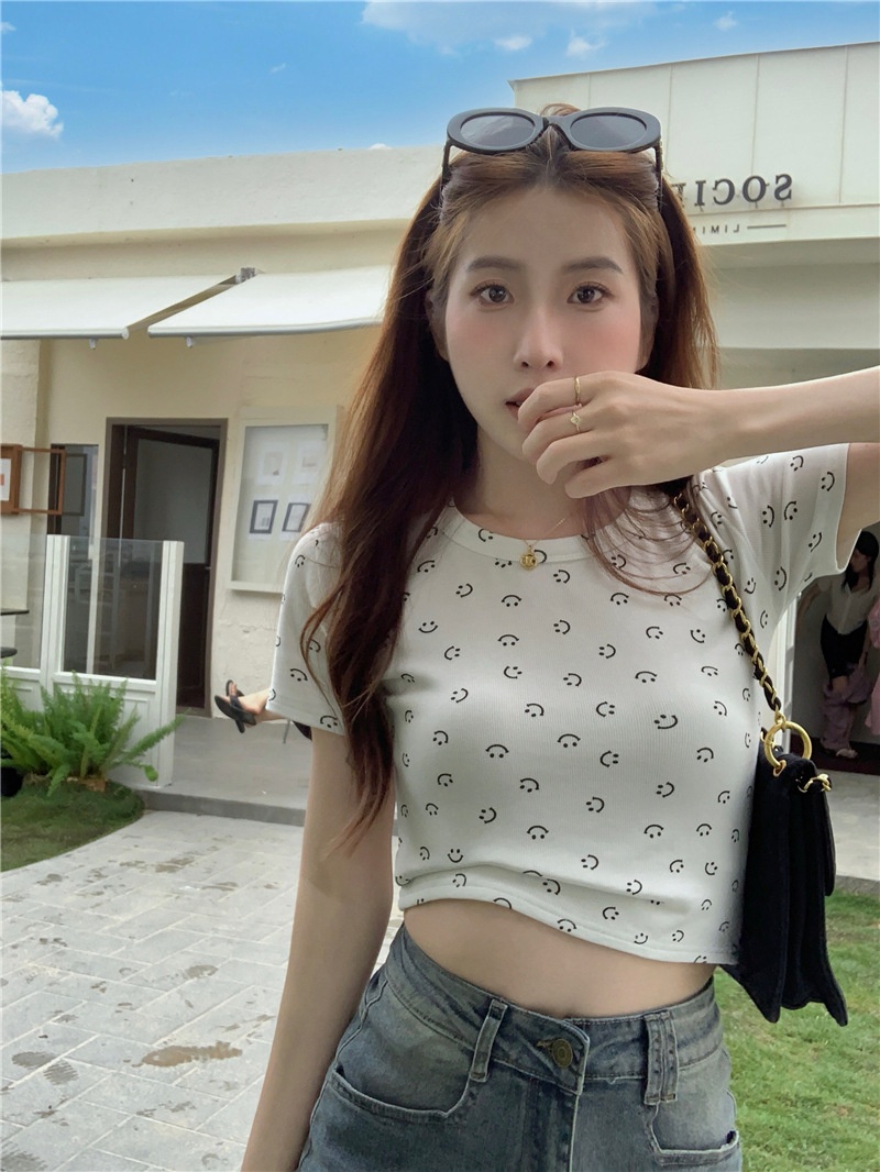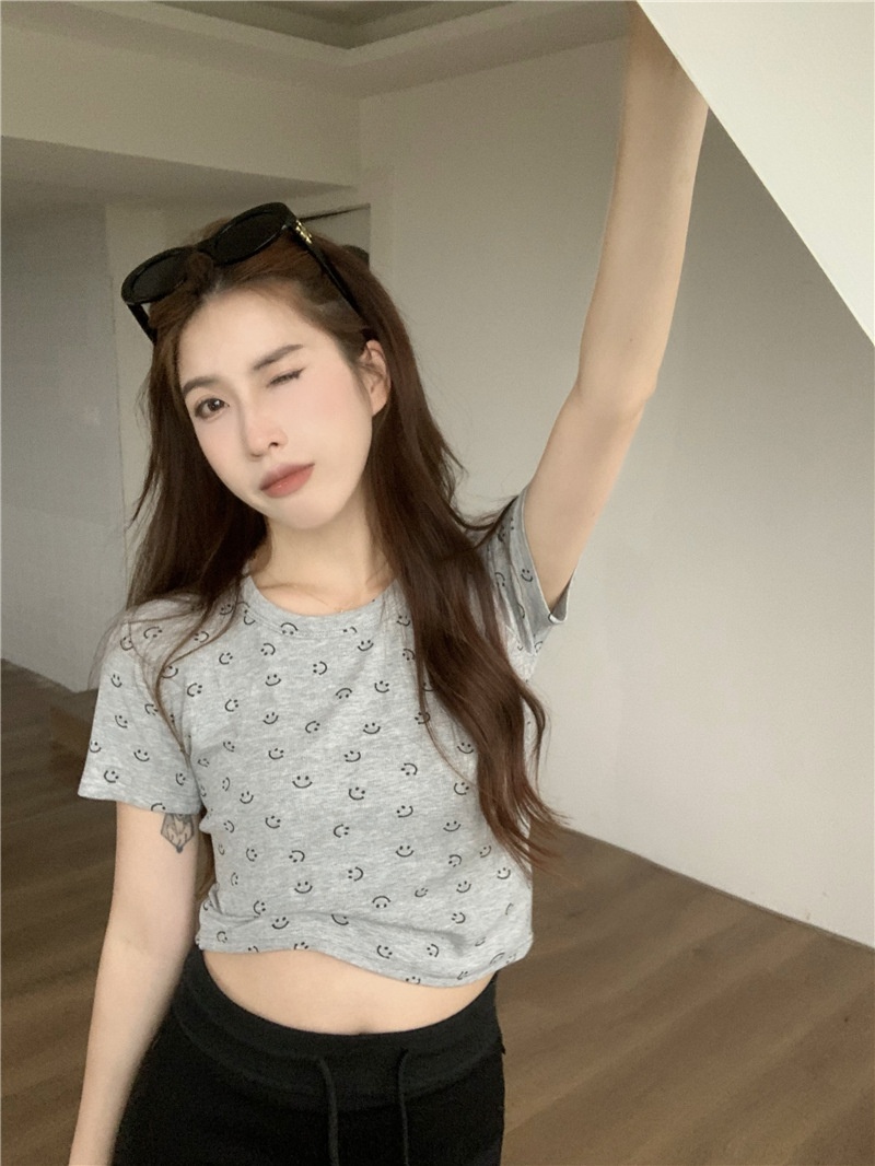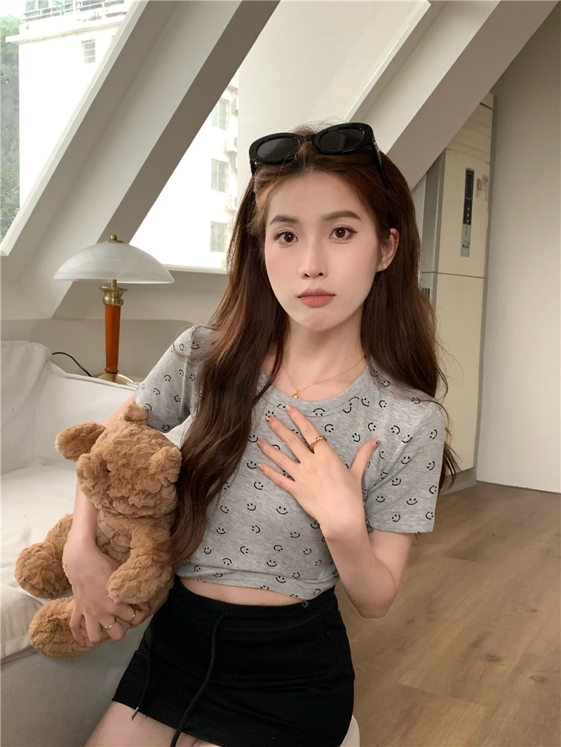 粉色笑脸印花短袖t恤女夏季2025年新款设计感修身短款学生上衣服