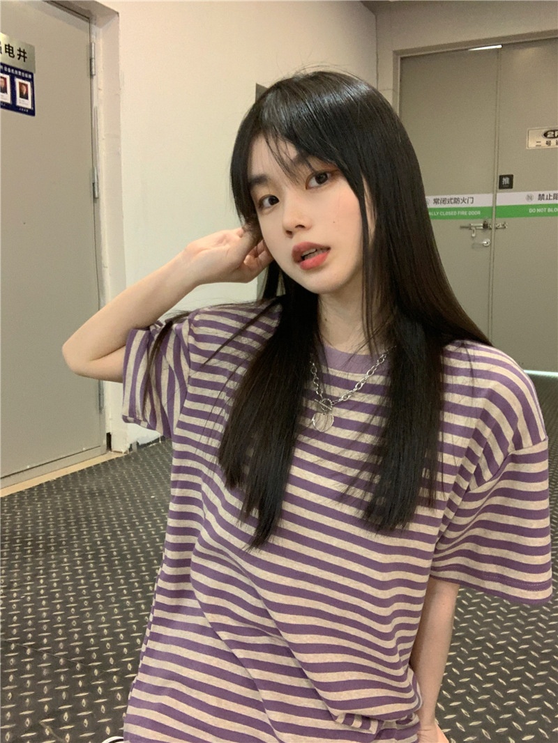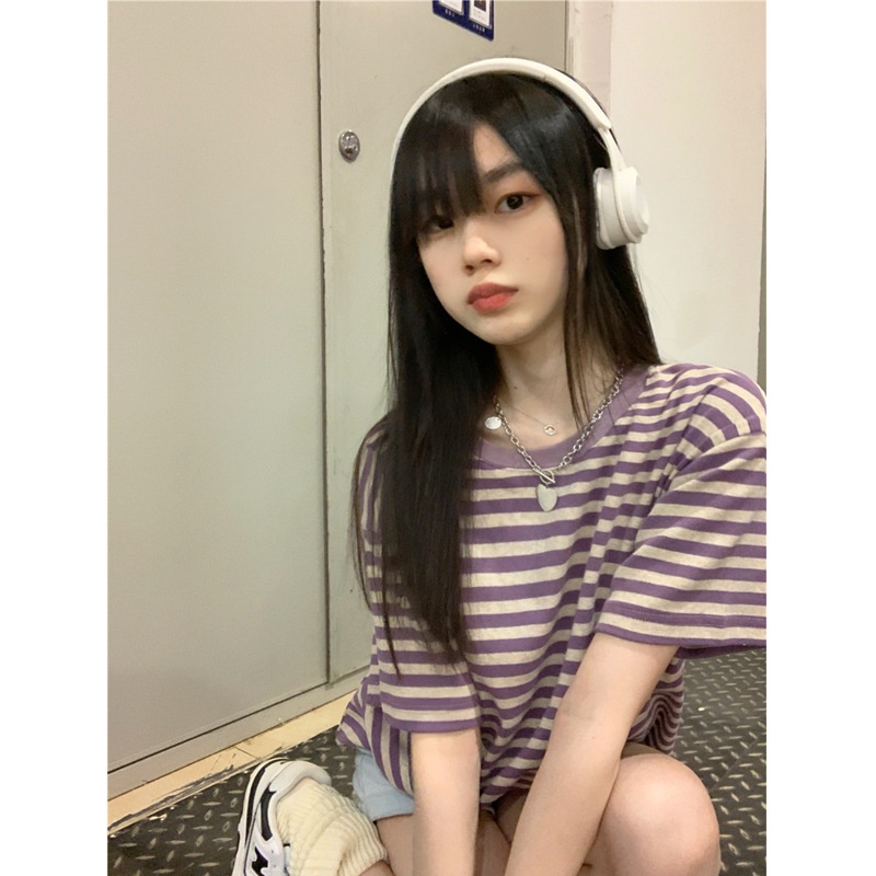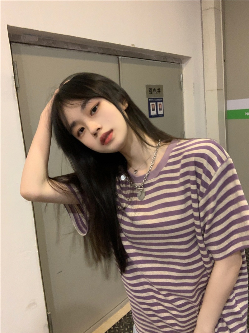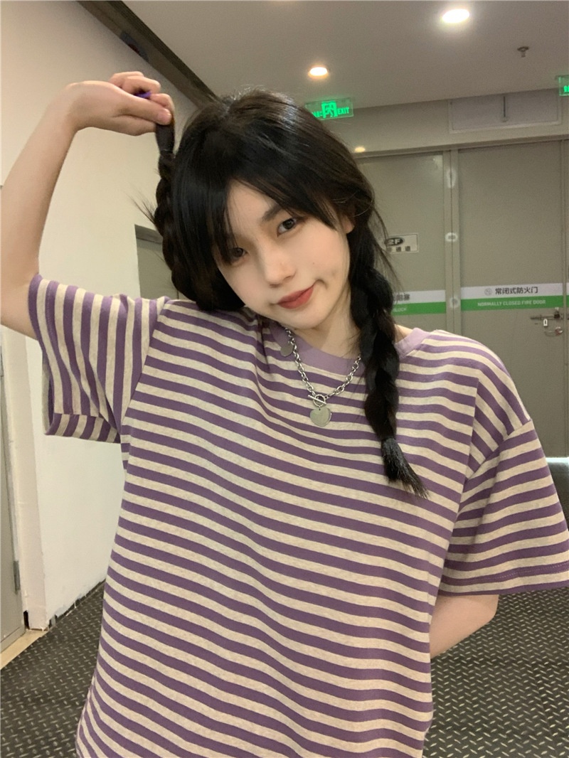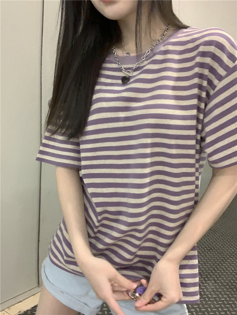 条纹短袖T恤女春季韩版2024新款学生紫色百搭宽松圆领套头上衣潮