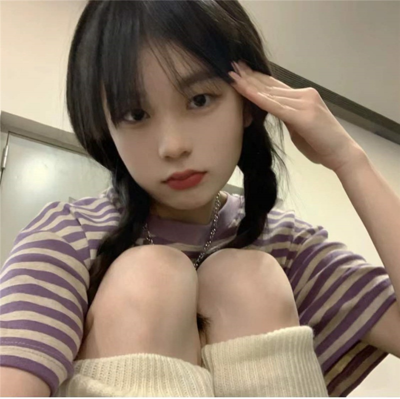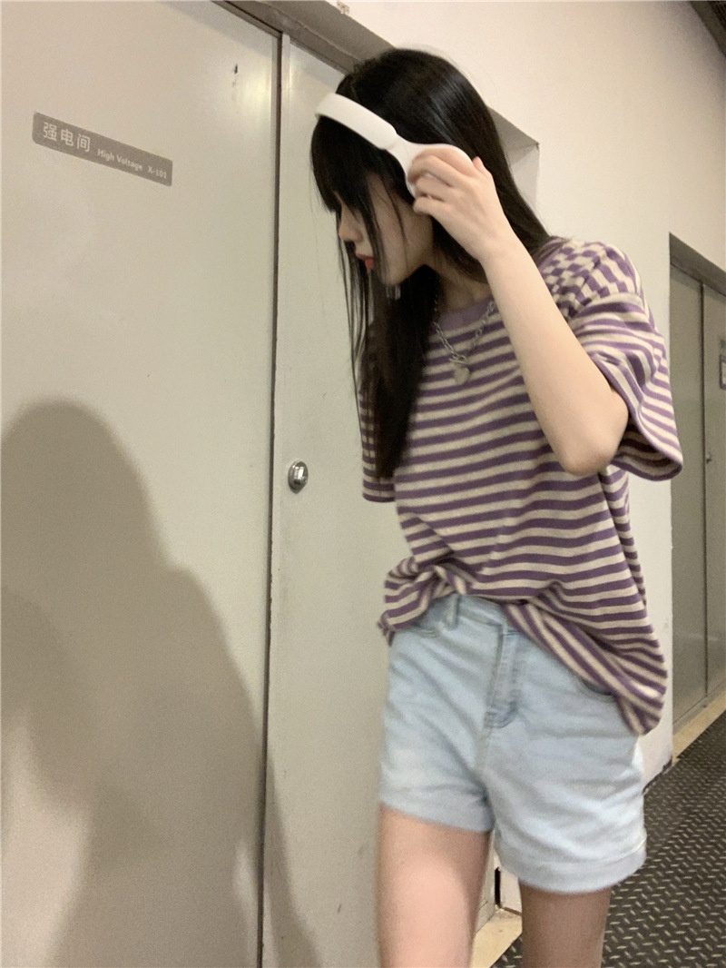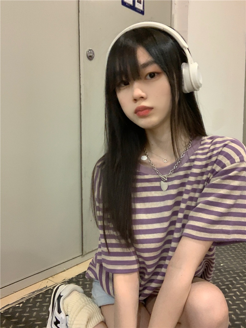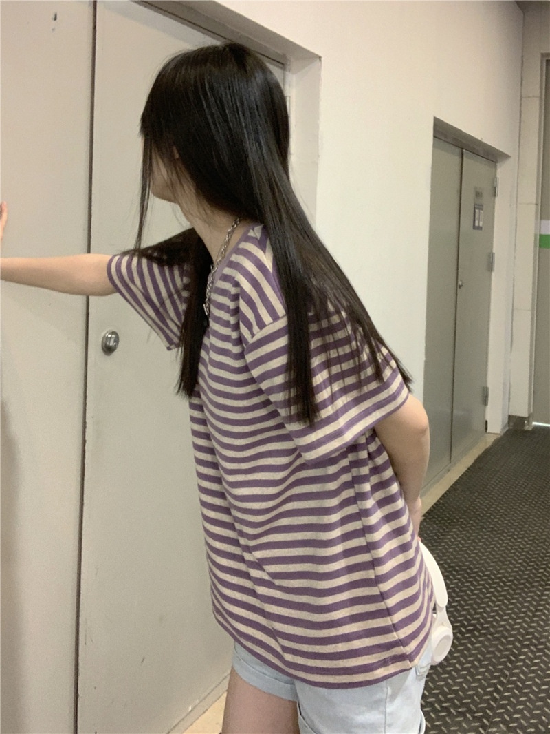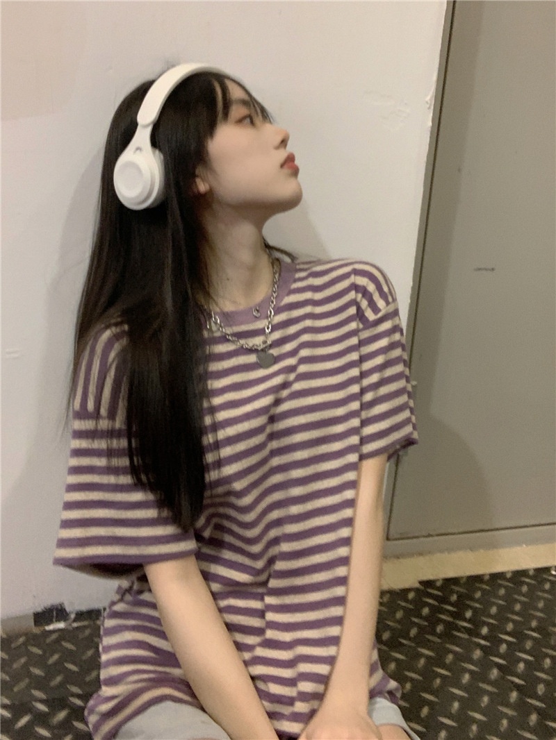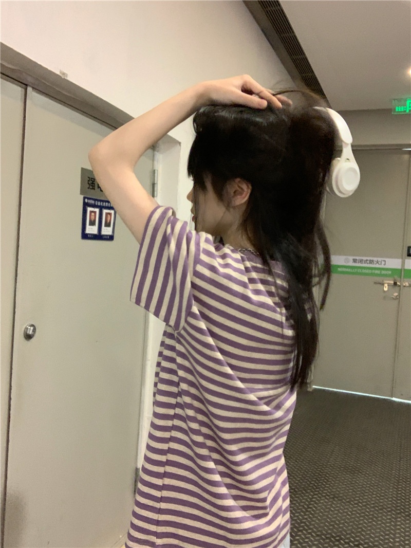 条纹短袖T恤女春季韩版2024新款学生紫色百搭宽松圆领套头上衣潮