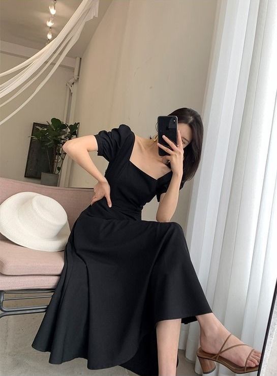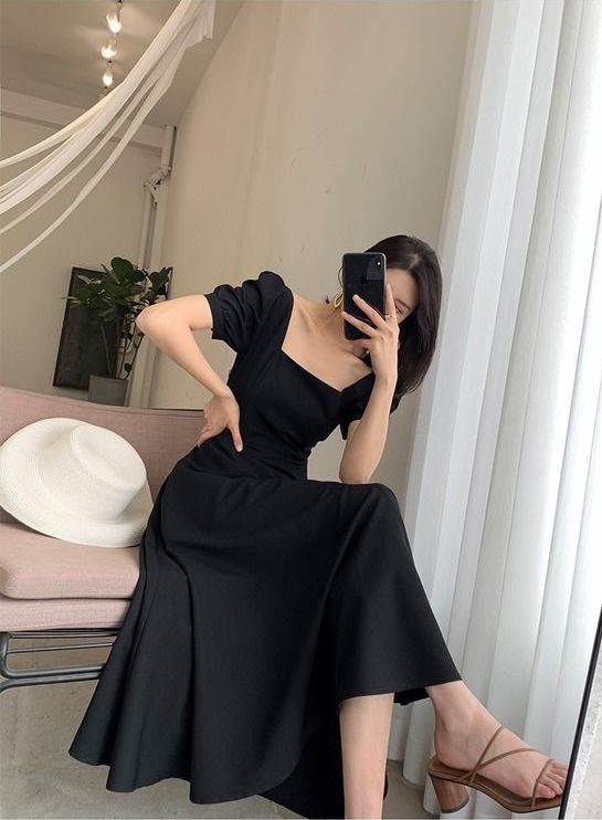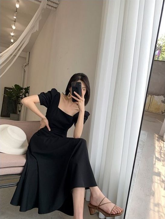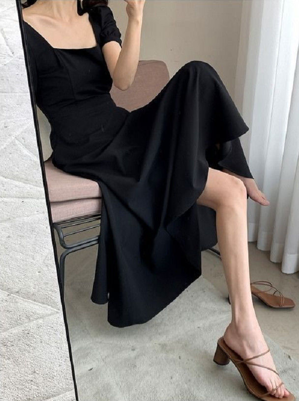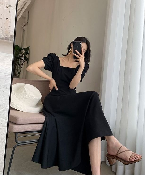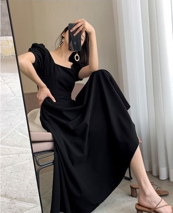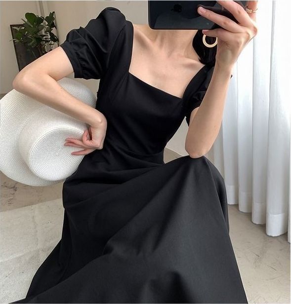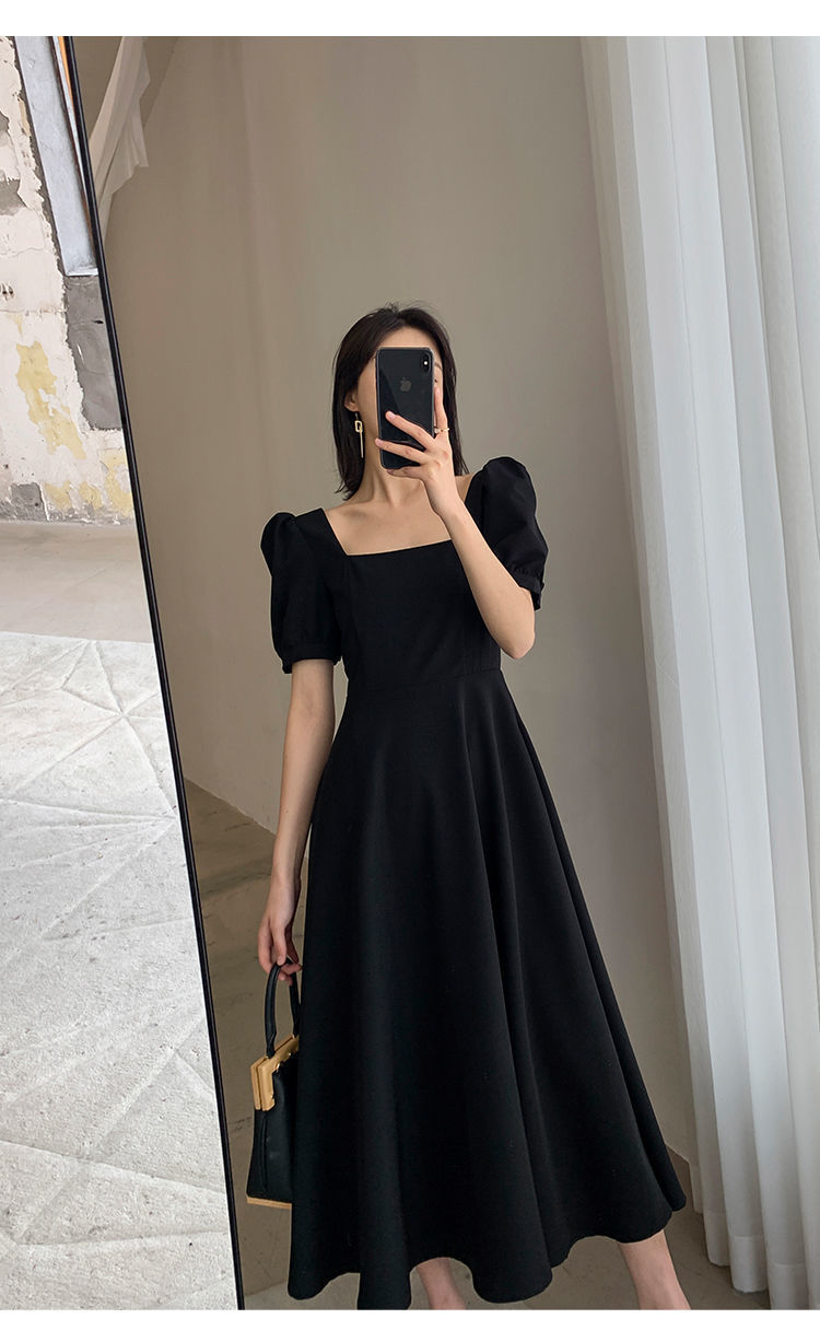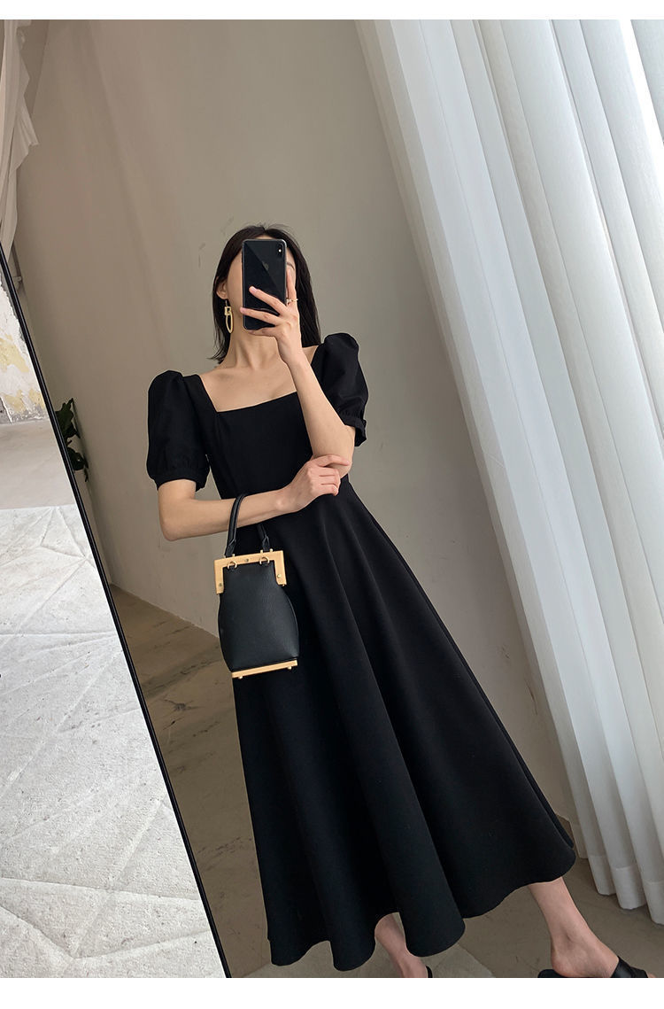 连衣裙2025夏新款ins茶歇裙气质一字领过膝长款赫本风胖mm小黑裙