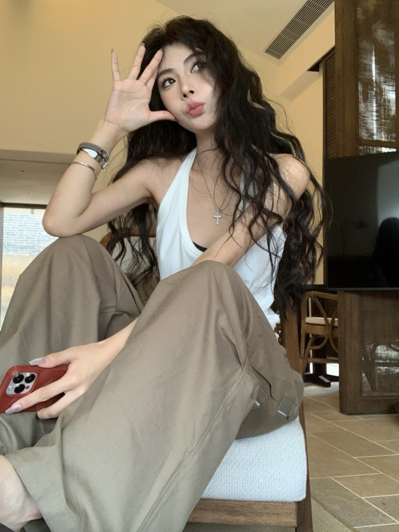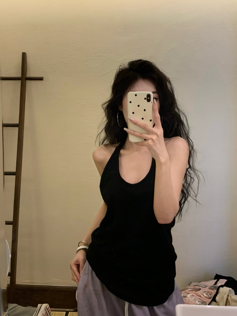 夏季短款纯色法式针织薄款挂脖吊带性感辣妹外穿露背加工定制上衣