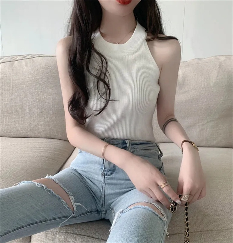 夏季短款纯色法式针织薄款挂脖吊带性感辣妹外穿露背加工定制上衣