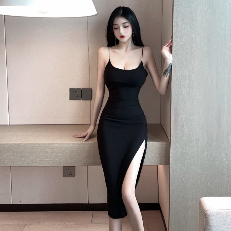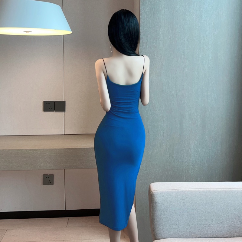 纯色性感开叉吊带连衣裙女2023夏季新款收腰显瘦包臀裙中长款S裙
