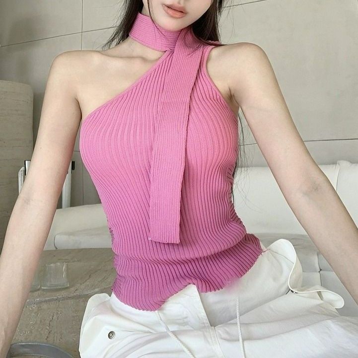 夏季高级感辣妹挂脖吊带斜肩无袖针织背心女修身显瘦内搭洋气上衣