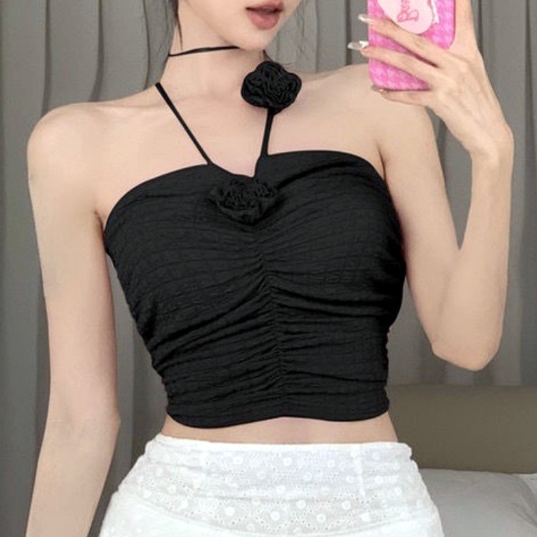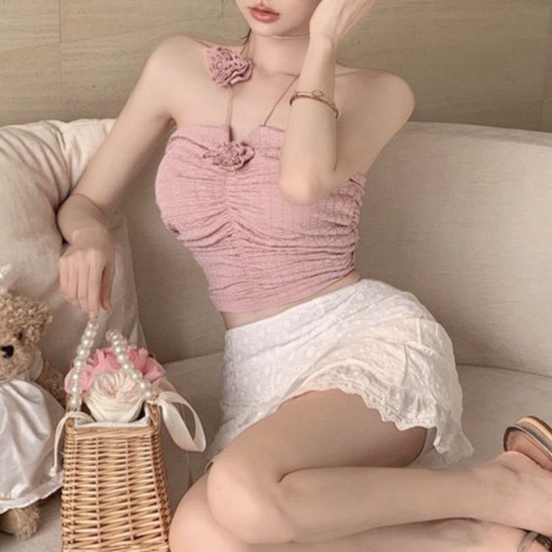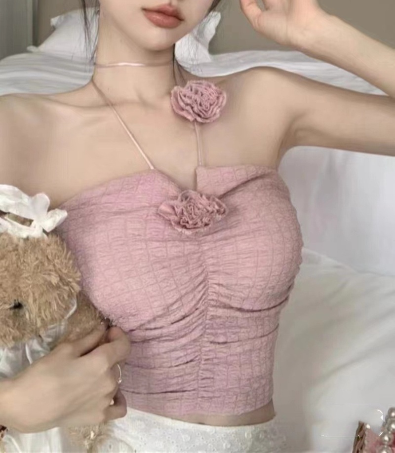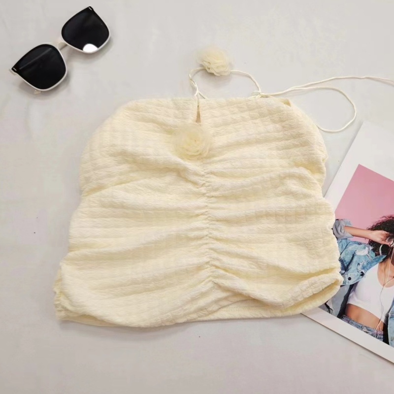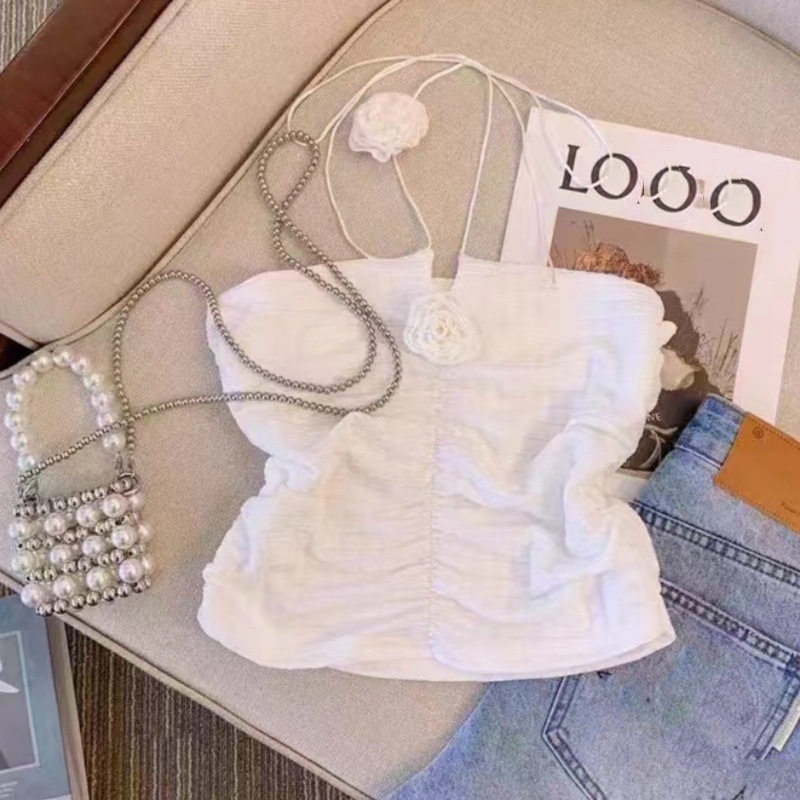 夏季新款法式气质挂脖胸花吊带背心无袖露肩女内搭外穿辣妹短上衣