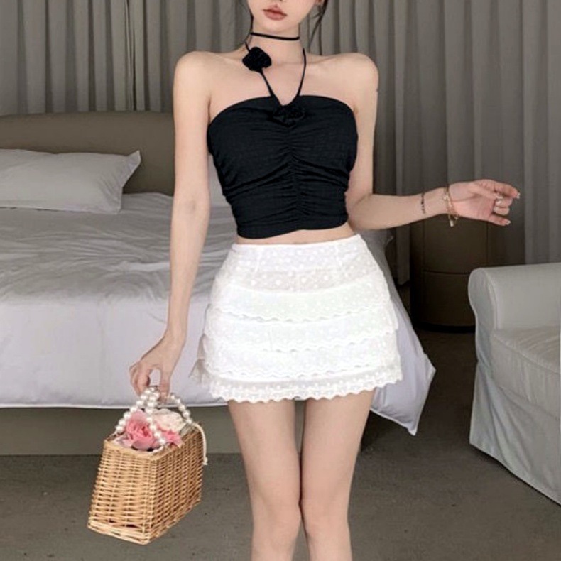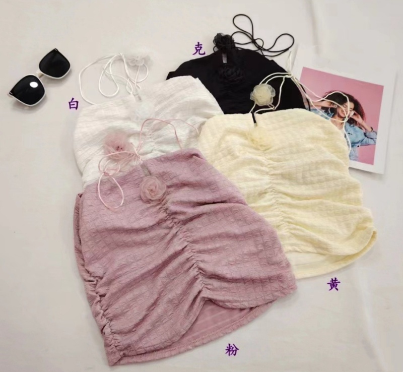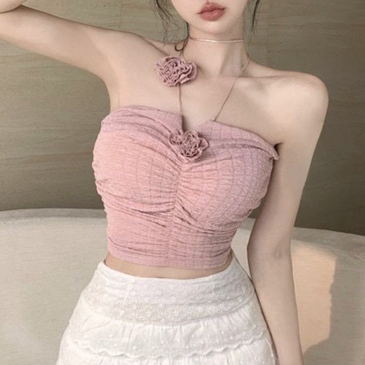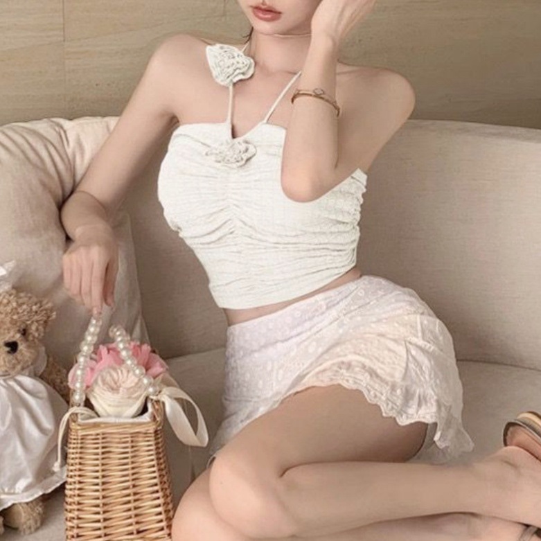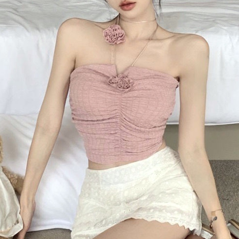 夏季新款法式气质挂脖胸花吊带背心无袖露肩女内搭外穿辣妹短上衣