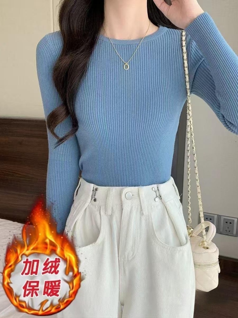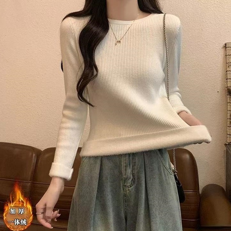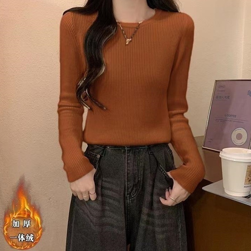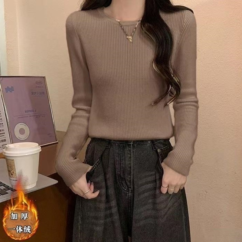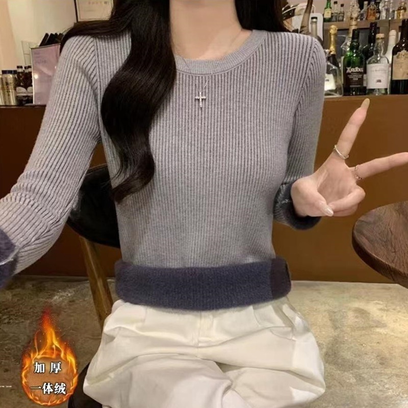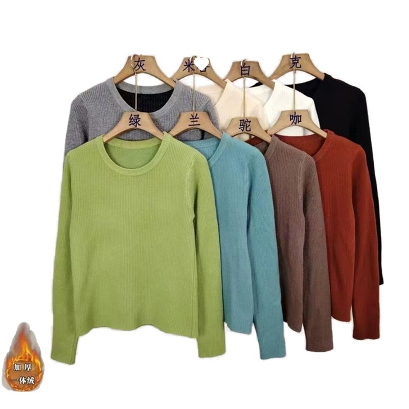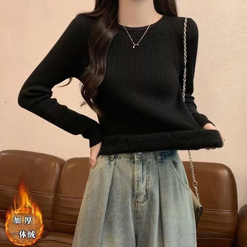 2024秋冬韩版时尚简约圆领基础款保暖一体绒针织衫百搭长袖上衣女