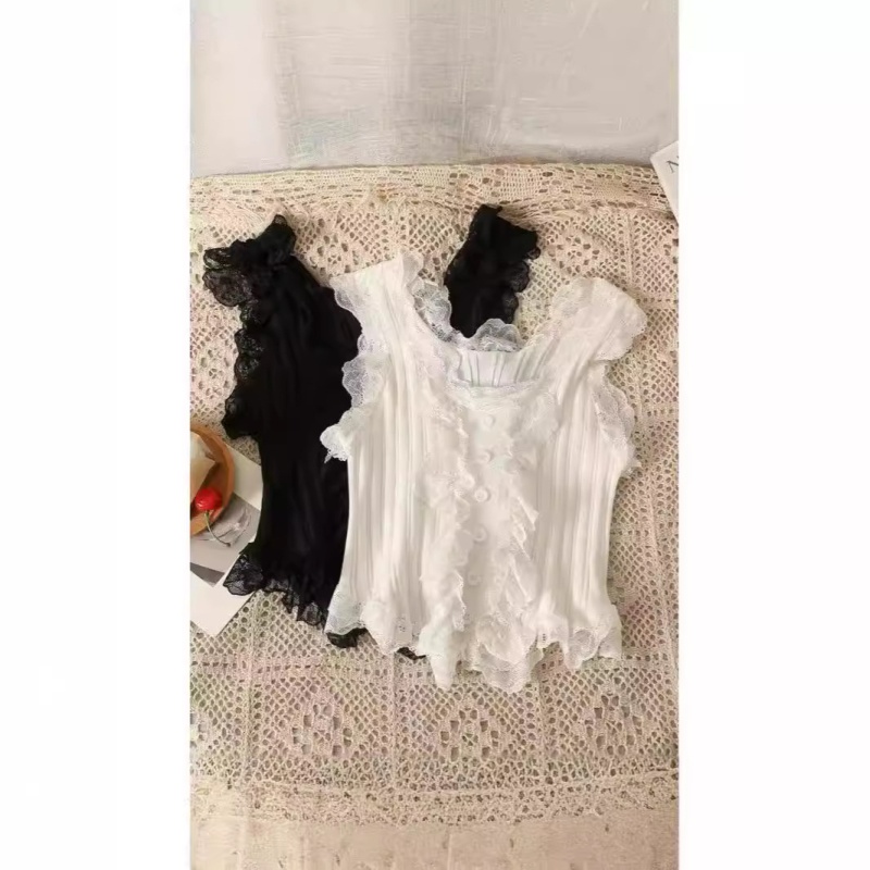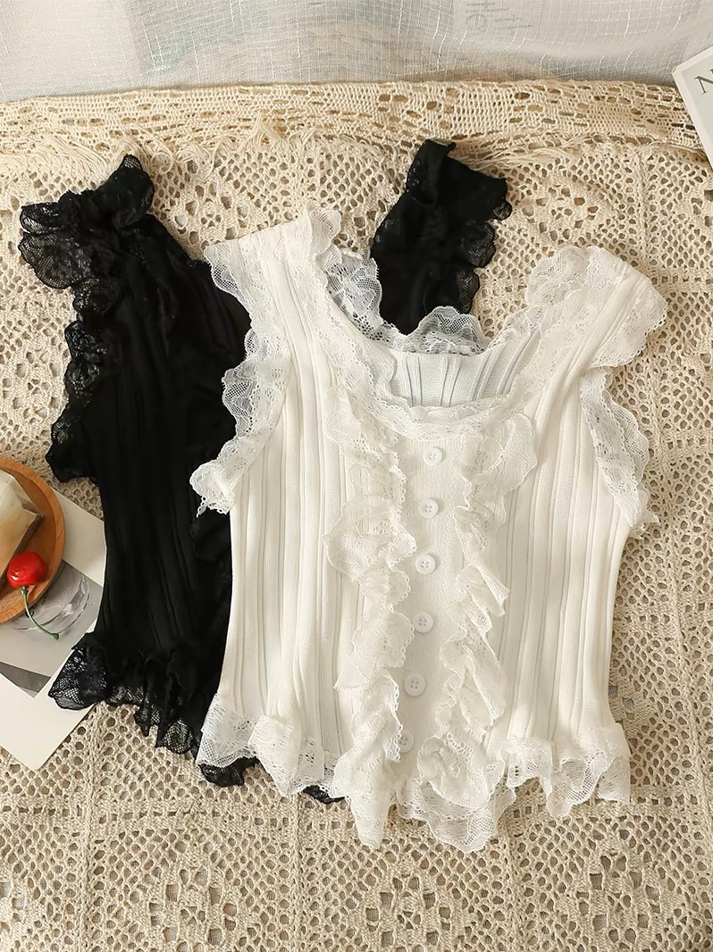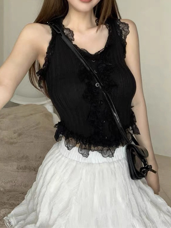 纯欲风白色针织吊带背心女夏季性感修身短款无袖蕾丝花边针织上衣
