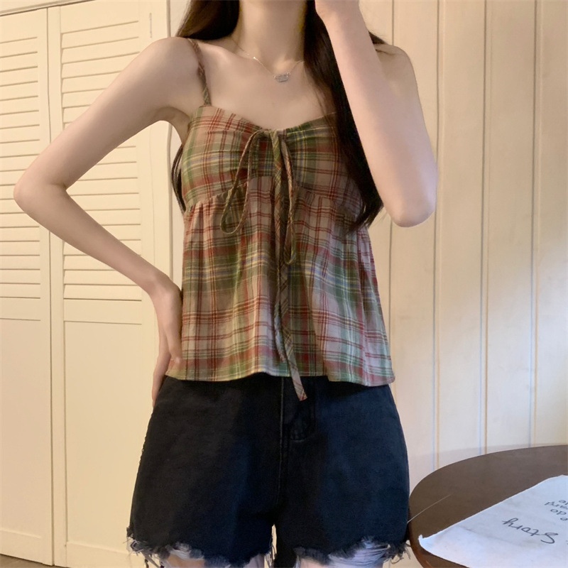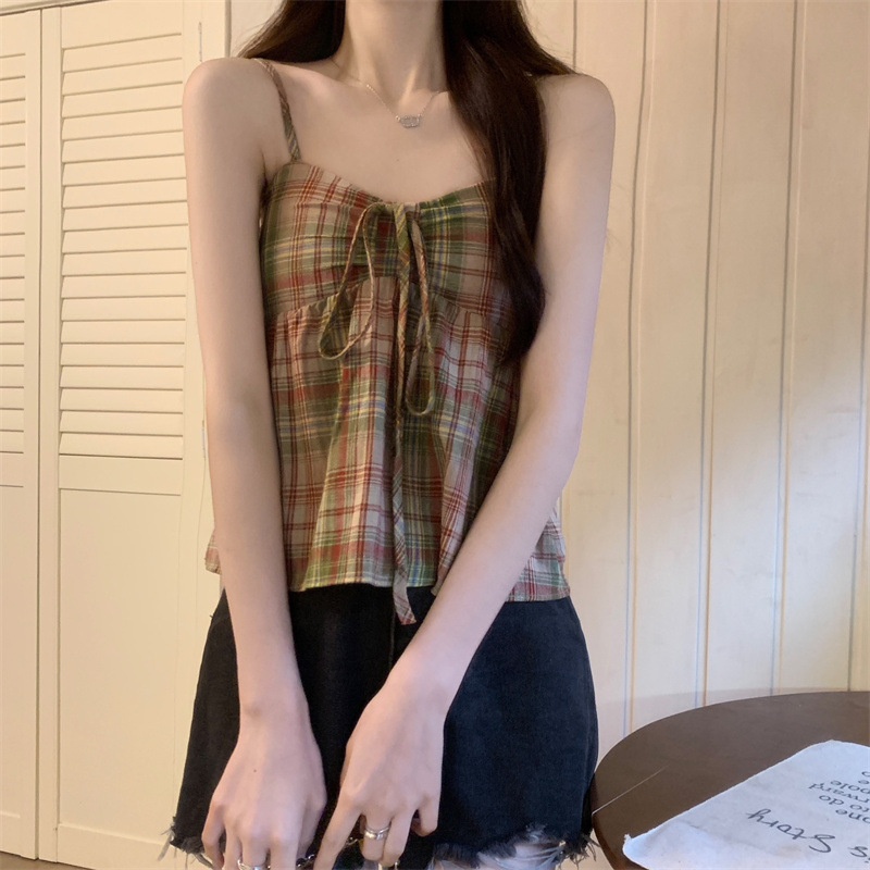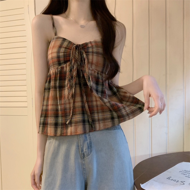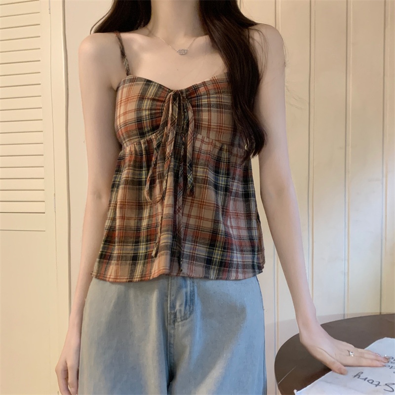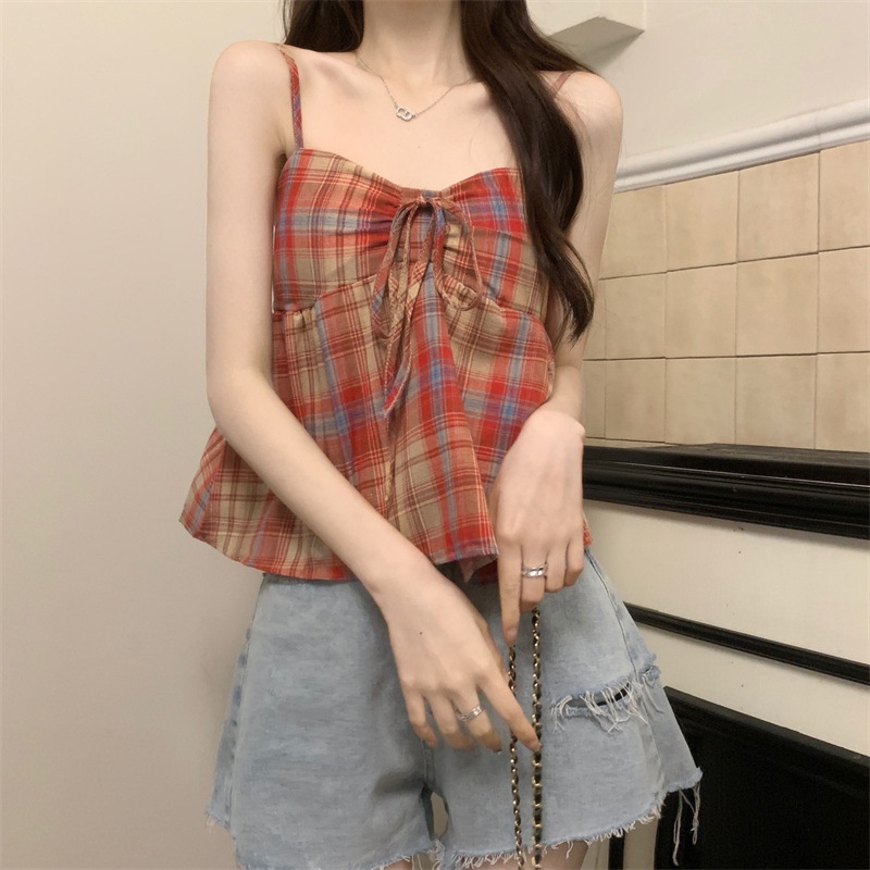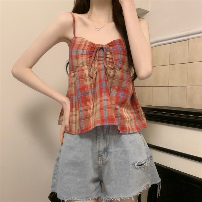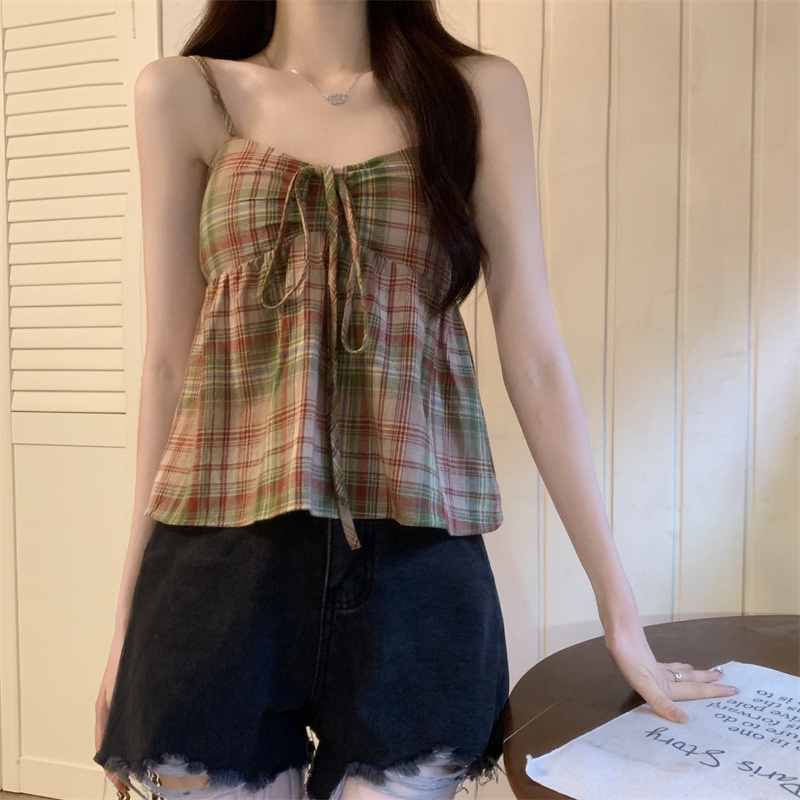 2024设计感复古格子绑带抹胸背心女夏季韩版洋气甜美短款外穿上衣