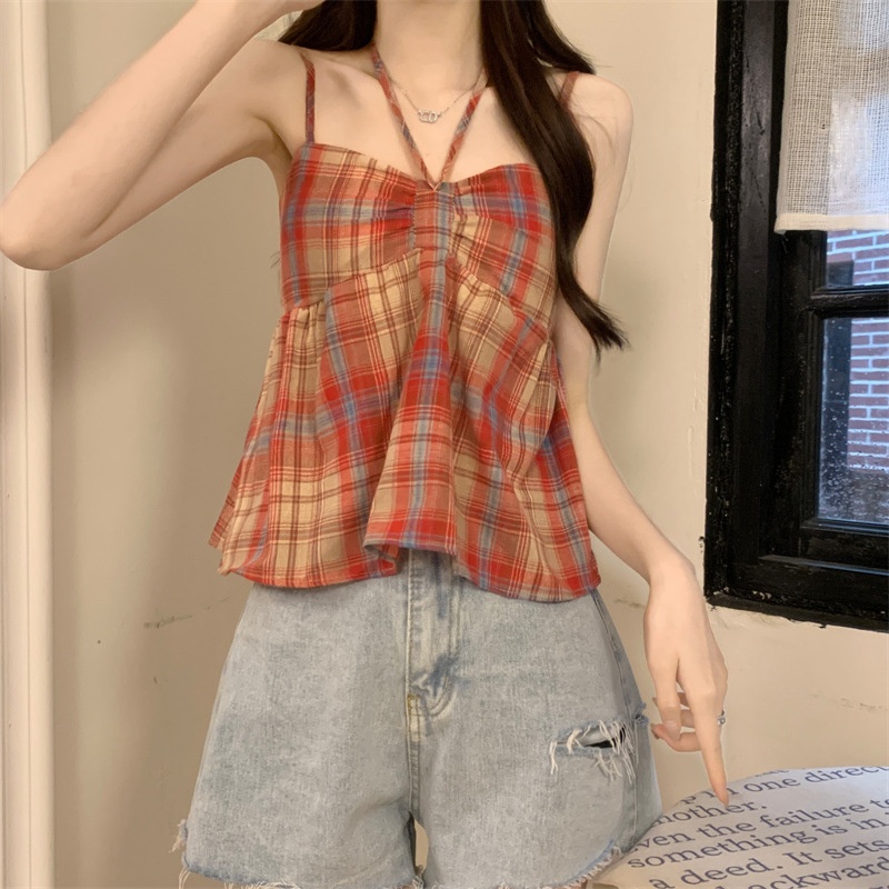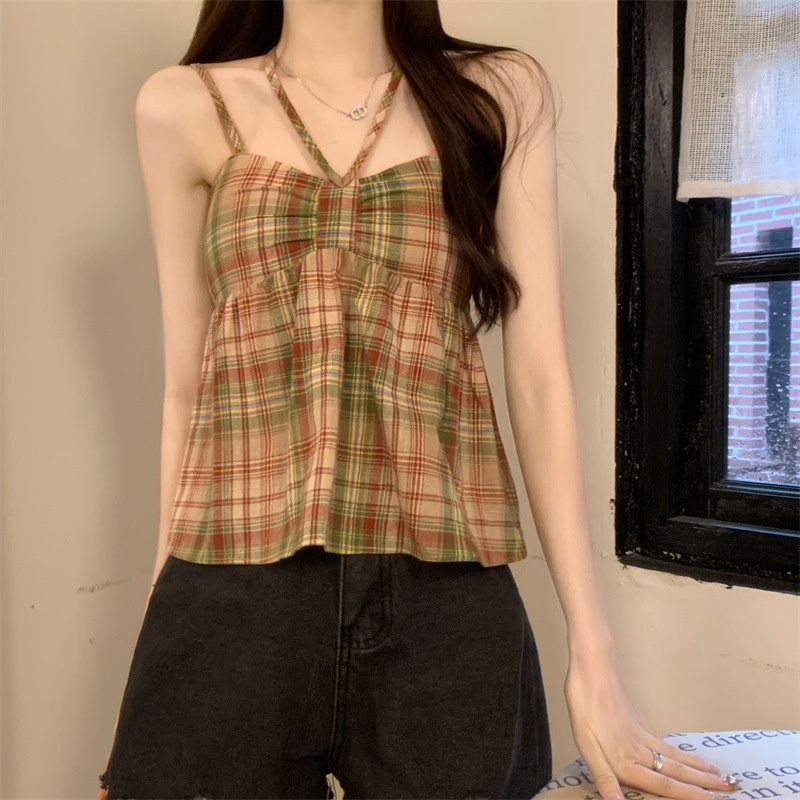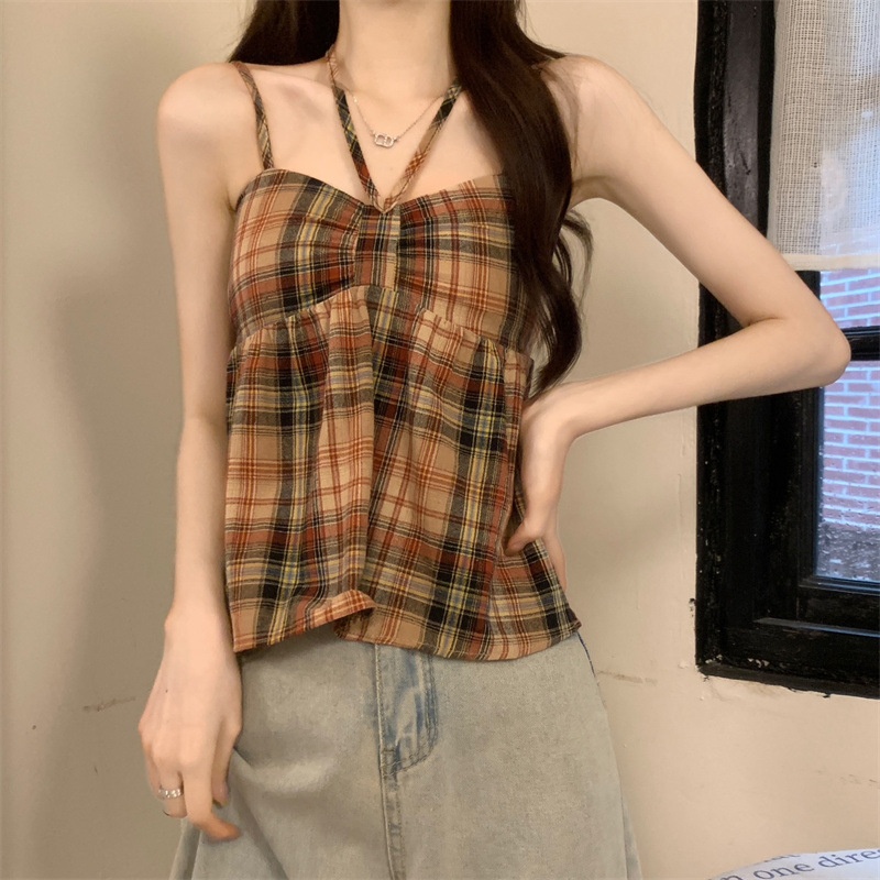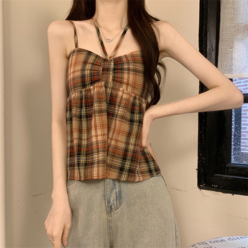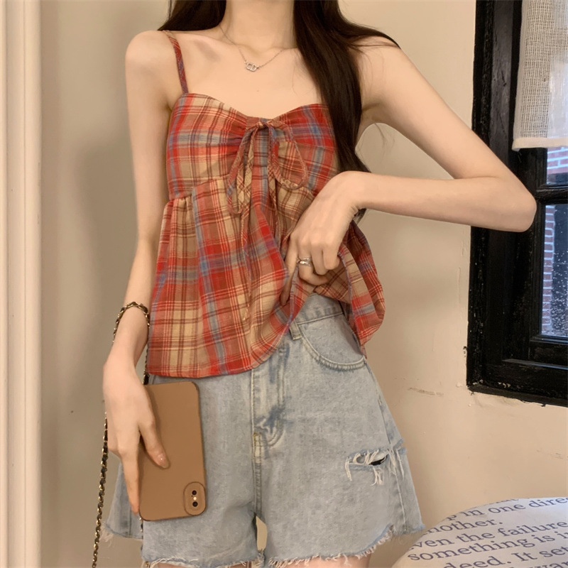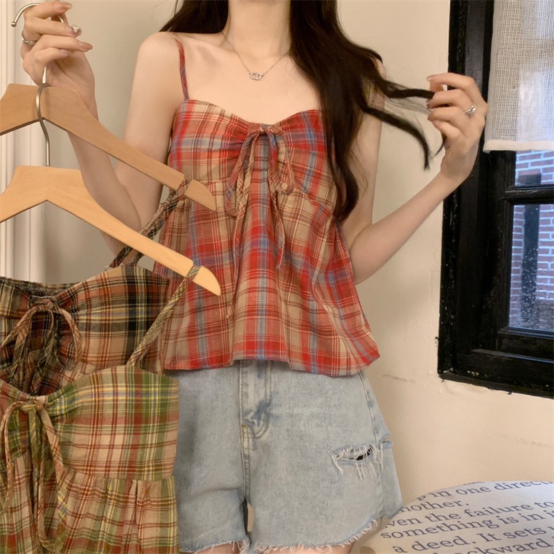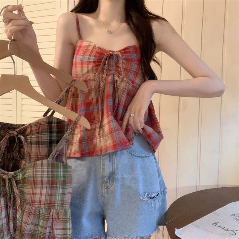 2024设计感复古格子绑带抹胸背心女夏季韩版洋气甜美短款外穿上衣