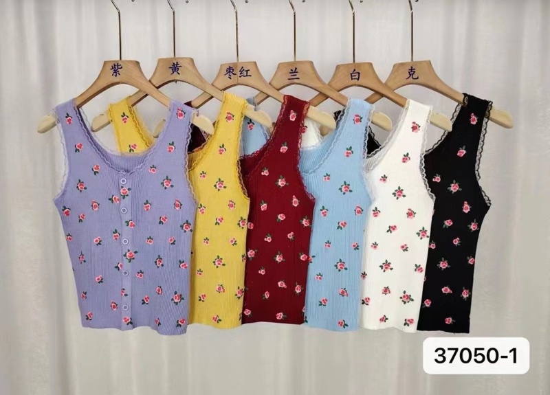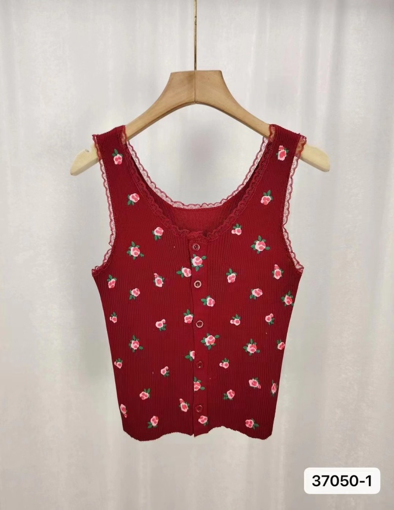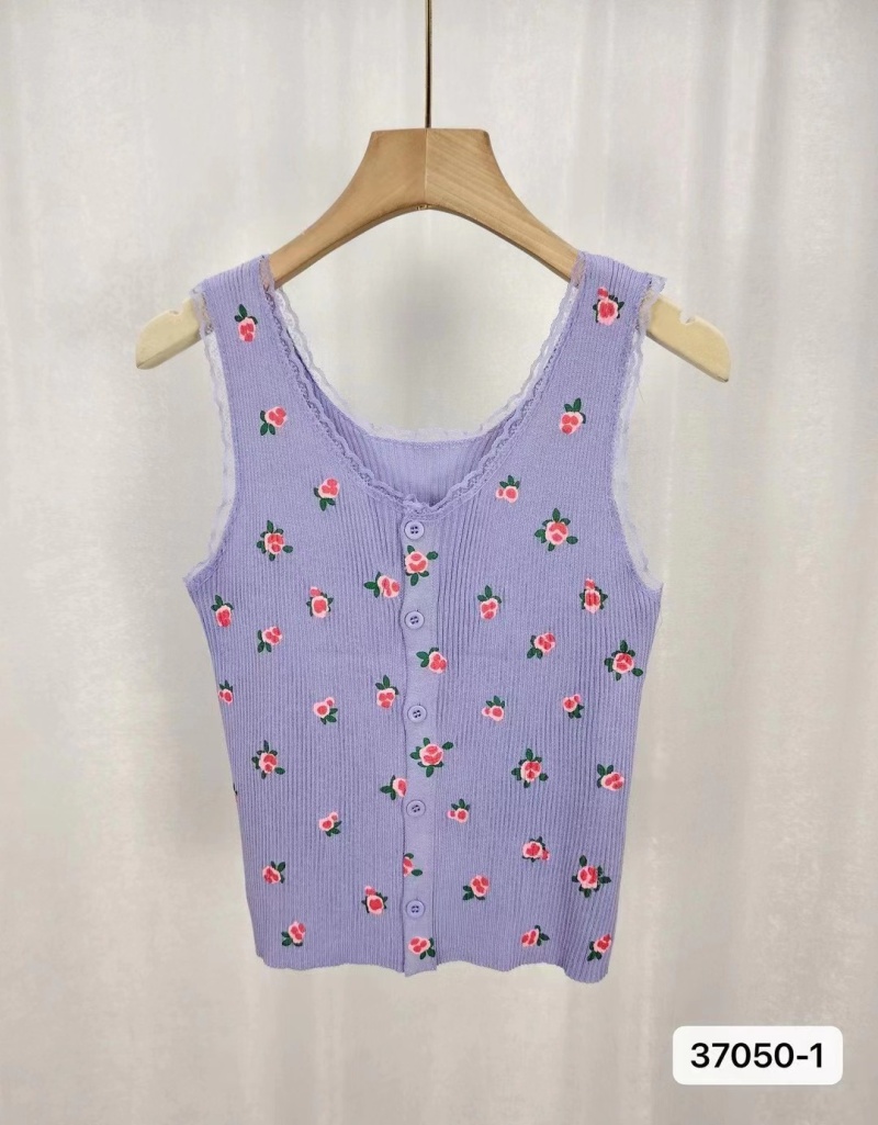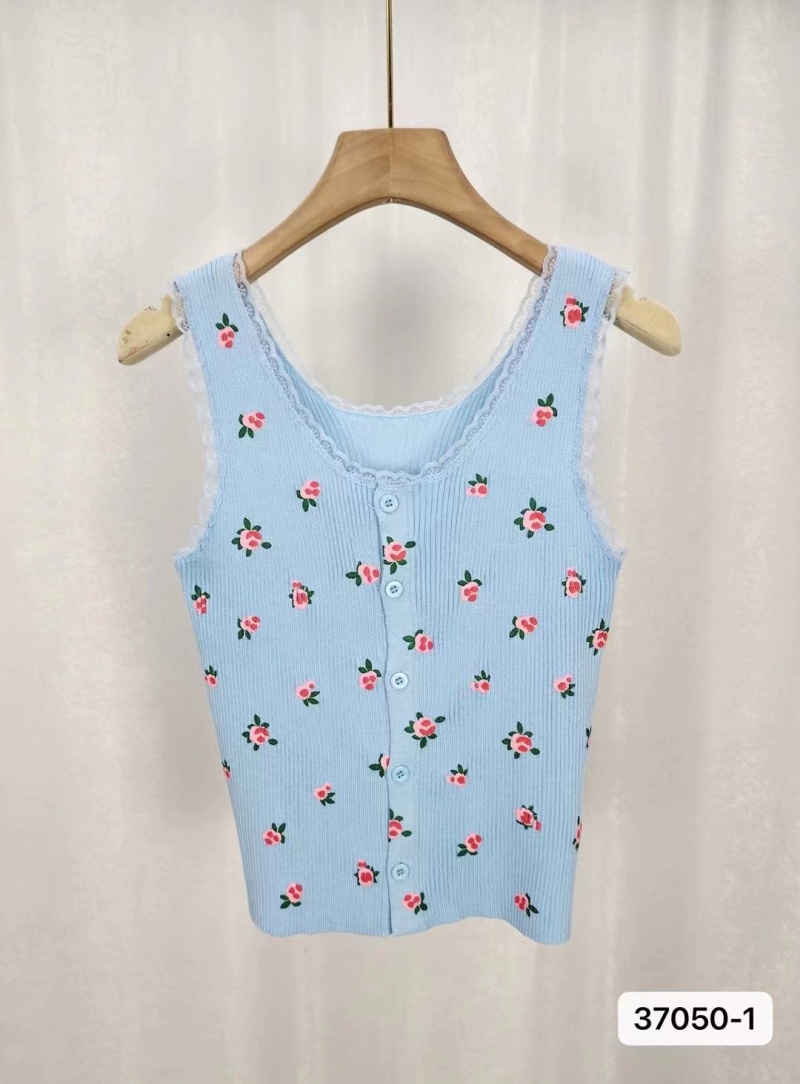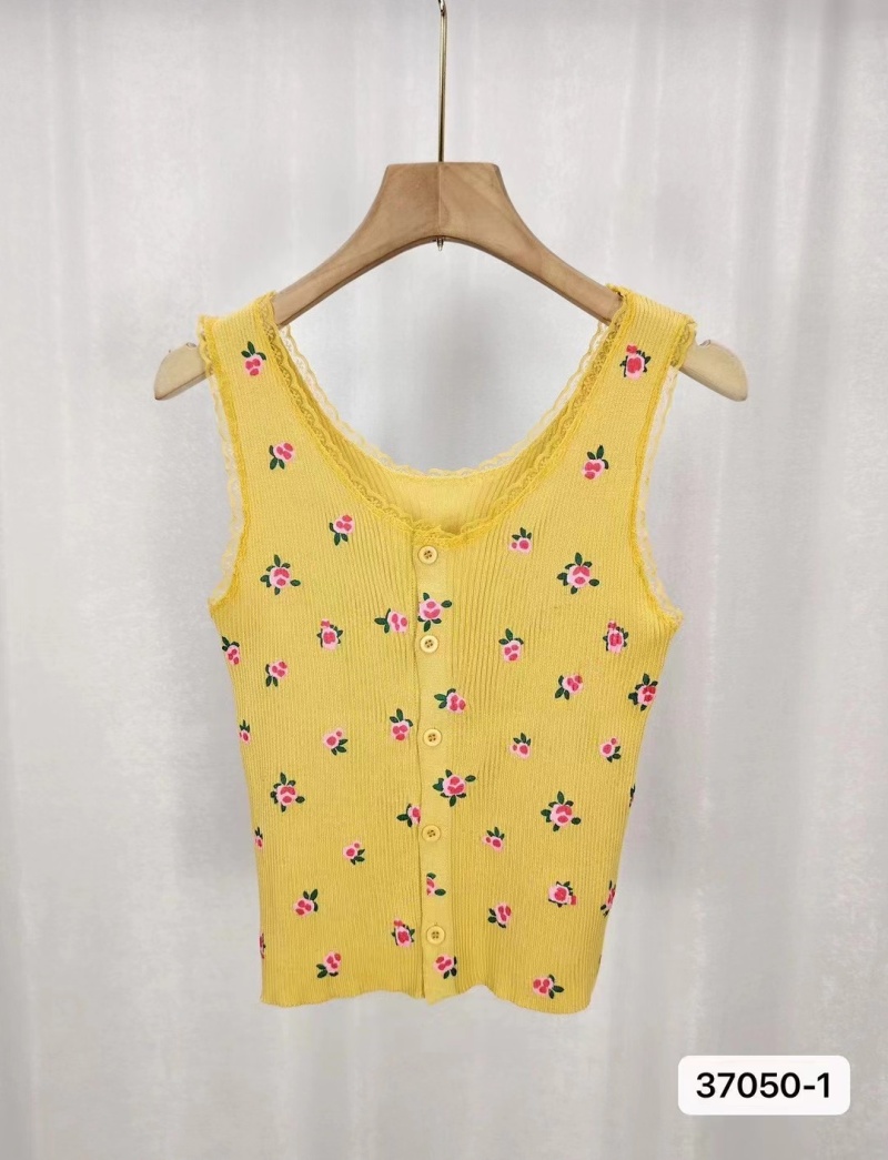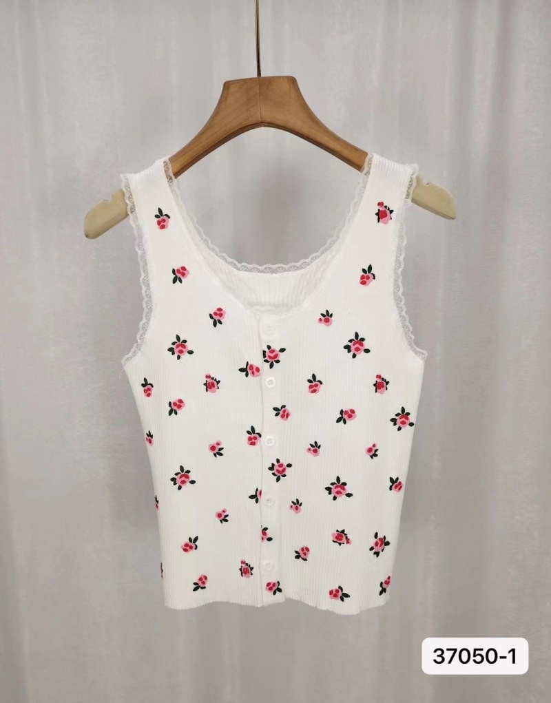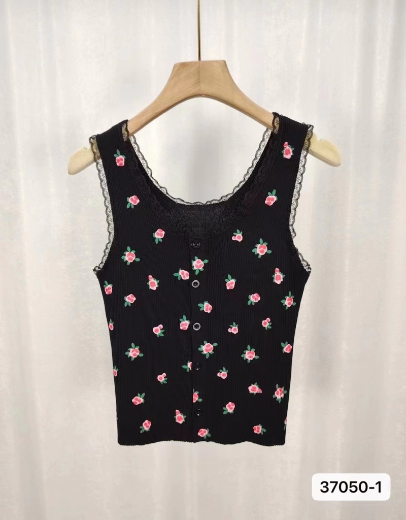 2024年夏季韩版新款洋气少女风显瘦蕾丝小碎花排扣背心百搭上衣女