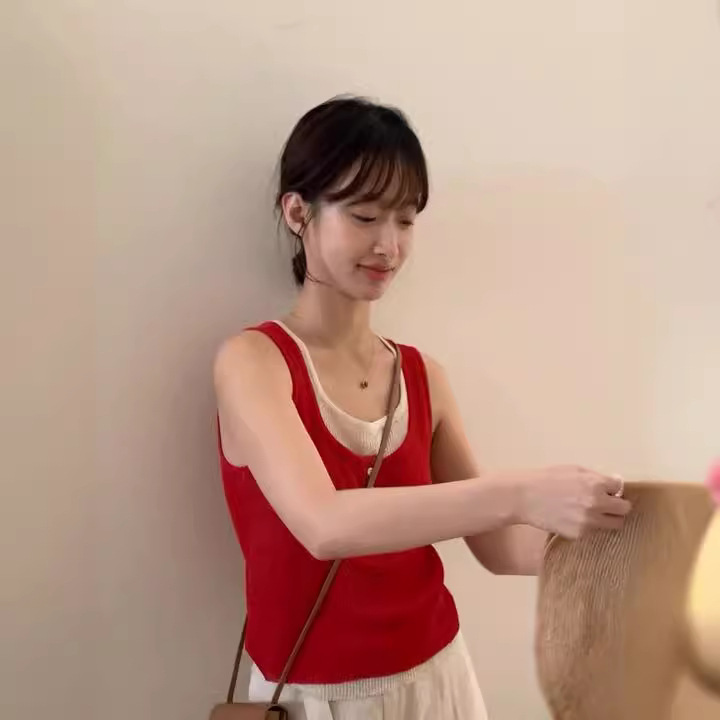 假两件撞色针织背心女夏新款博主风设计感百搭上衣外穿潮