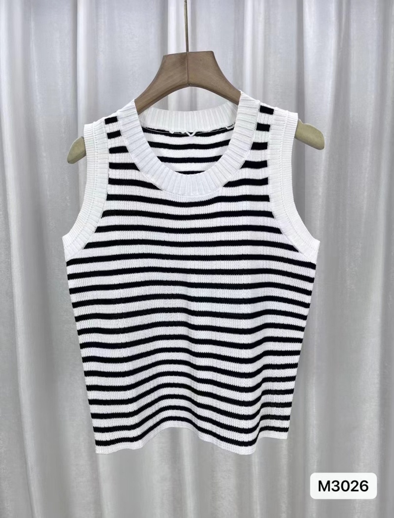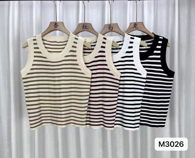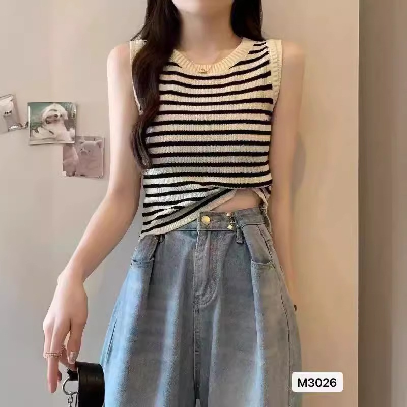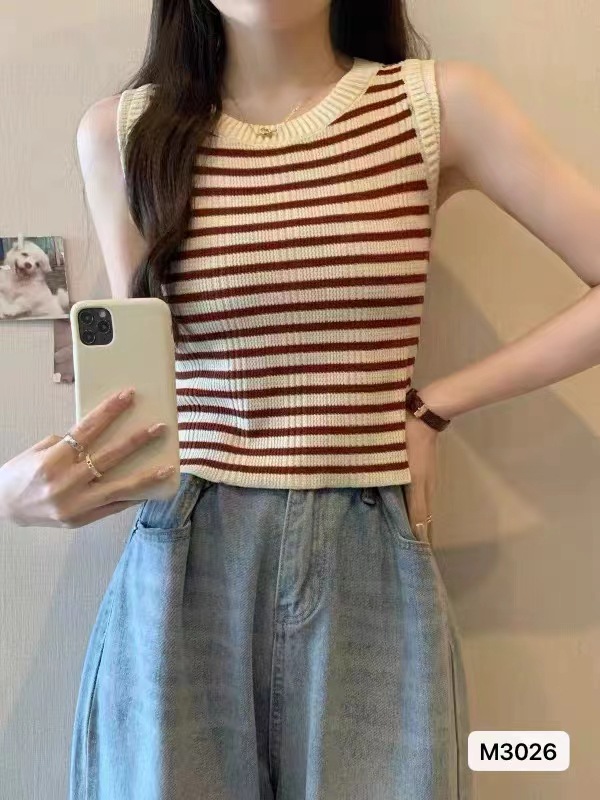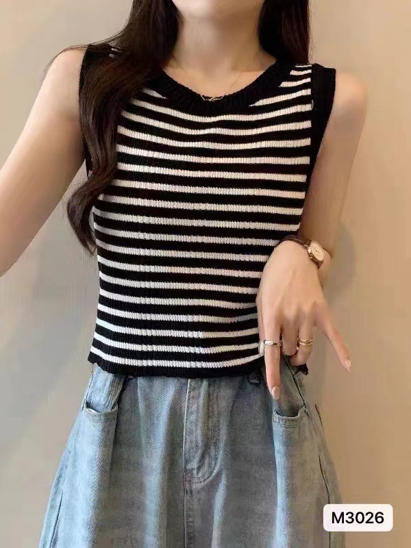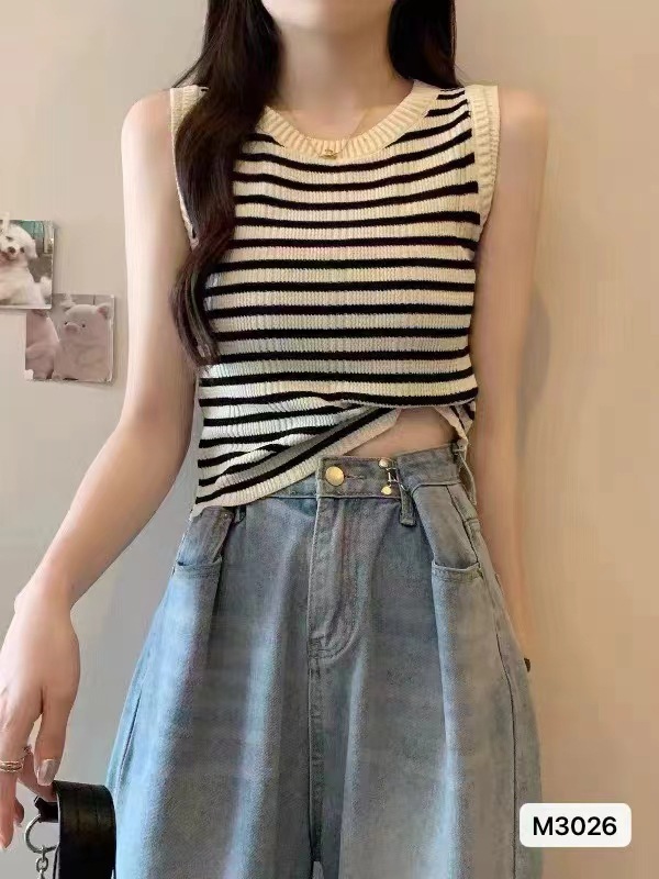 2024夏季新款修身气质小众高级感圆领撞色条纹显瘦背心短款上衣女