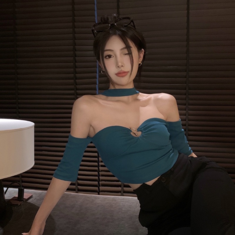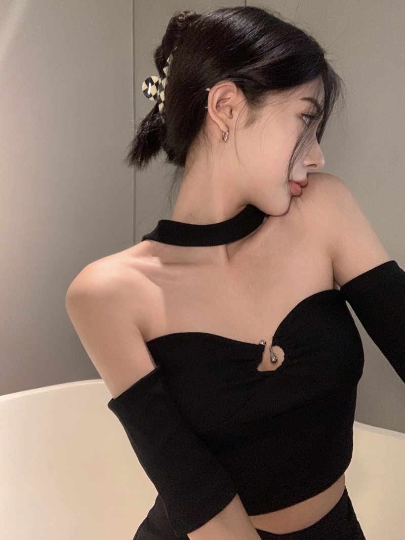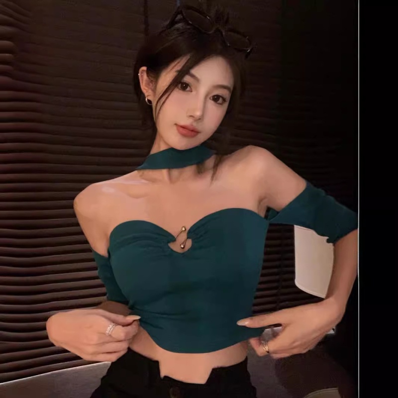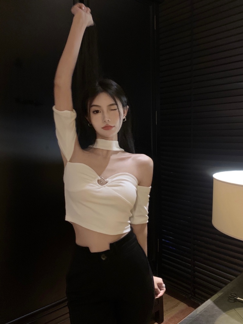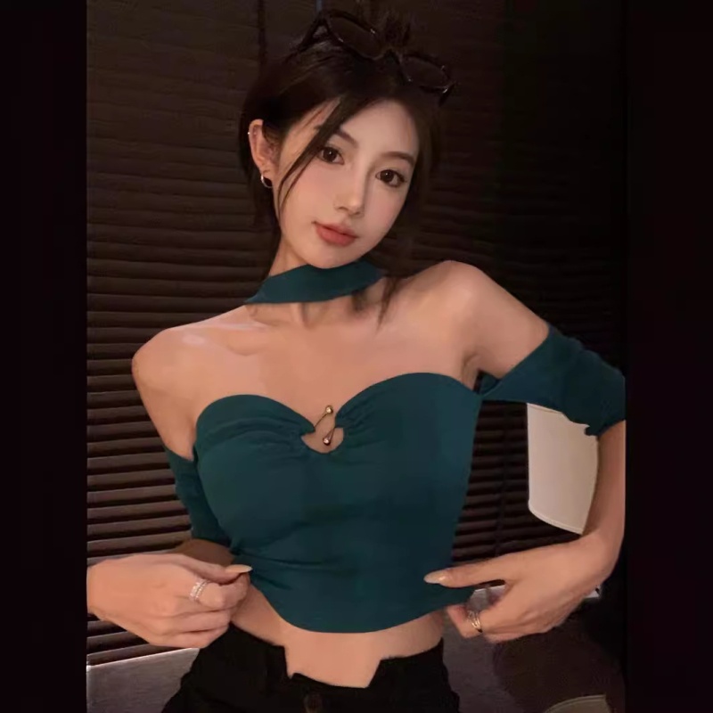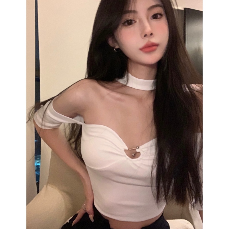 辣妹设计金属扣别致镂空设计感挂脖短袖新款韩版洋气挂脖性感上衣