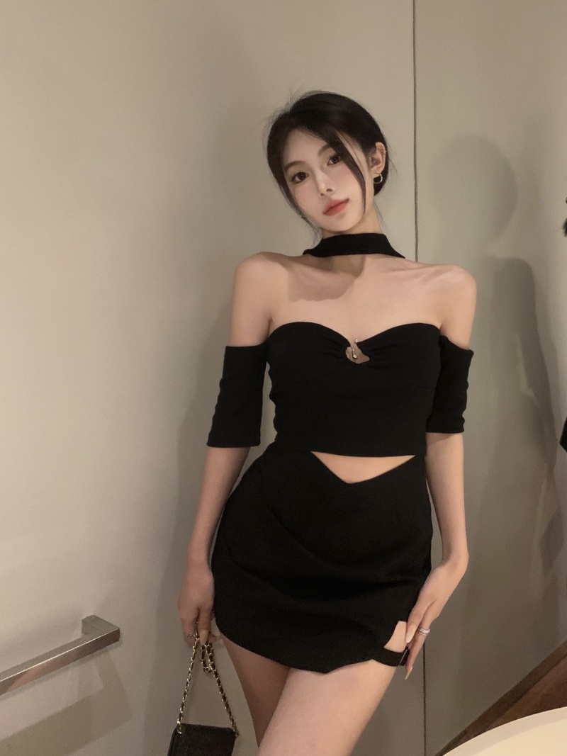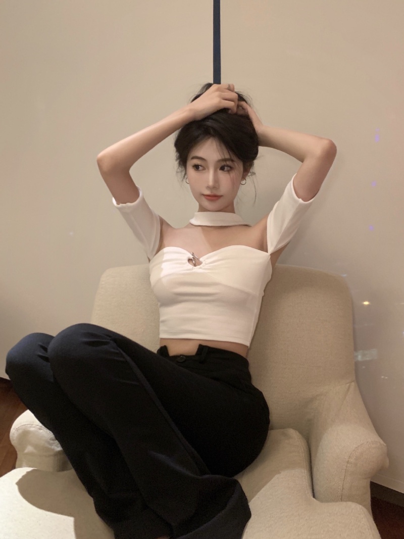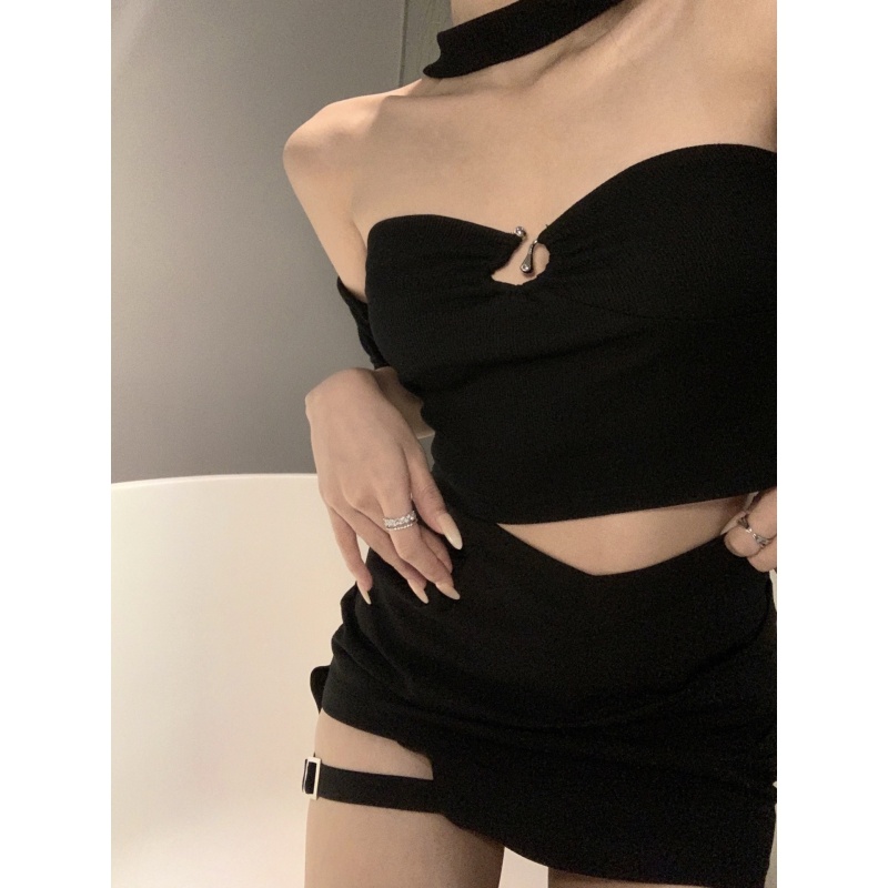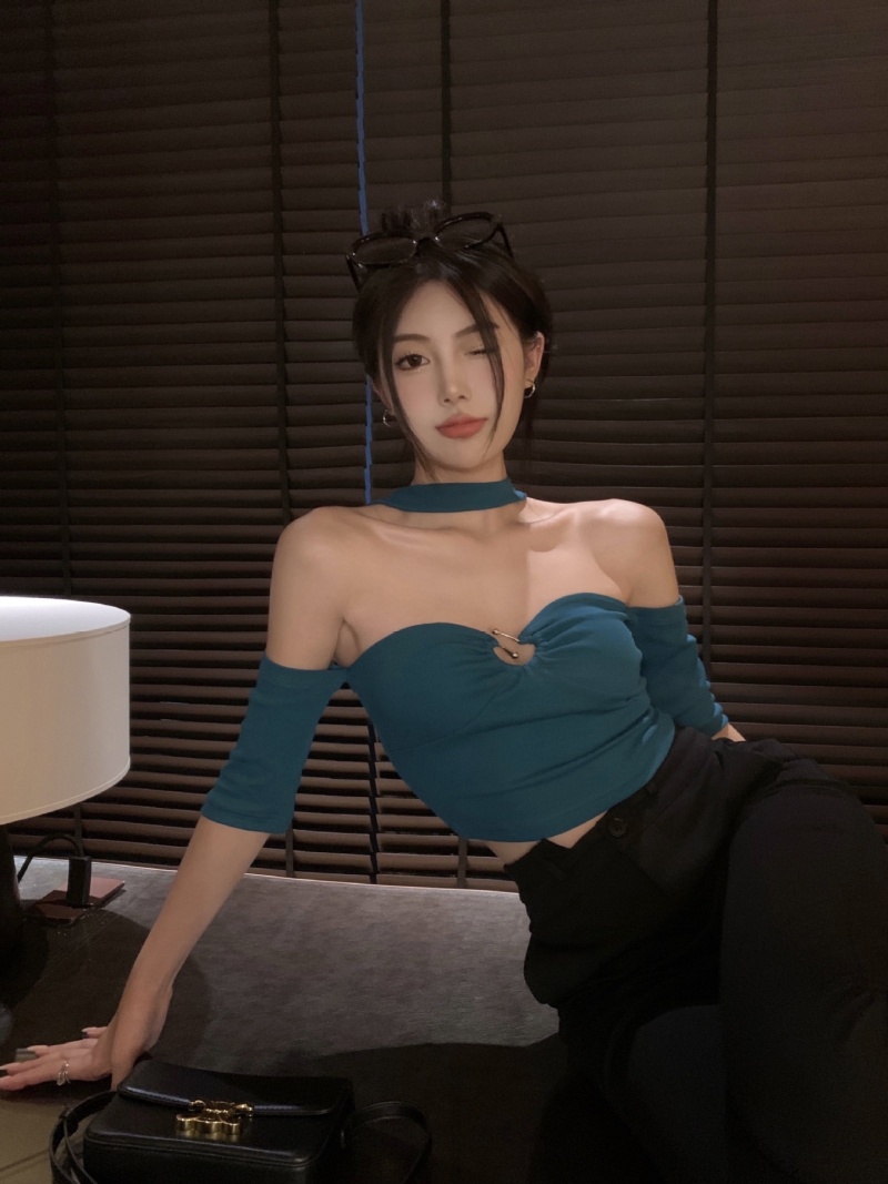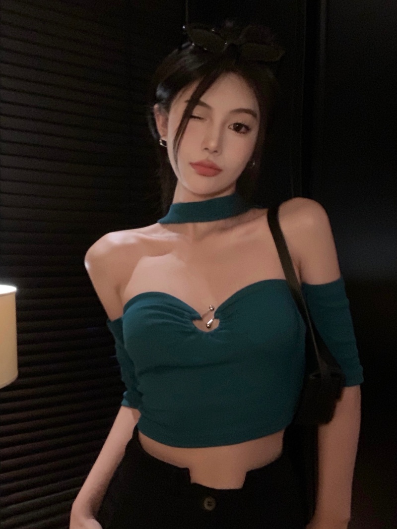 辣妹设计金属扣别致镂空设计感挂脖短袖新款韩版洋气挂脖性感上衣