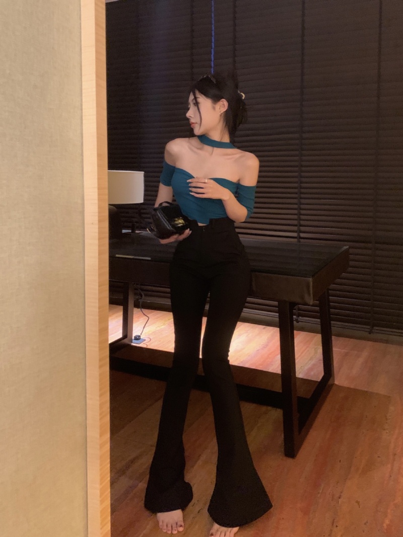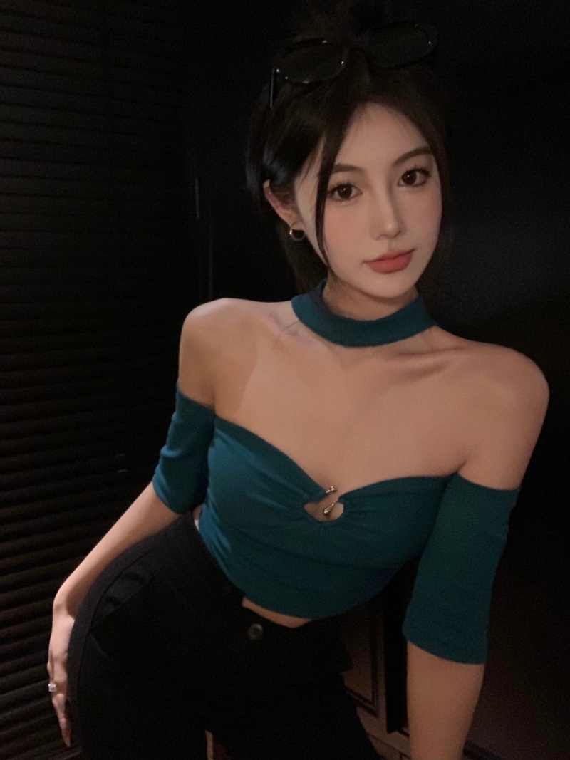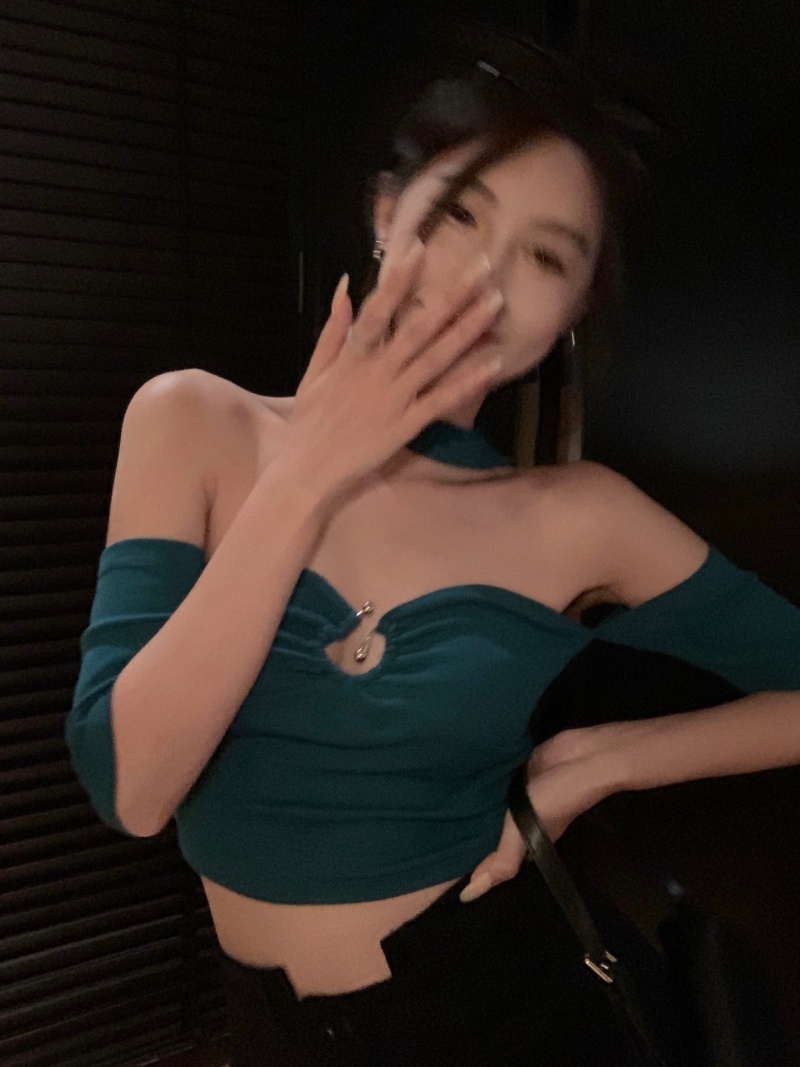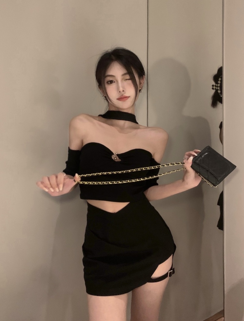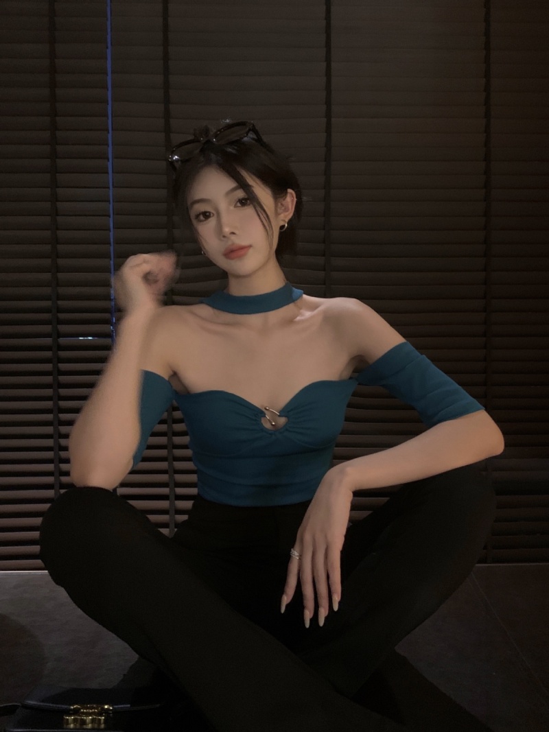 辣妹设计金属扣别致镂空设计感挂脖短袖新款韩版洋气挂脖性感上衣
