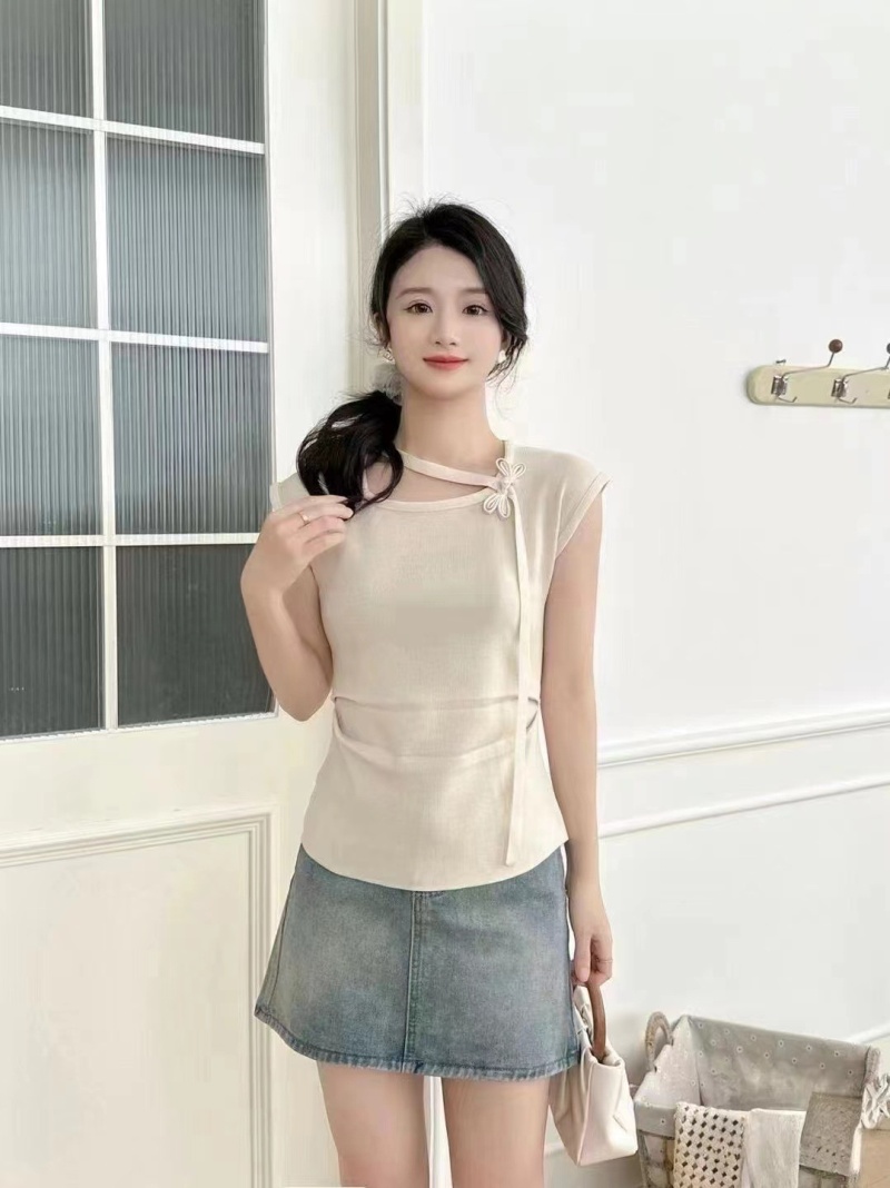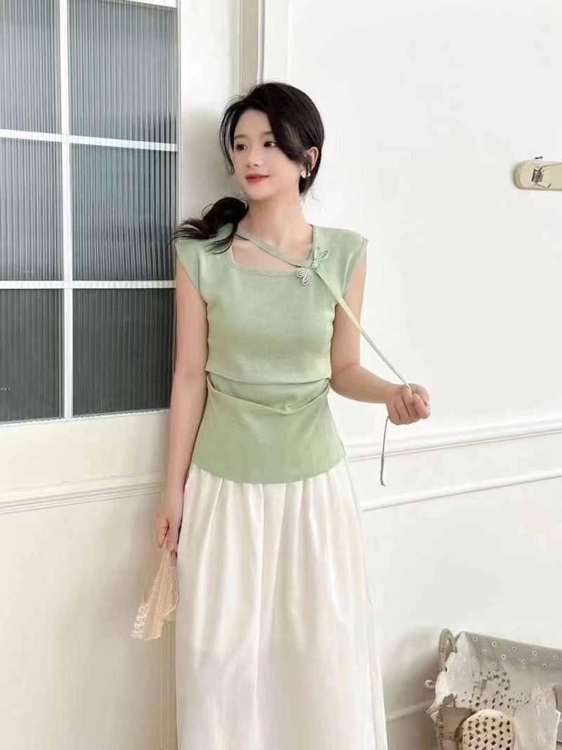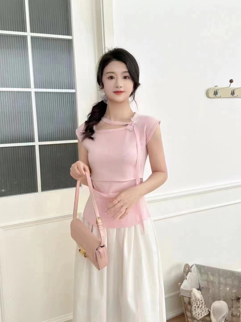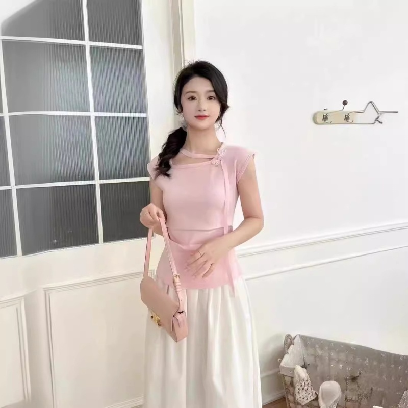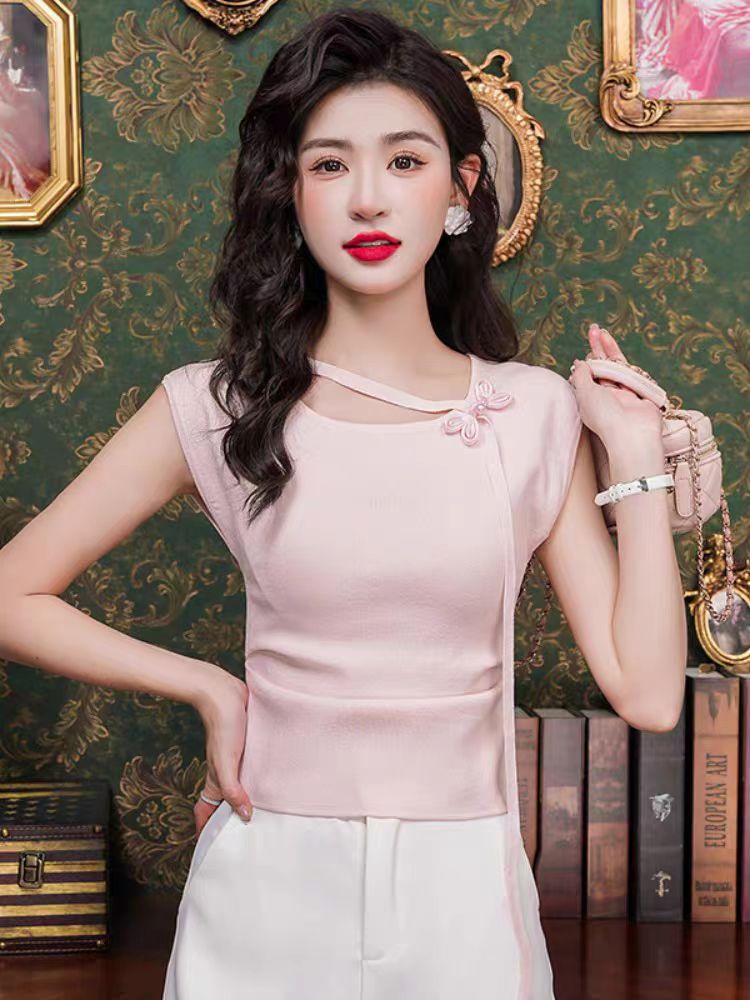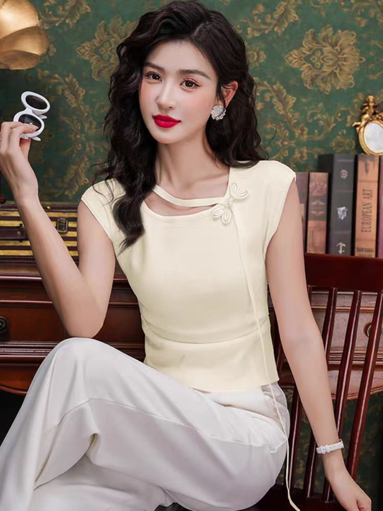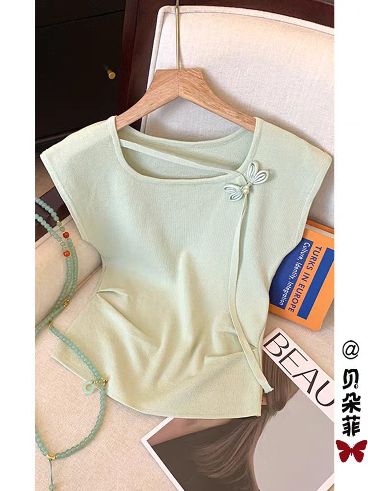 现货 新中式国风针织T恤女夏季新款斜襟盘扣无袖内搭上衣