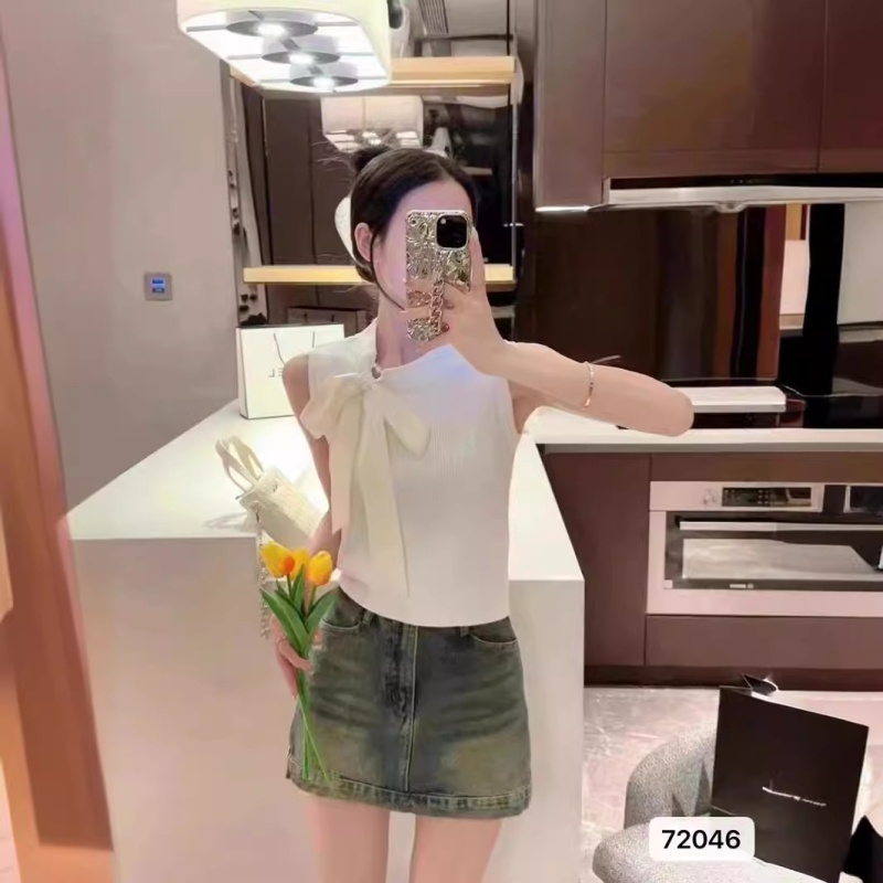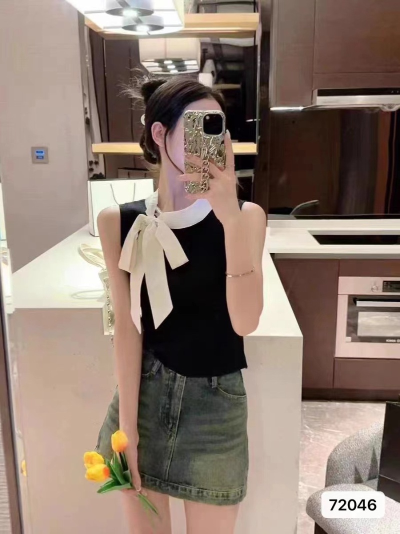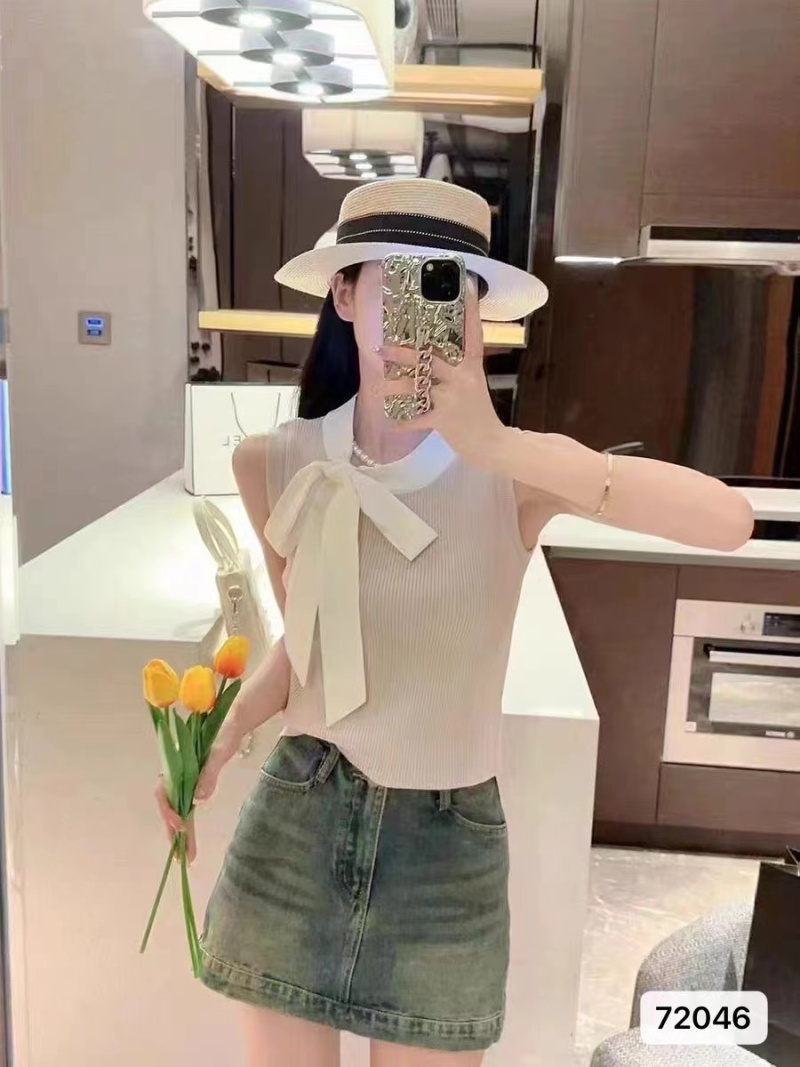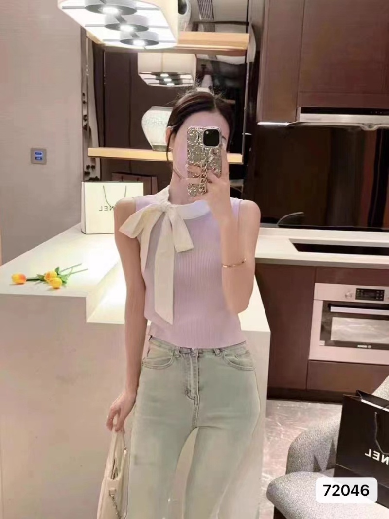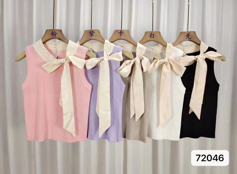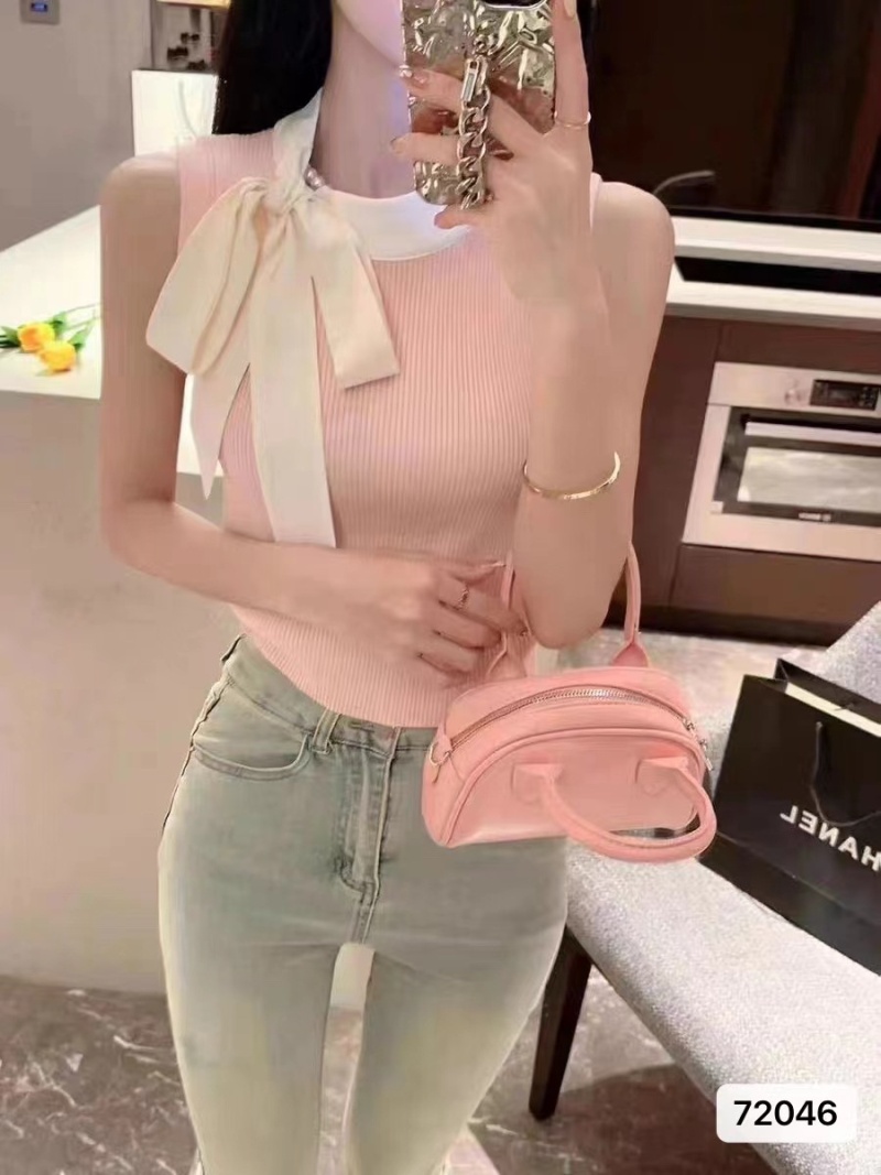 现货针织大码女装小香风立领蝴蝶结系带百搭背心
