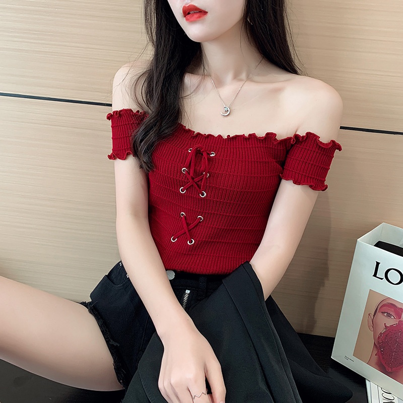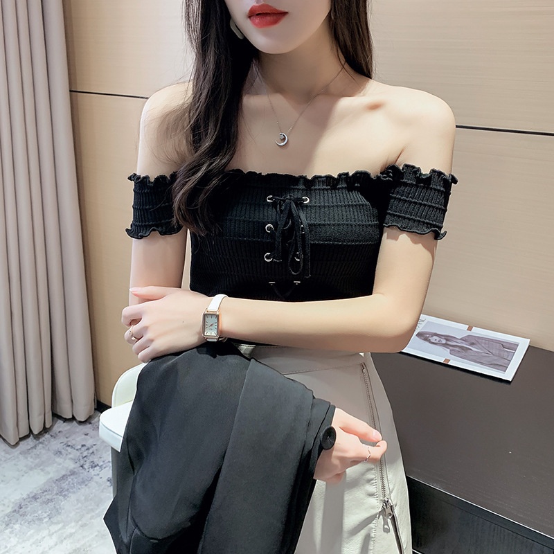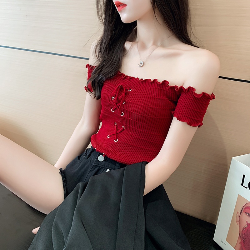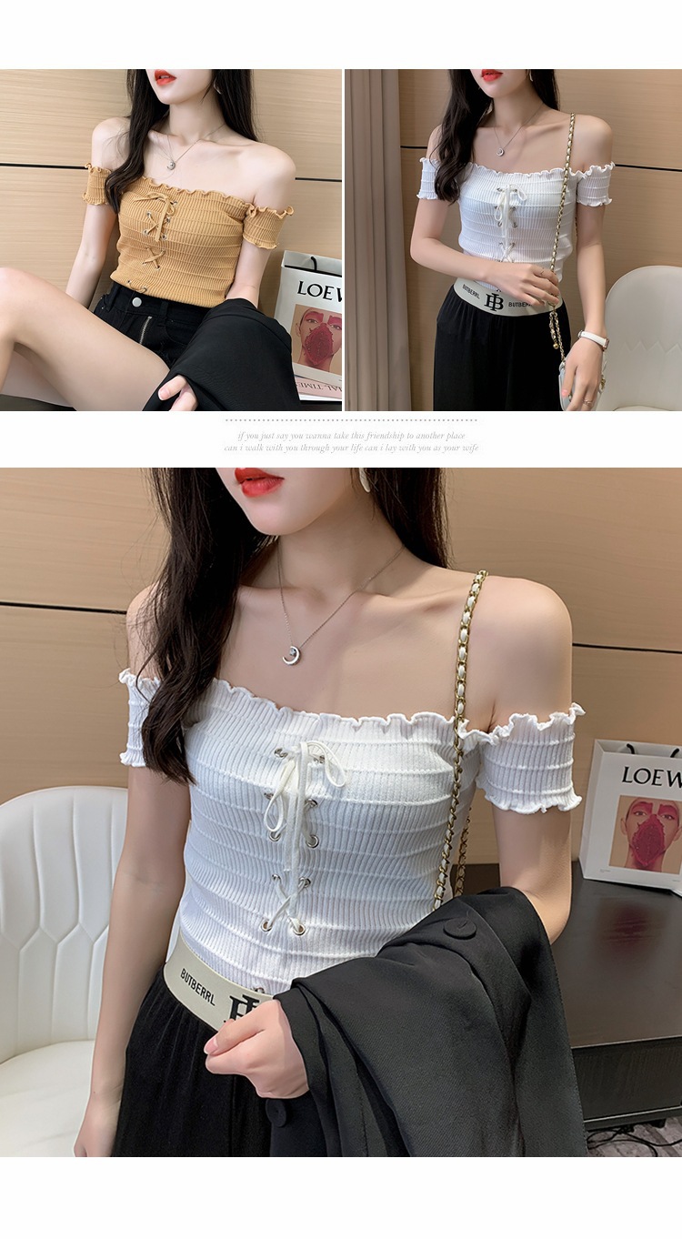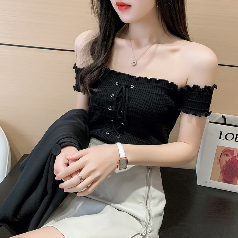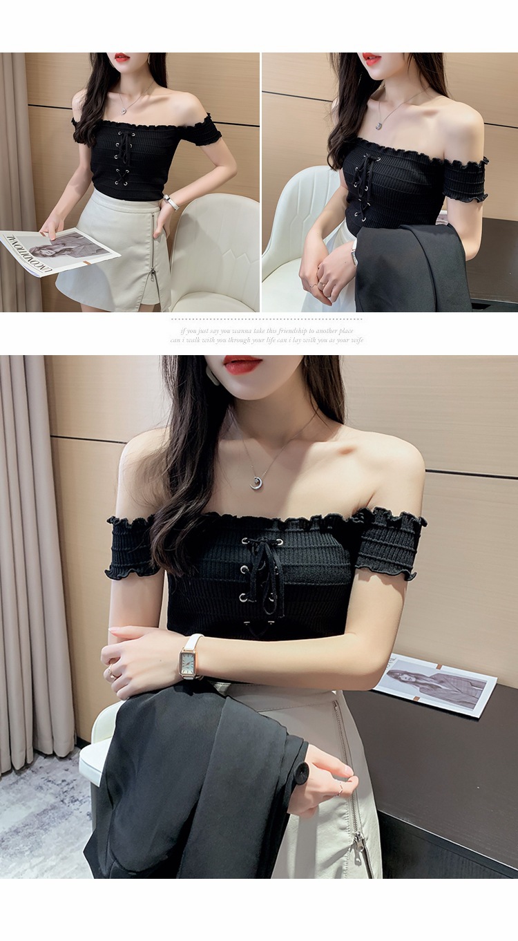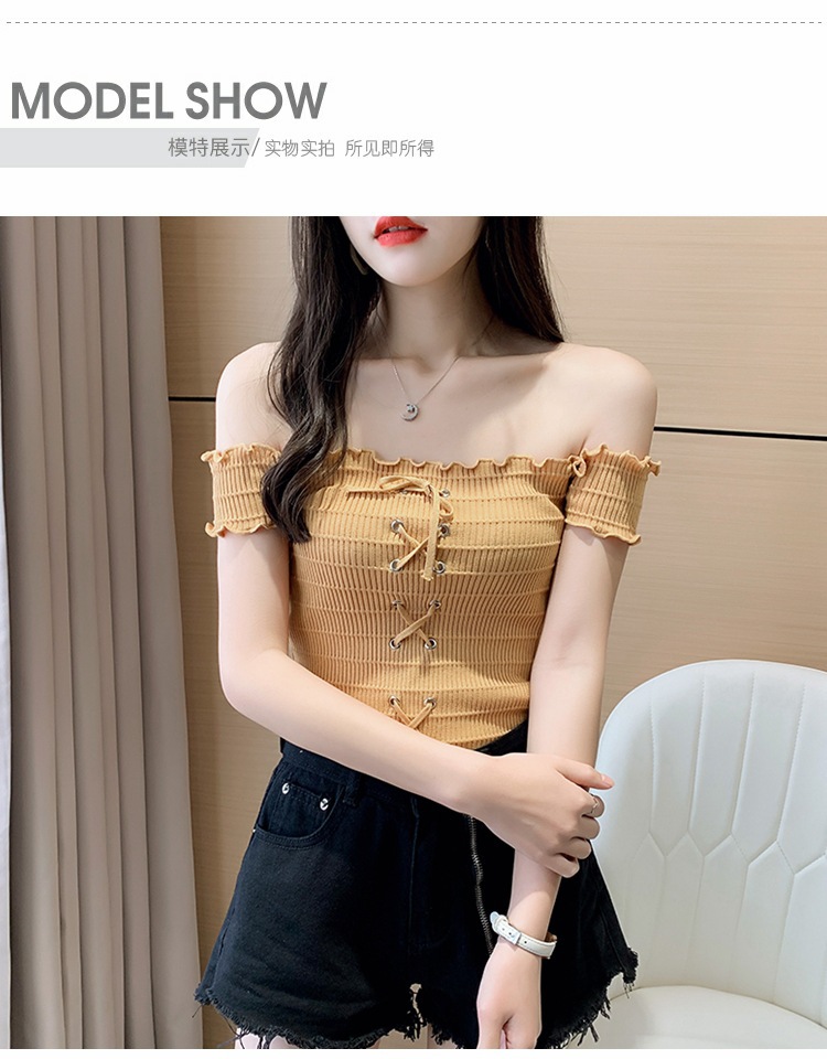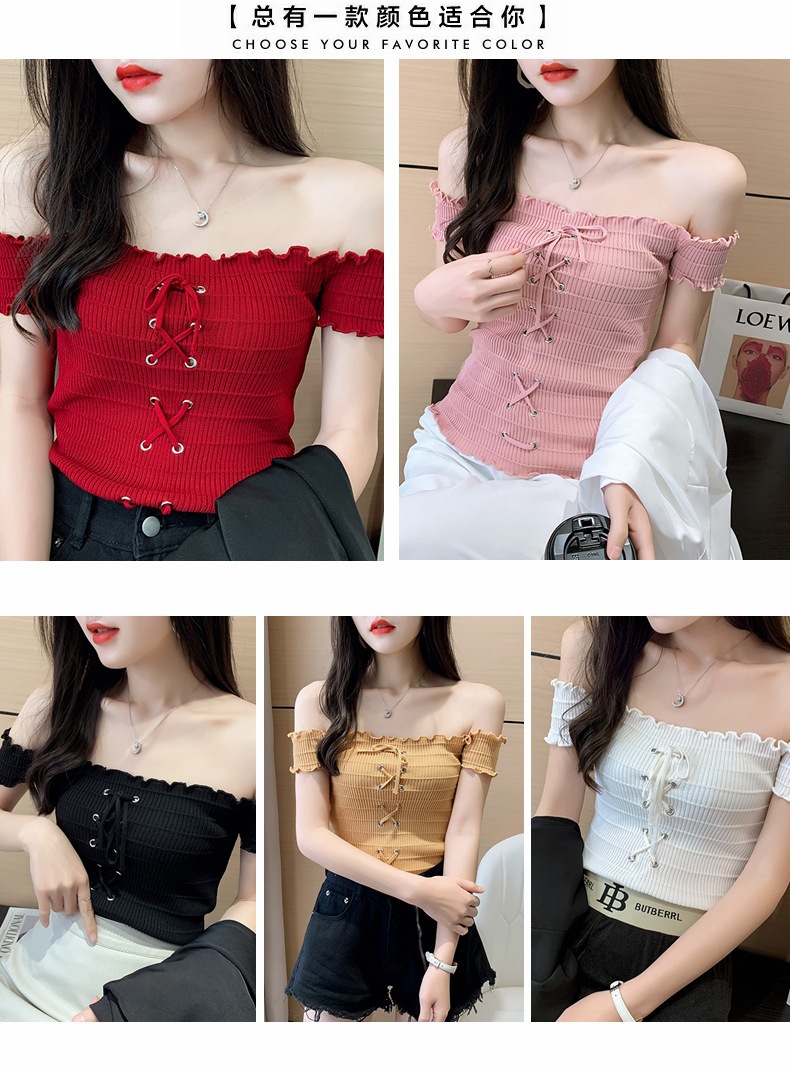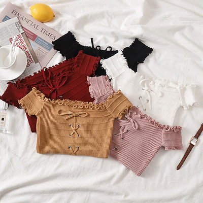 网红度假风一字领上衣女小清新露肩甜美木耳边短袖T恤修身显瘦夏