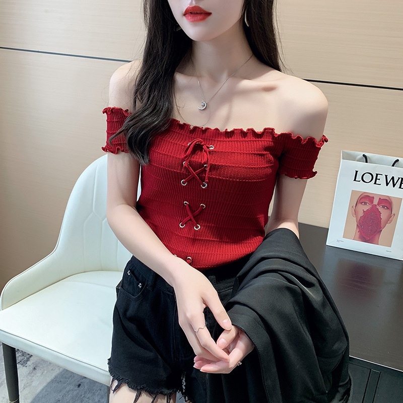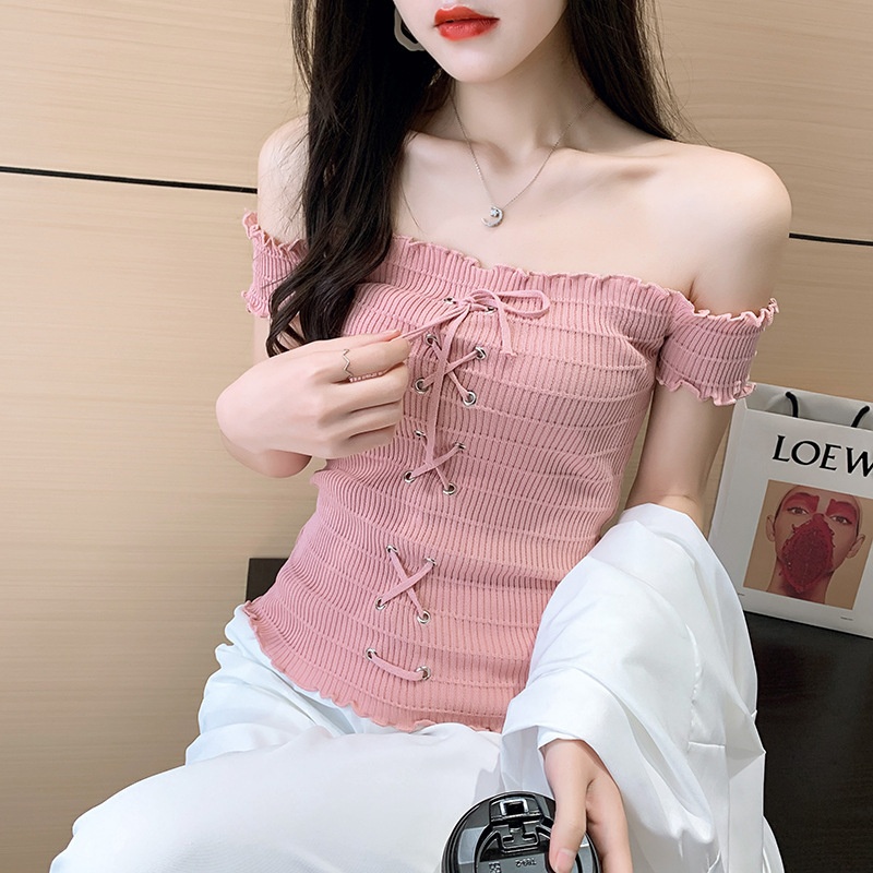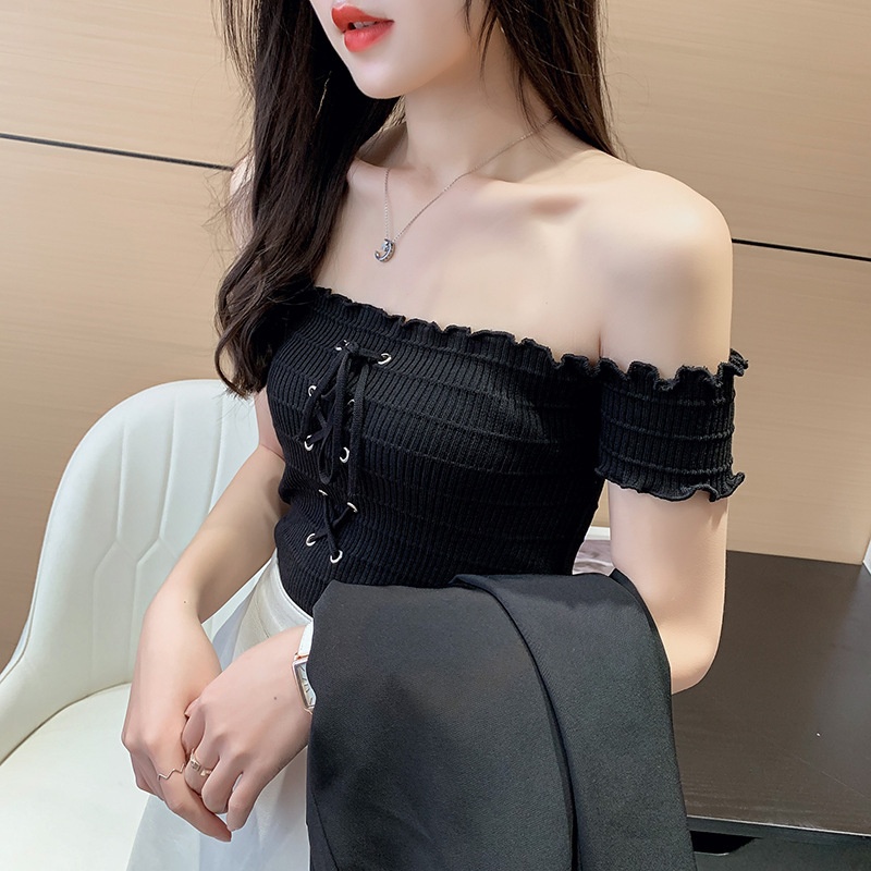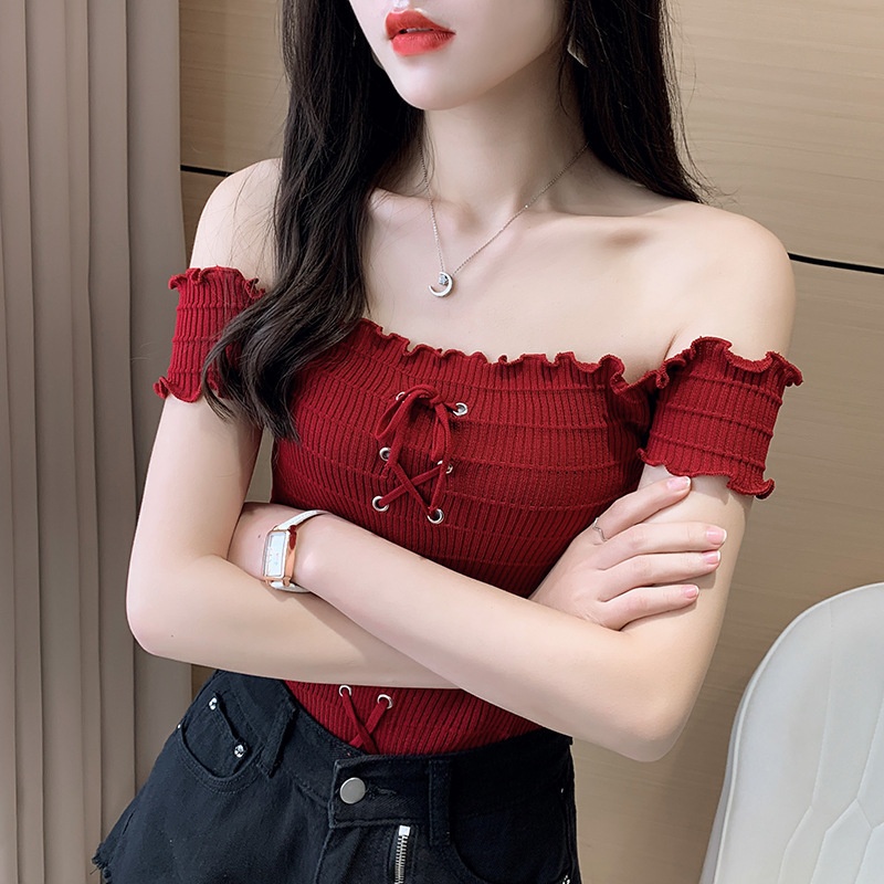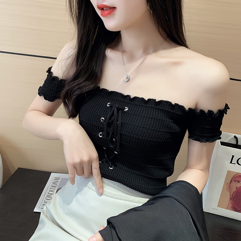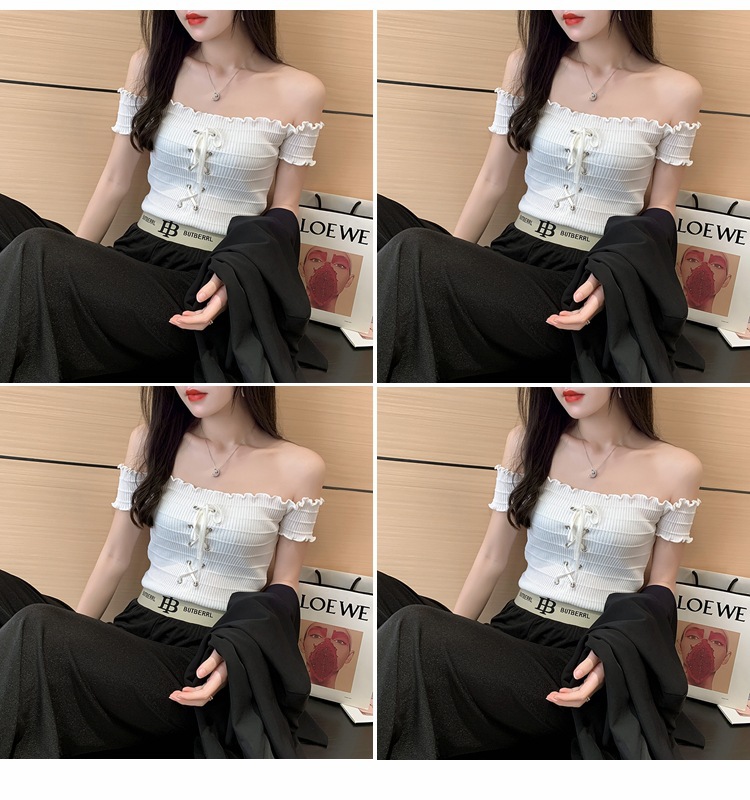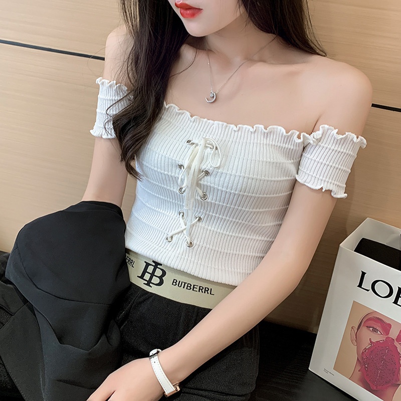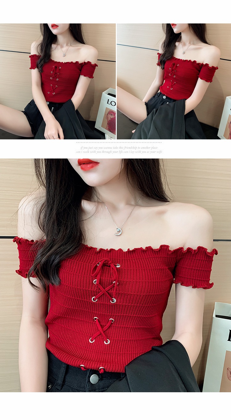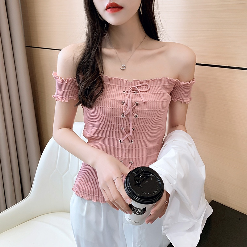 网红度假风一字领上衣女小清新露肩甜美木耳边短袖T恤修身显瘦夏
