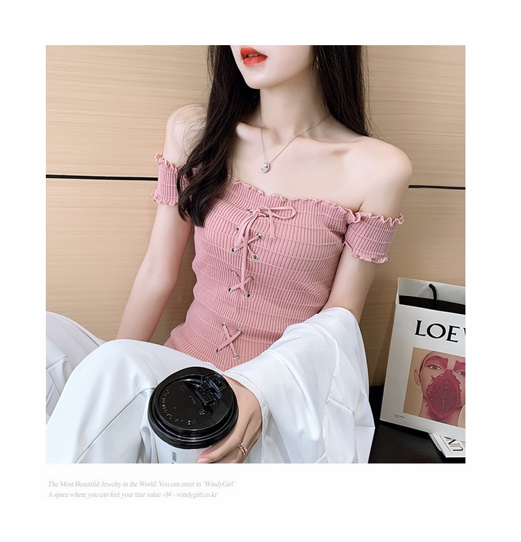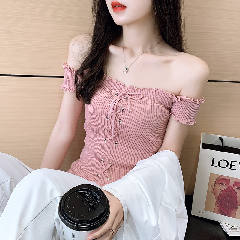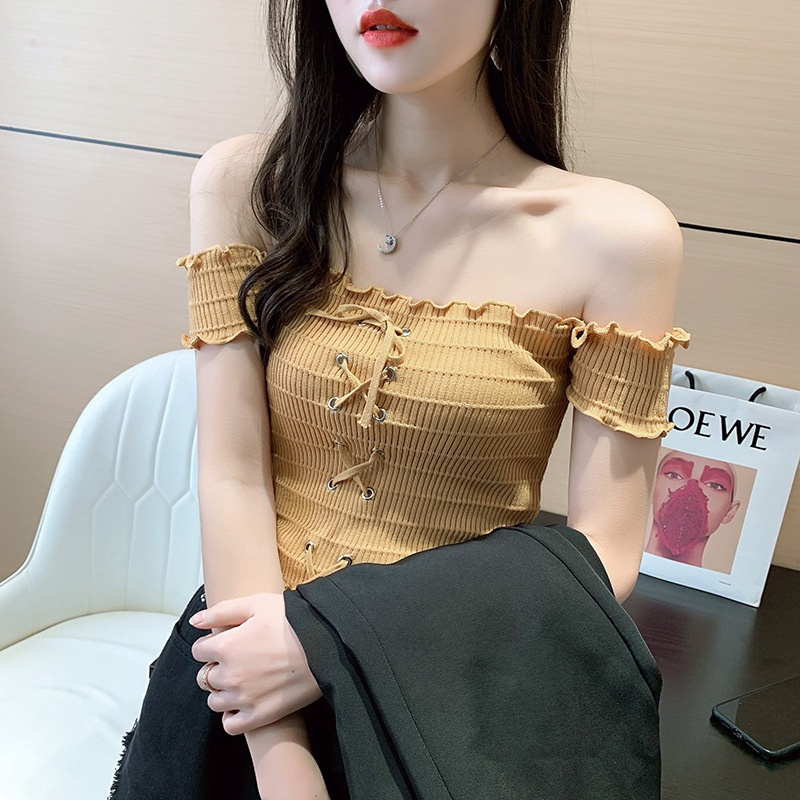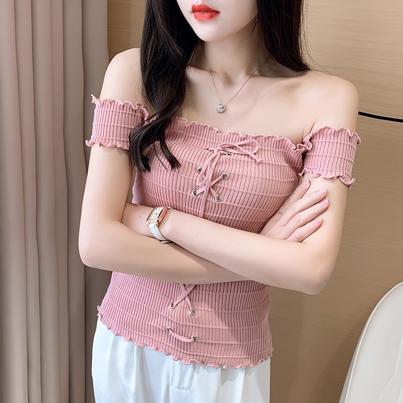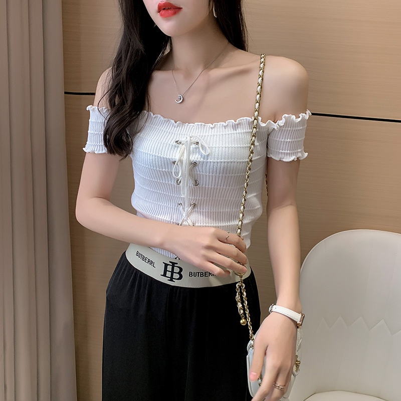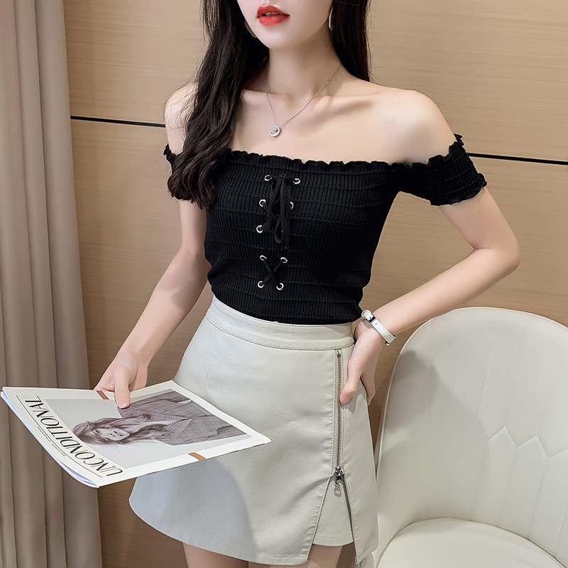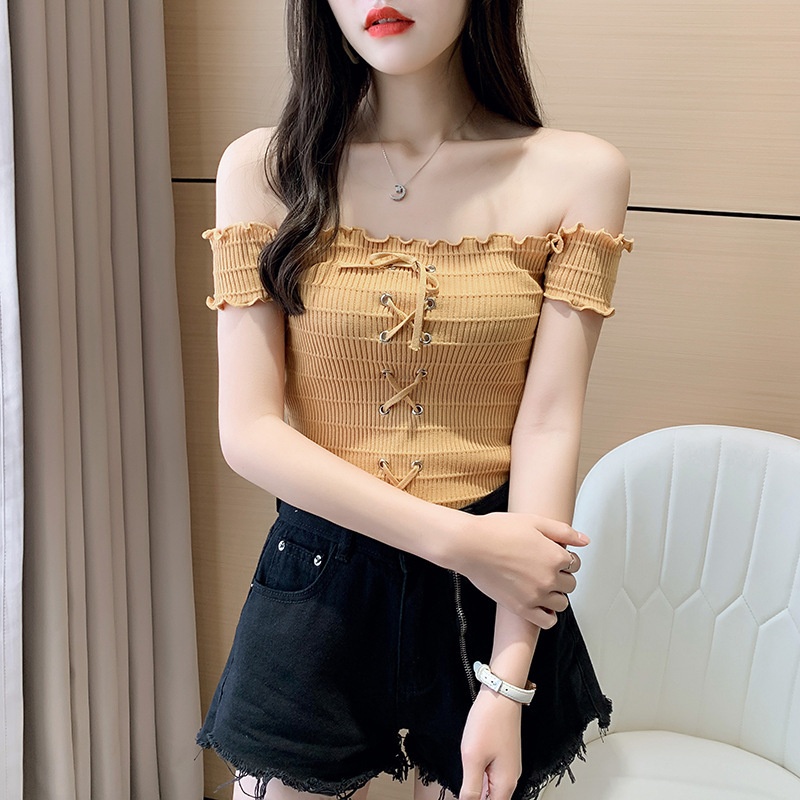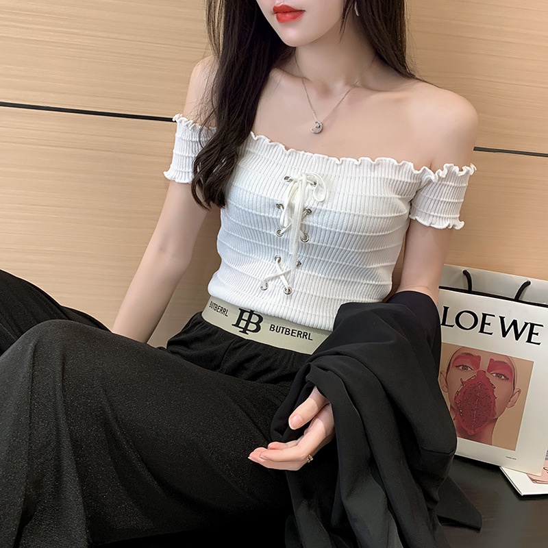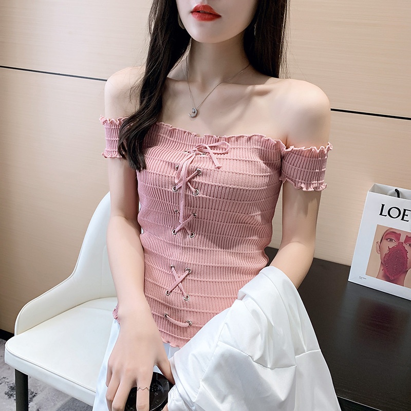 网红度假风一字领上衣女小清新露肩甜美木耳边短袖T恤修身显瘦夏