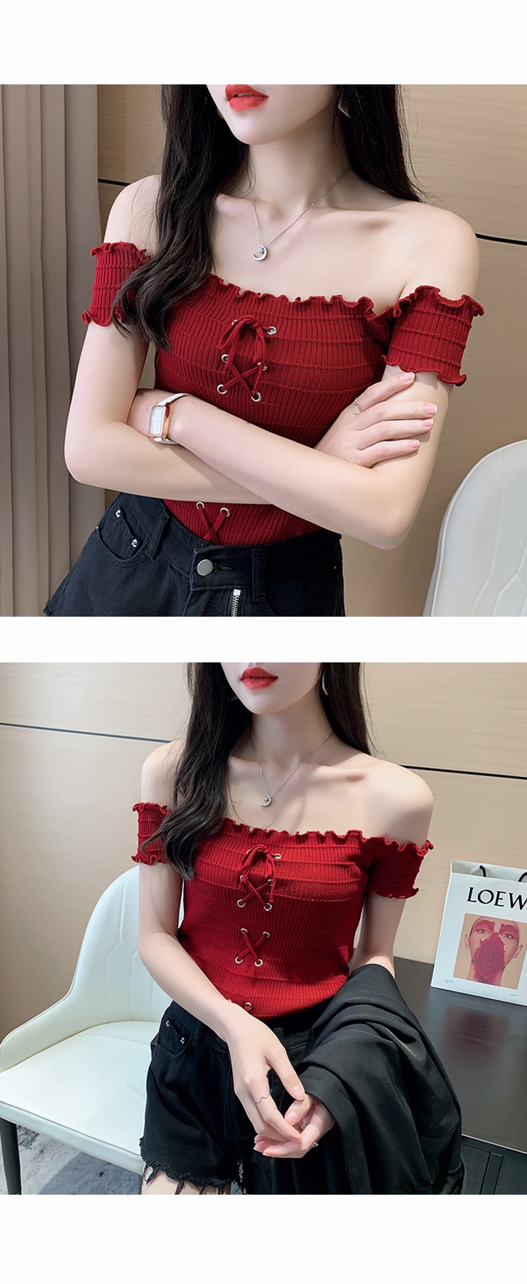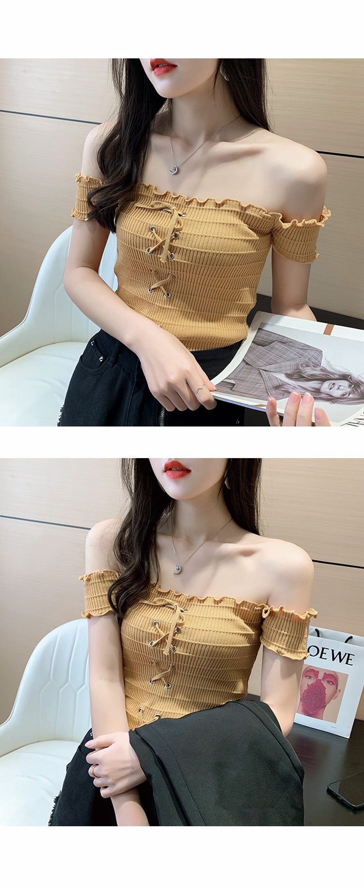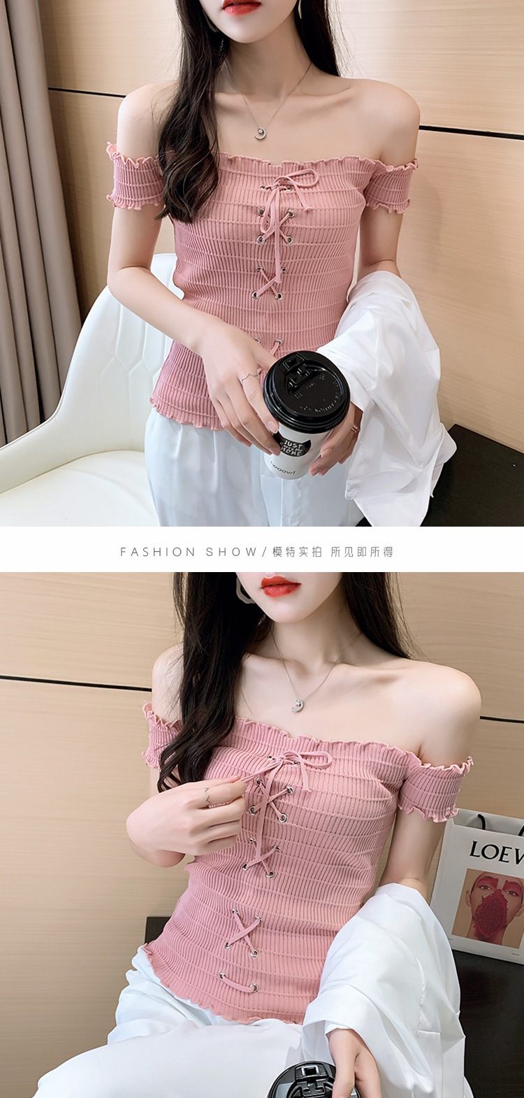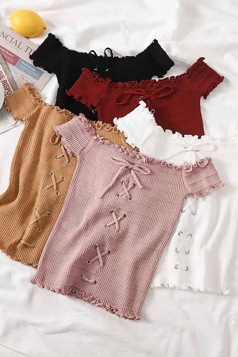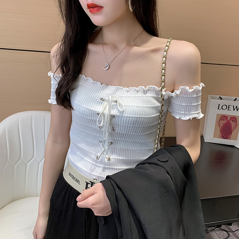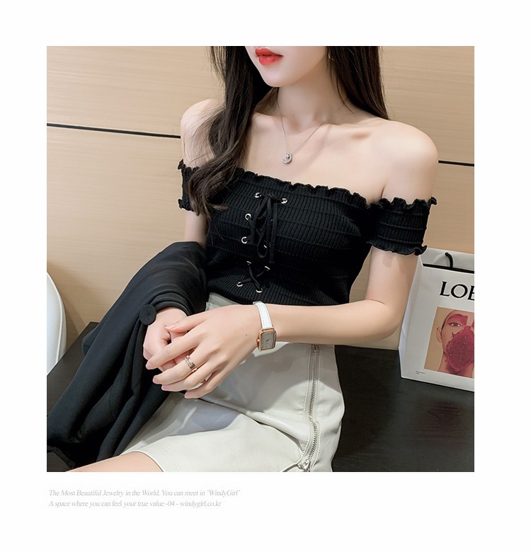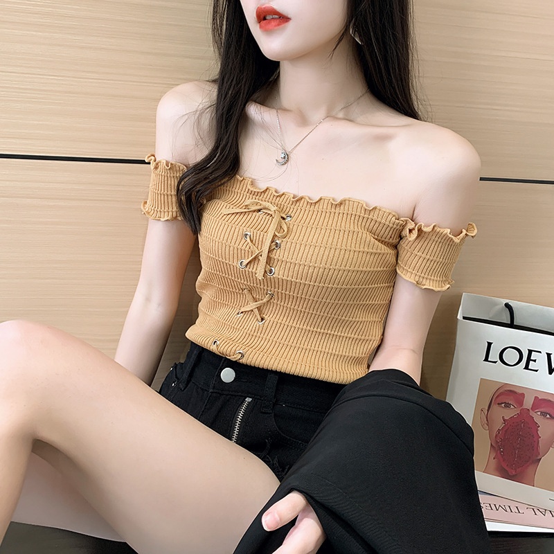 网红度假风一字领上衣女小清新露肩甜美木耳边短袖T恤修身显瘦夏