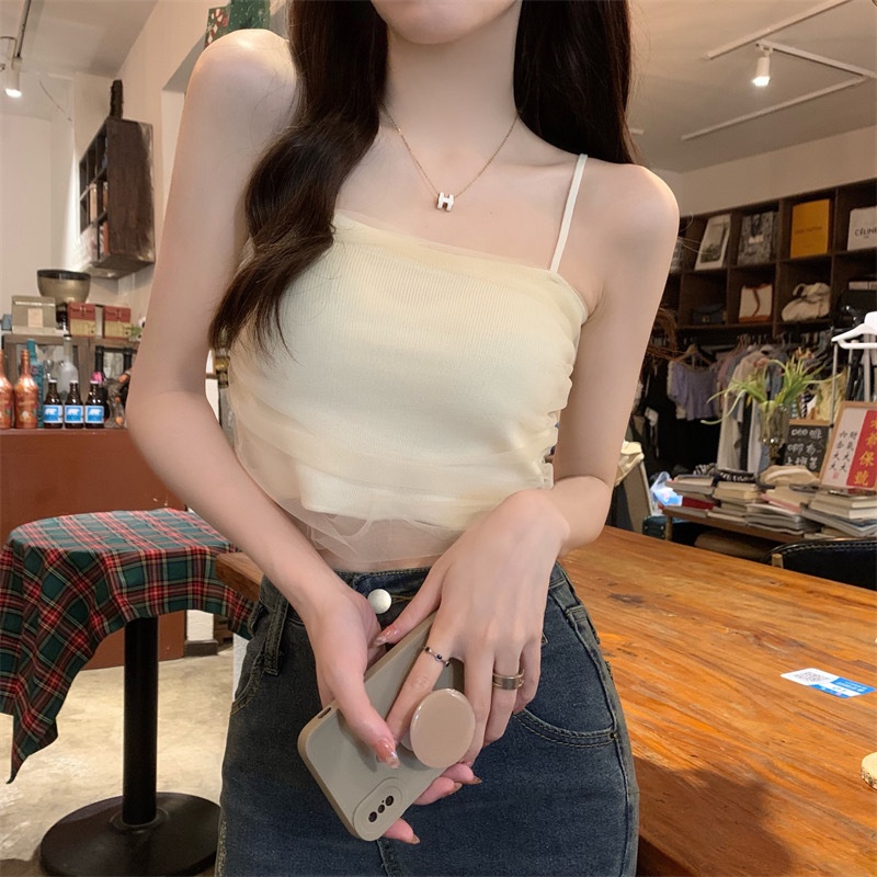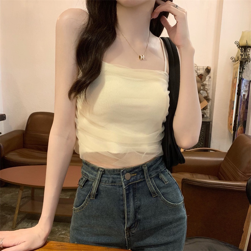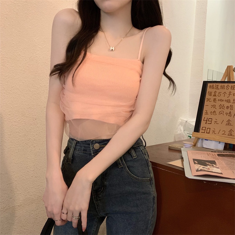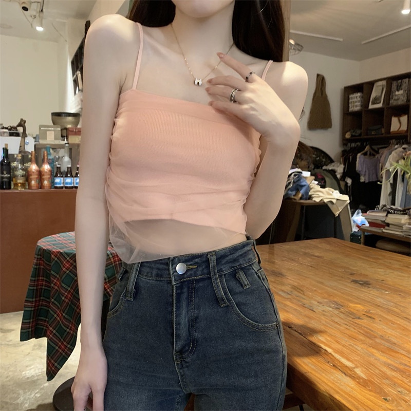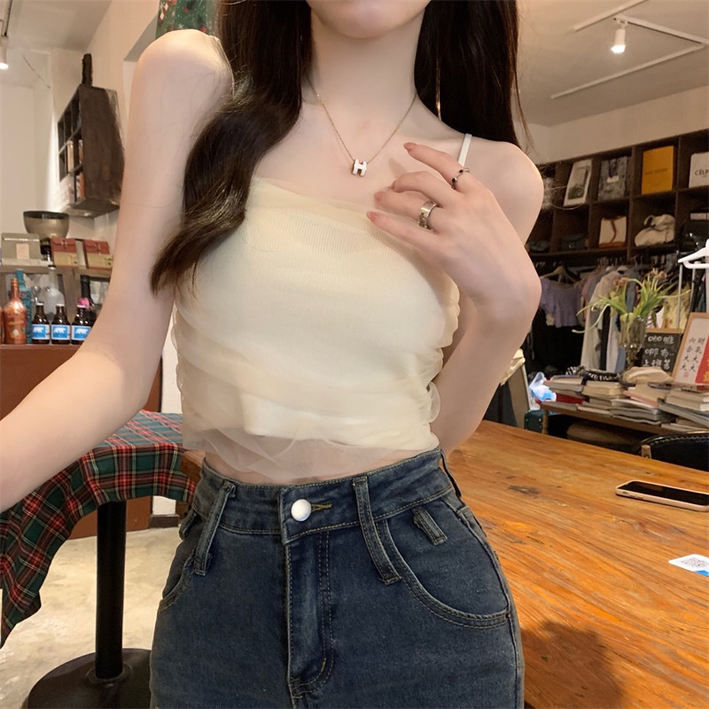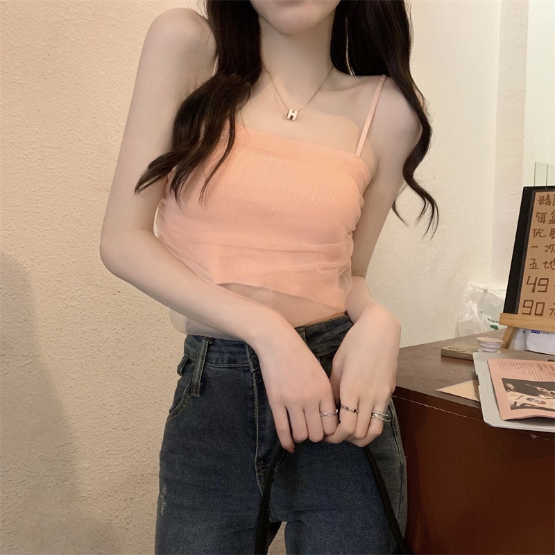 2023夏季新款韩风设计感网纱两层清新背心吊带纯欲内搭上衣薄女