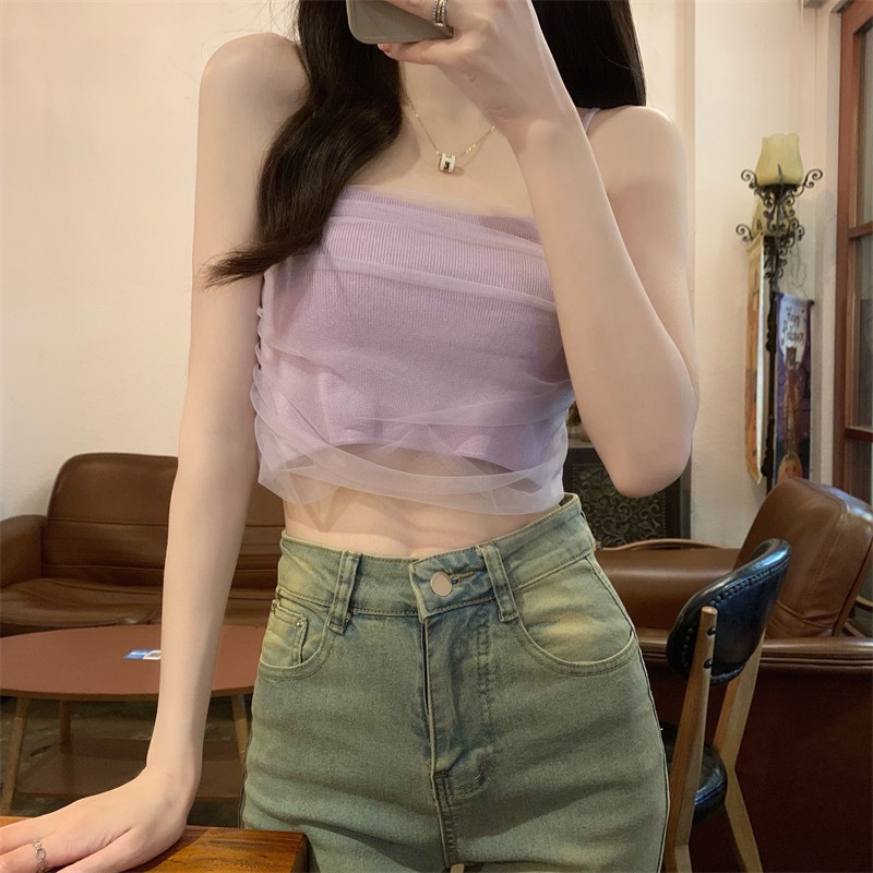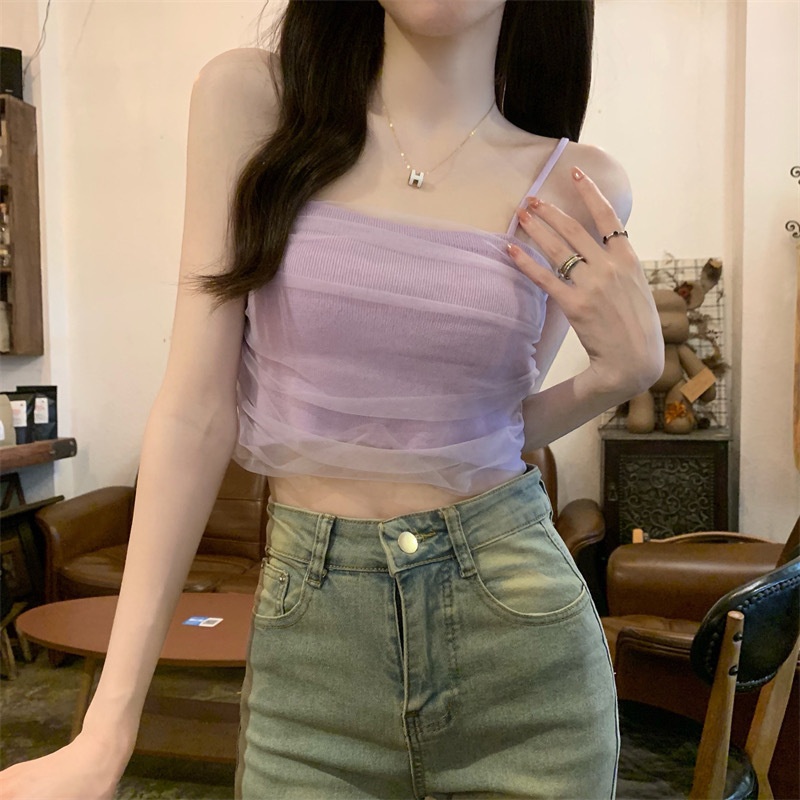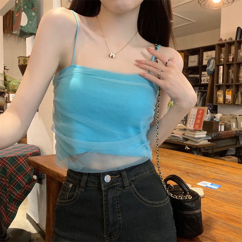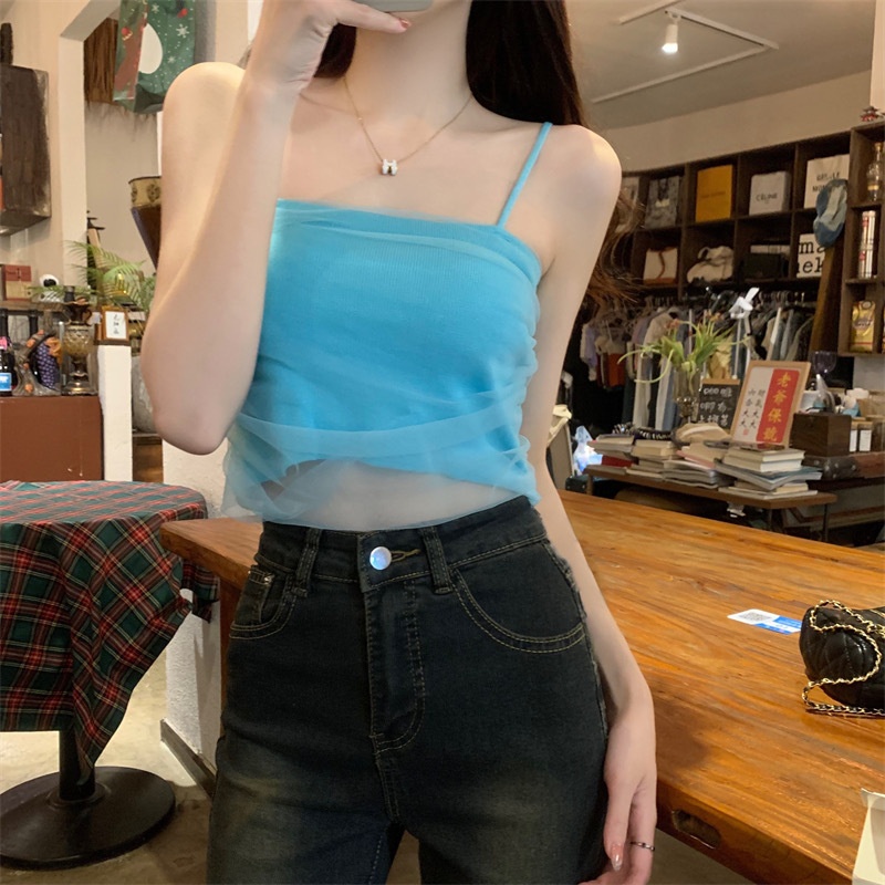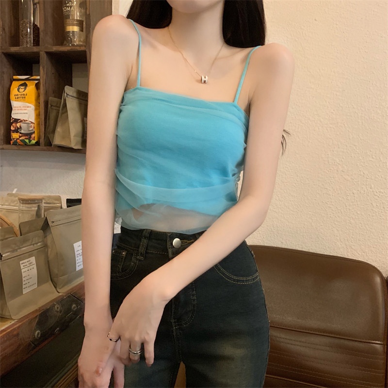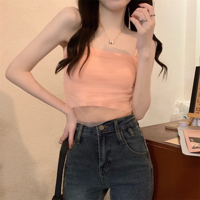 2023夏季新款韩风设计感网纱两层清新背心吊带纯欲内搭上衣薄女