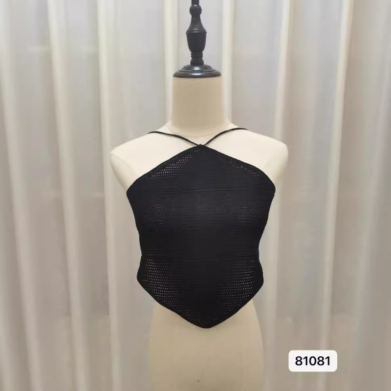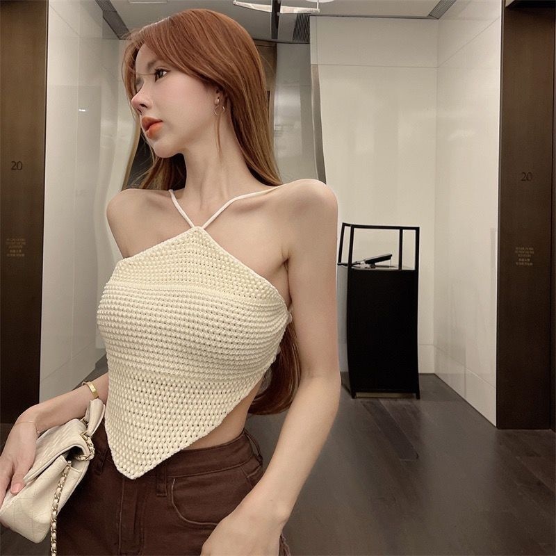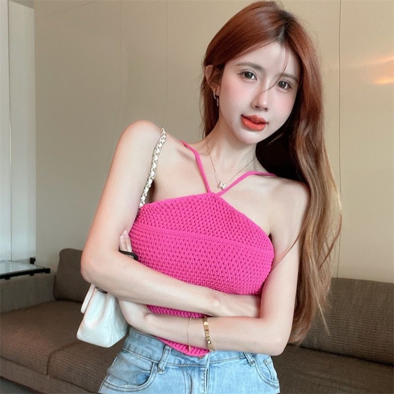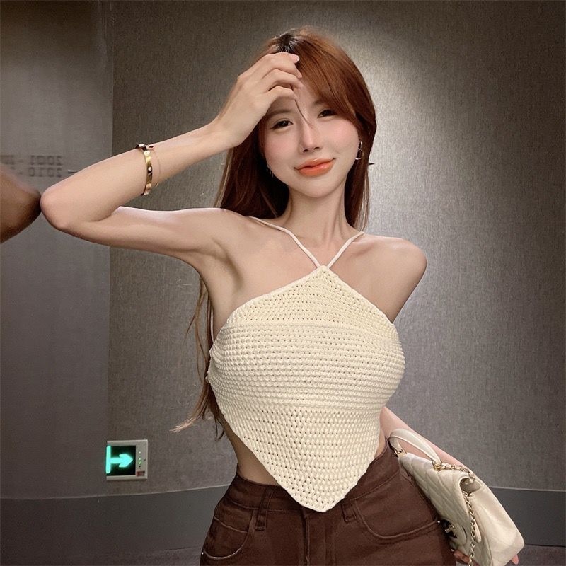 2023纯欲风性感露背系带镂空辣妹修身针织吊带背心挂脖短款上衣女