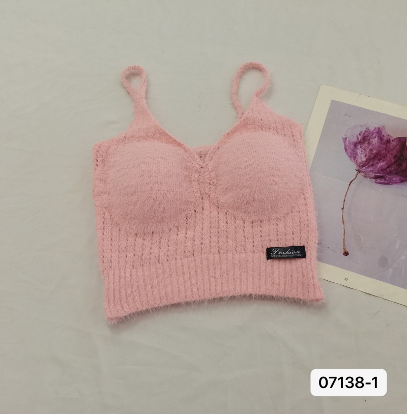 2023夏季新款少女丝V领甜美性感辣妹 软糯毛毛带胸垫吊带上衣女潮