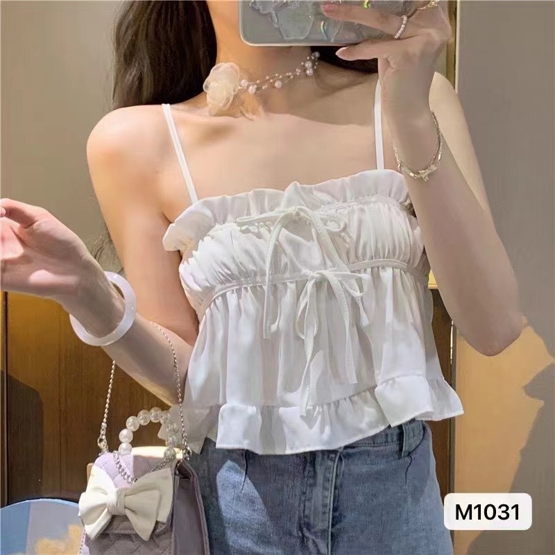 2023夏季新款设计感甜辣女孩木耳边褶皱抹胸吊带短款上衣外穿内搭