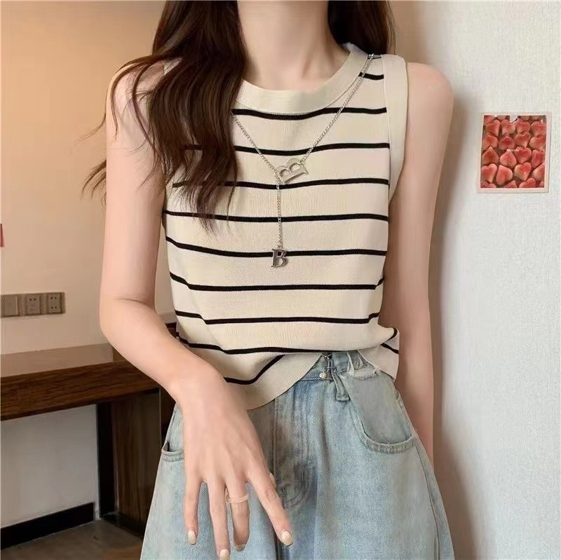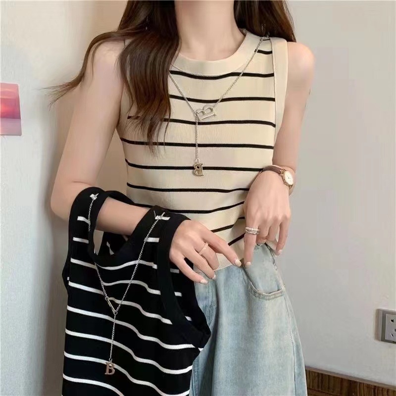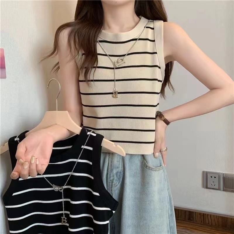 圆领无袖条纹针织背心女夏季新款修身显瘦小个子甜美链条上衣跨境
