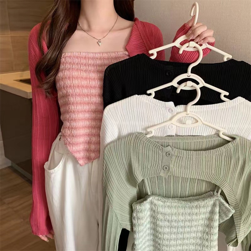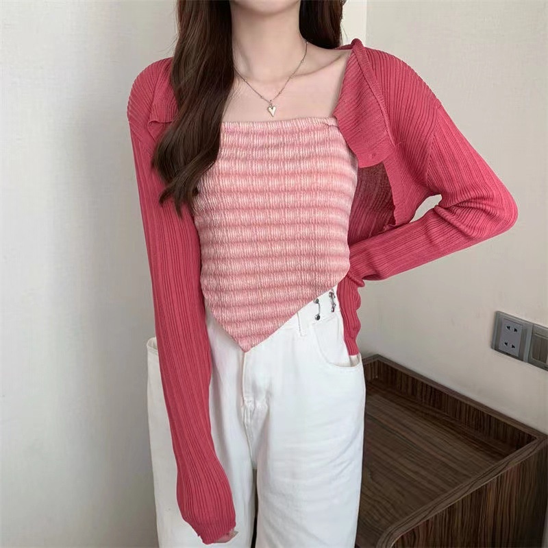 新款吊带背心三角巾百搭长袖针织开衫小外套罩衫学生显瘦上衣套装