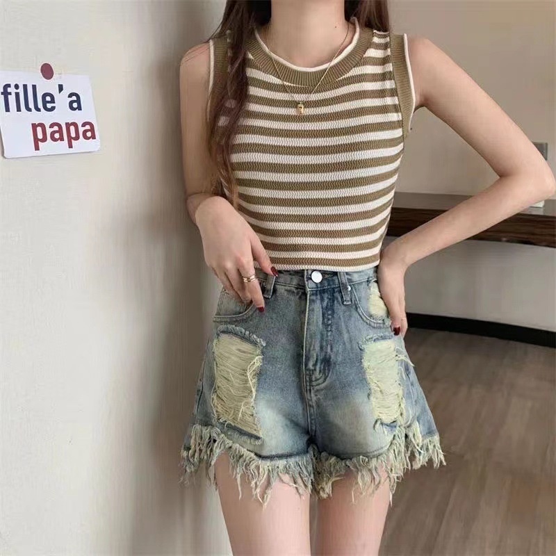 条纹无袖针织女夏季外穿百搭显瘦短款背心小个子修身甜美可爱上衣