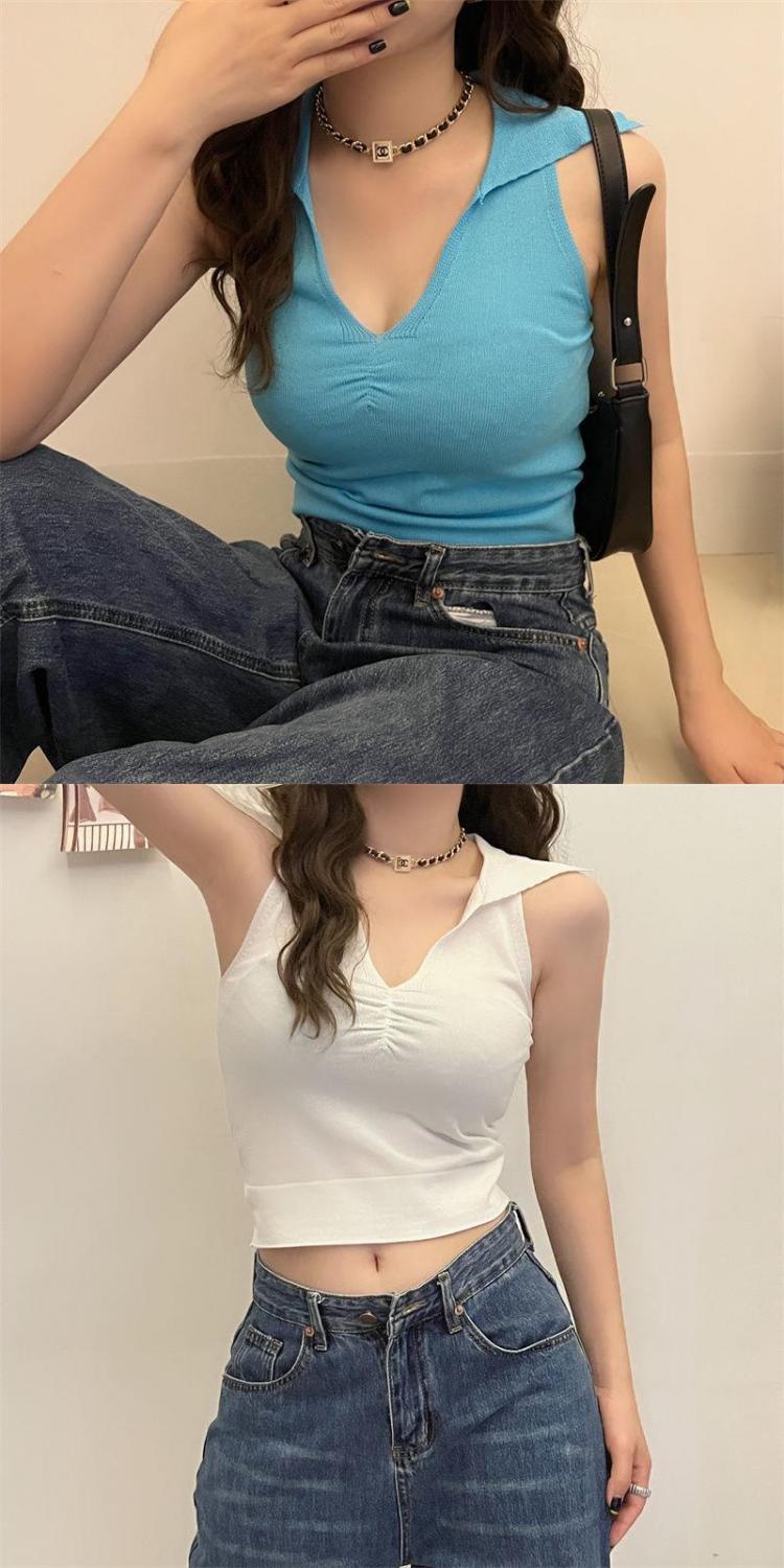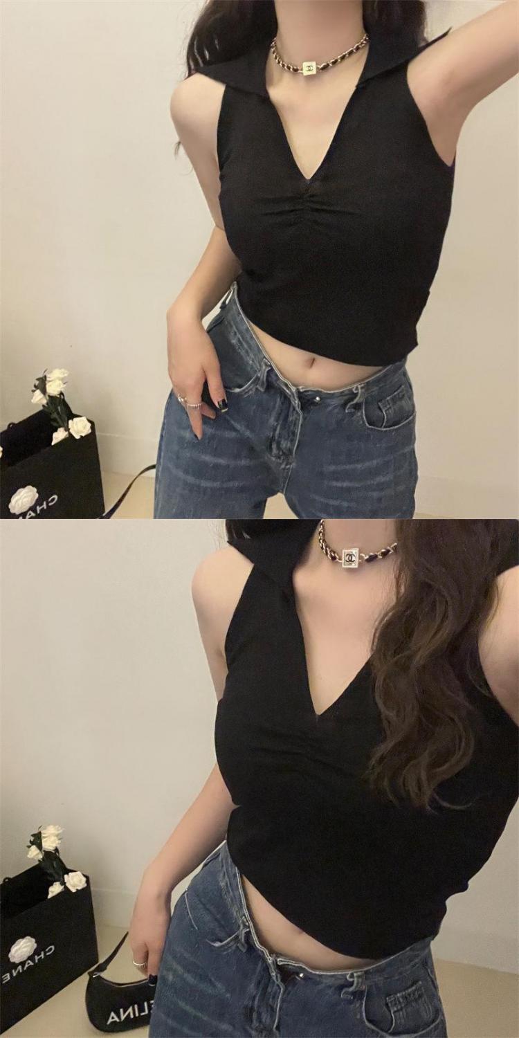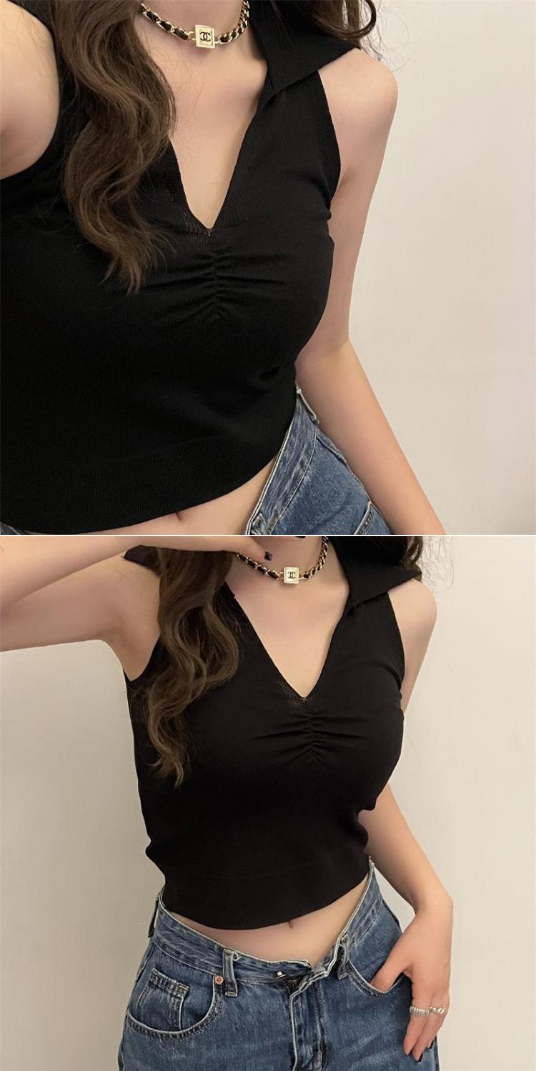 2022新款辣妹上衣性感别致褶皱百搭背心女夏季V领无袖韩版针织衫
