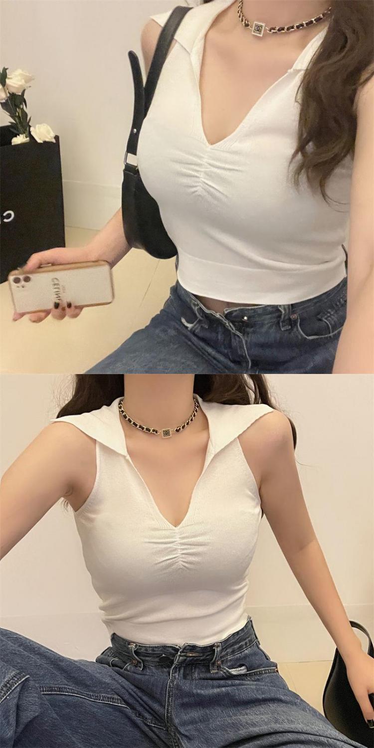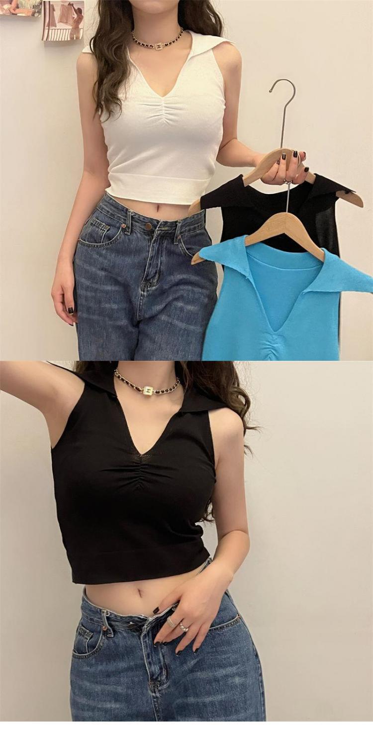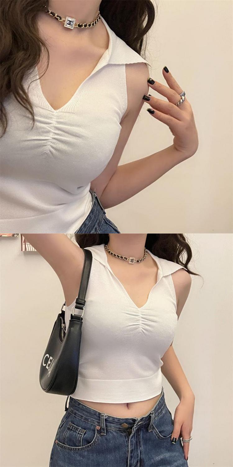 2022新款辣妹上衣性感别致褶皱百搭背心女夏季V领无袖韩版针织衫