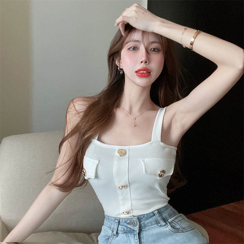 夏季新款纯欲字母纽扣小背心内搭打底吊带衫抹胸短款辣妹无袖上衣