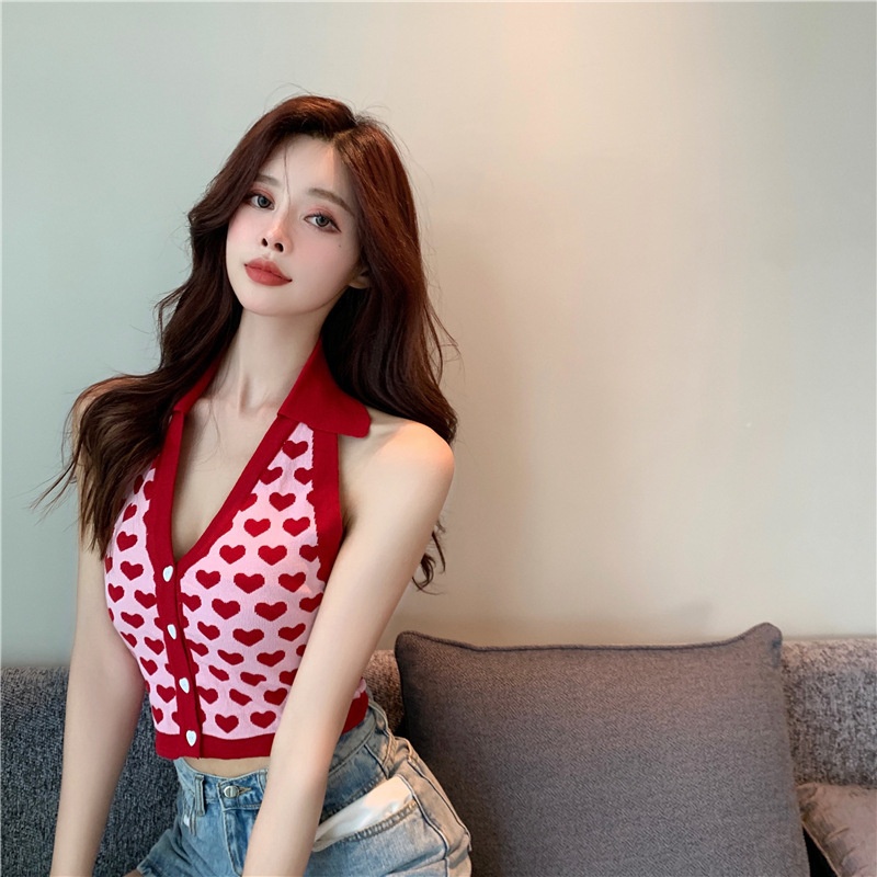 夏季新款辣妹性感chic复古挂脖爱心针织吊带上衣冰丝短款小背心潮