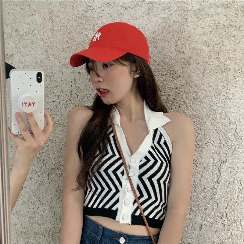 夏季短款纯色法式针织薄款挂脖吊带性感辣妹外穿露背加工定制上衣